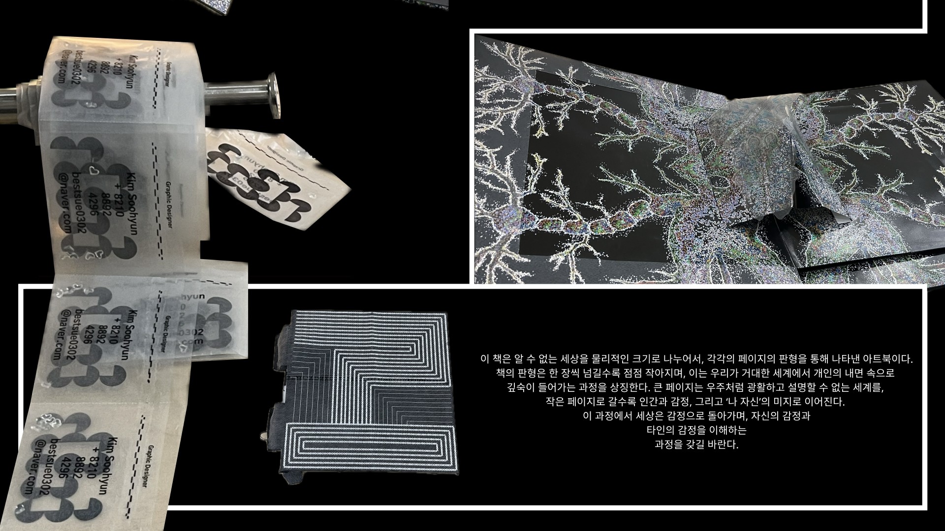 우리는 모두, 각자의 우주를 품고 살아간다. 눈에 보이지 않는 거대한 질서 속에서, 인간은 자신이 얼마나 작은 존재인지 깨닫지만, 그 작음 속에도 또 하나의 무한한 세계가 숨어 있다. 이 책은 그러한 ‘기묘함’을 탐사하는 여정이다. 모든 것은 연결되어 있고, 닮아 있으며, 동시에 다르다. 나는 그 불확실함 속에 매력을 느낀다. 이 작업은 그 불완전한 아름다움을 기록한 책이다. 종이 위에서의 다양한 체험을 통해 각자의 생각이 움직이고, 숨 쉬며, 관찰자의 시선에 따라 달라진다. 이 책을 마주한 당신 또한 자신의 알 수 없는 우주를 탐구할 수 있길 바란다.