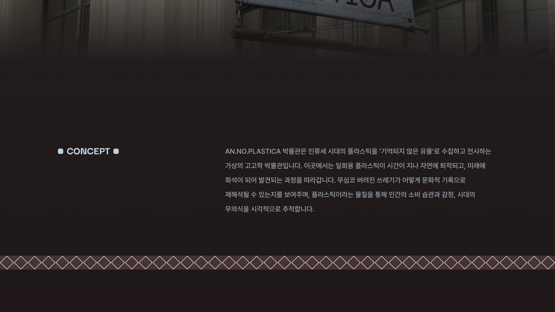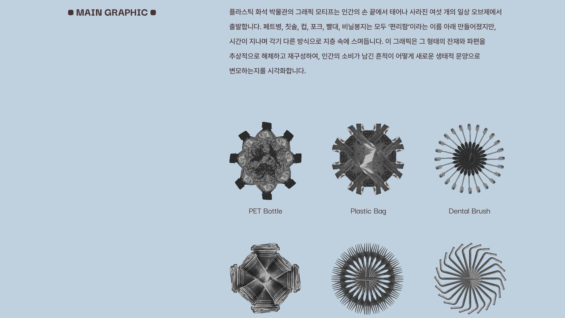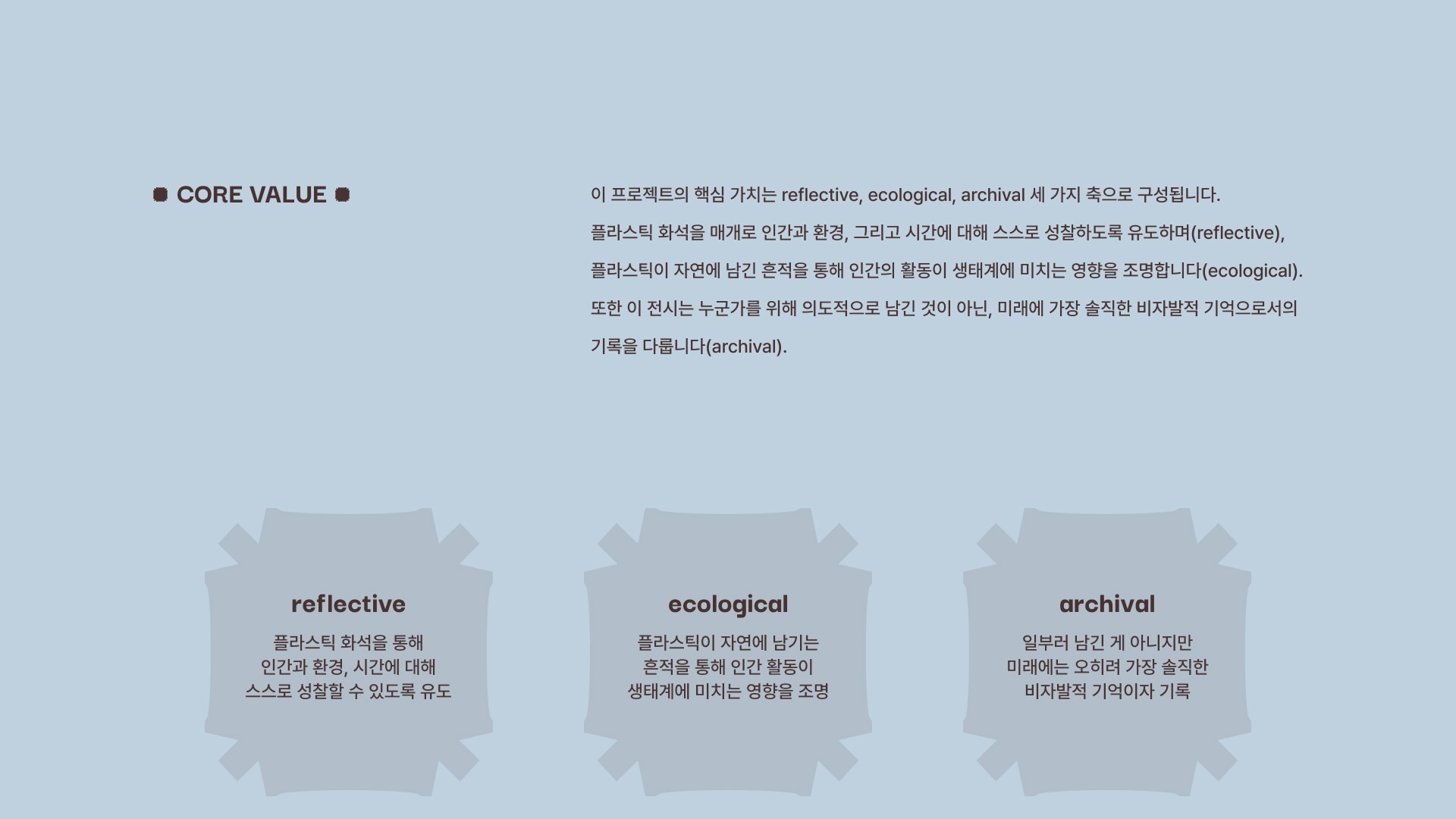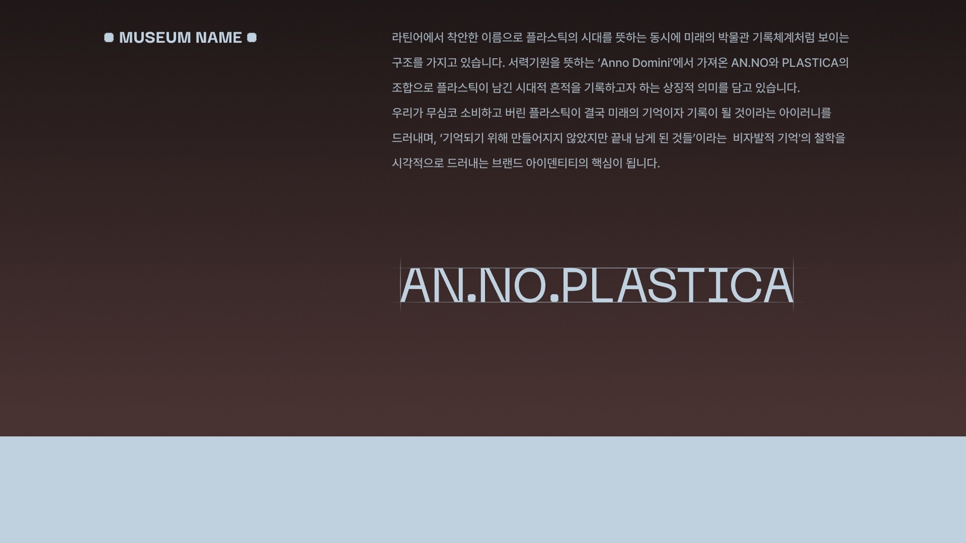 AN.NO.PLASTICA는 인류세 시대의 플라스틱을 기억되지 않은 유물로 바라보며, 미래 시점에서 플라스틱 폐기물이 어떻게 화석이 되어 해석될지를 시각화하는 아카이빙 프로젝트입니다. 우리가 무심코 버린 일회용 플라스틱은 지층에 퇴적되어 비자발적 기억으로 남게 됩니다. 이 프로젝트는 플라스틱을 단순한 쓰레기가 아닌, 인간의 소비와 감정, 시간의 흔적이 담긴 문화적 기록으로 재해석합니다. 가상의 박물관 전시를 통해 플라스틱 화석이라는 아이러니를 체감하게 되며, 우리가 남긴 흔적이 결국 무엇이 될 것인지 스스로 질문하게 됩니다.