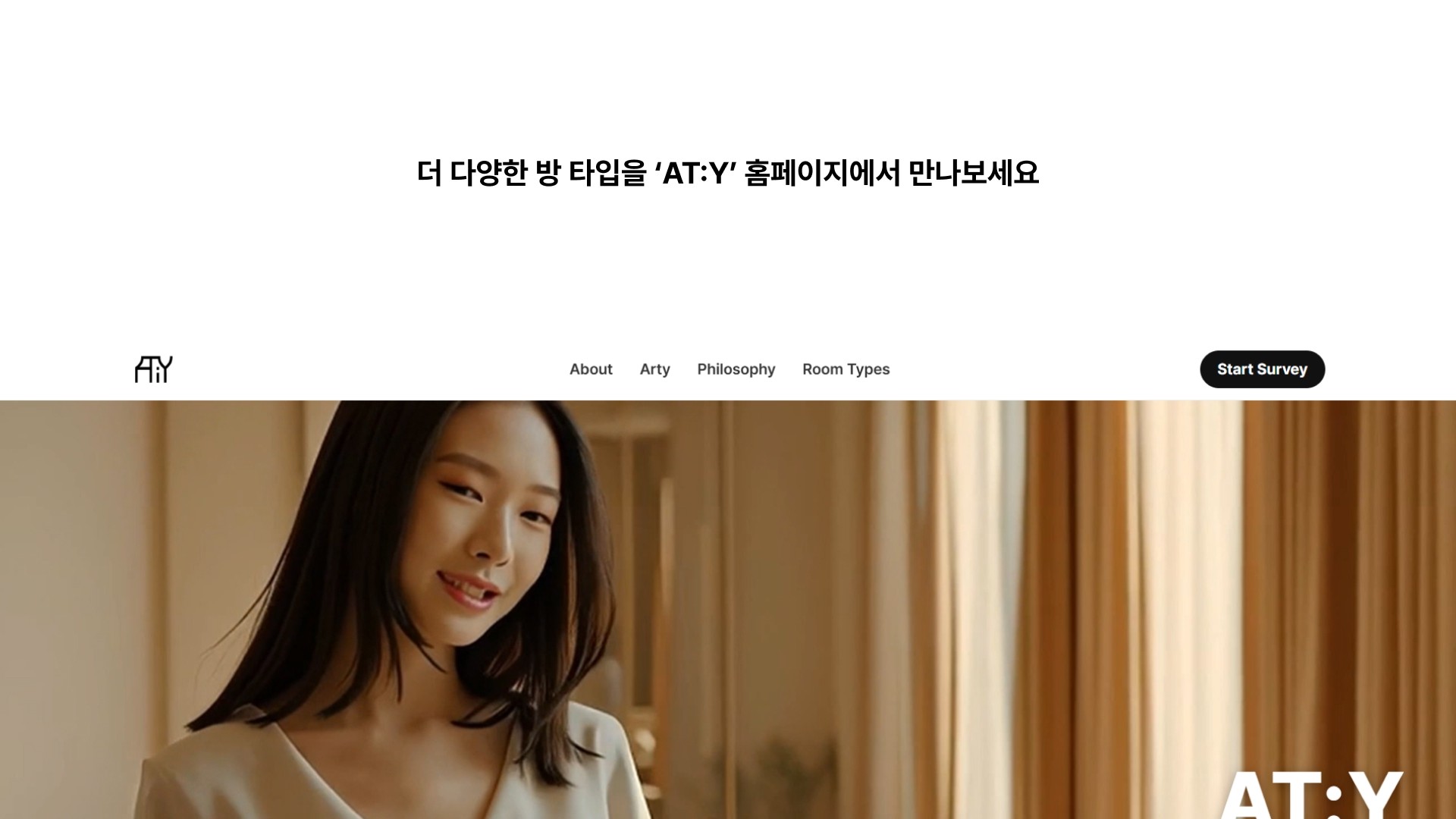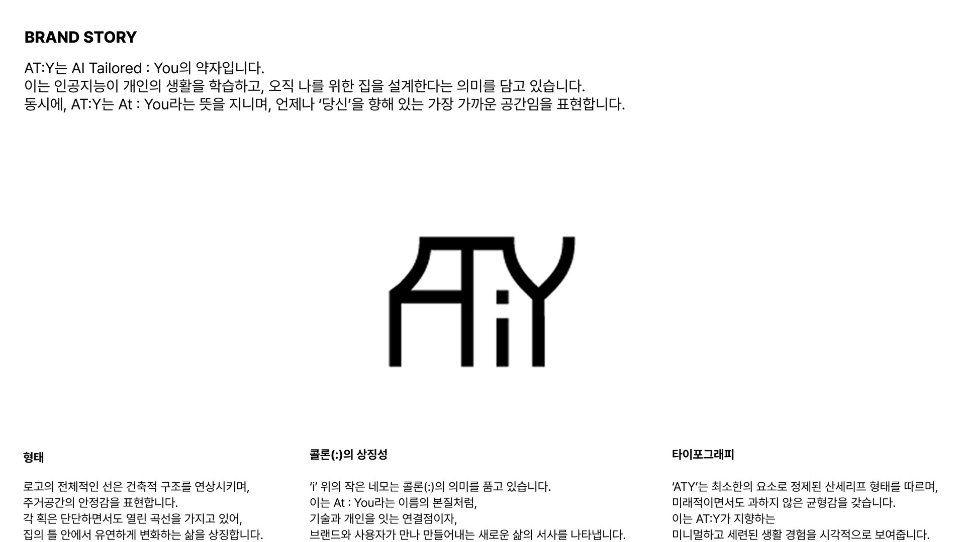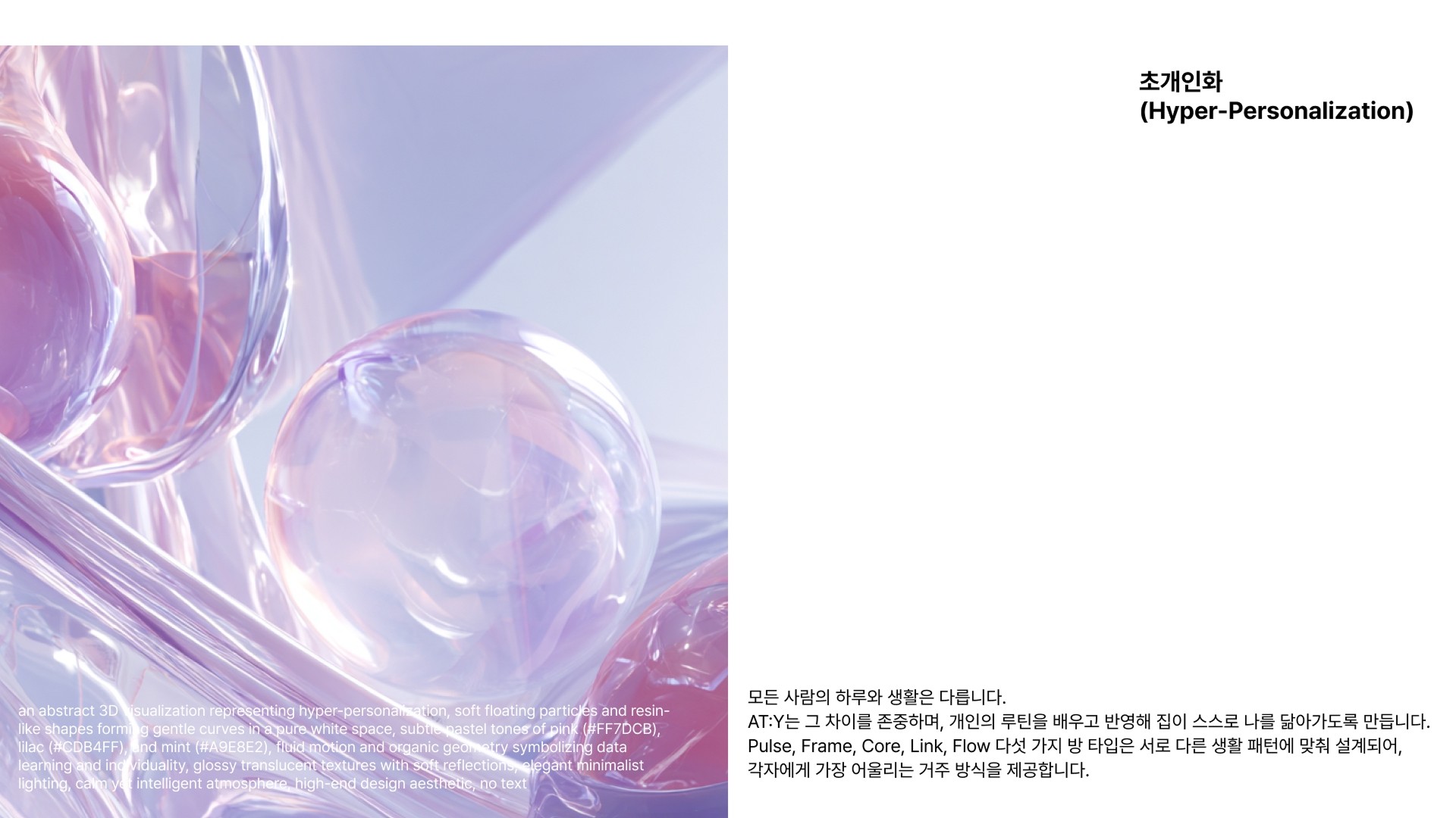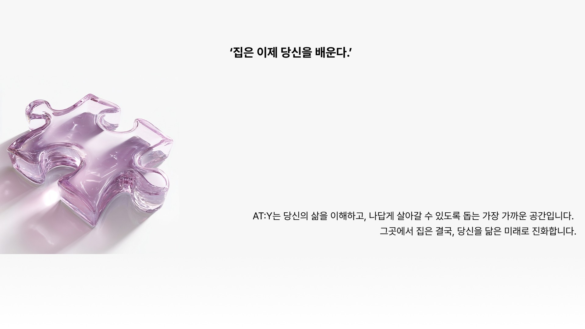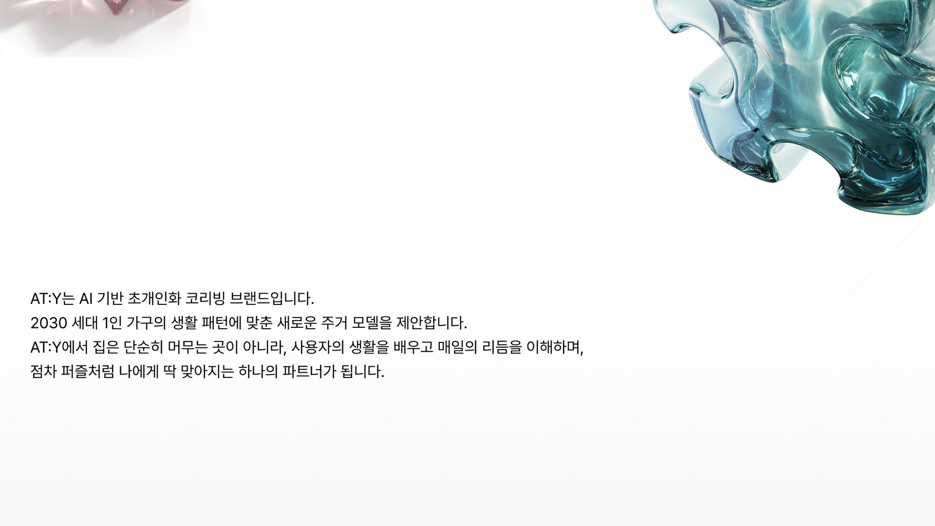 “집은 이제 당신을 배운다.” AT:Y는 AI 기반 초개인화 코리빙 브랜드로, 2030 세대 1인 가구의 생활 패턴과 취향에 맞춘 새로운 주거 방식을 제안합니다. 이제 집은 단순한 거주 공간이 아니라, AI가 나의 루틴을 분석해 변화하며, 오직 나에게 최적화된 환경을 만들어주는 존재입니다. AT:Y와 함께 나를 이해하는 집, 나답게 살아가는 삶을 경험해 보세요.