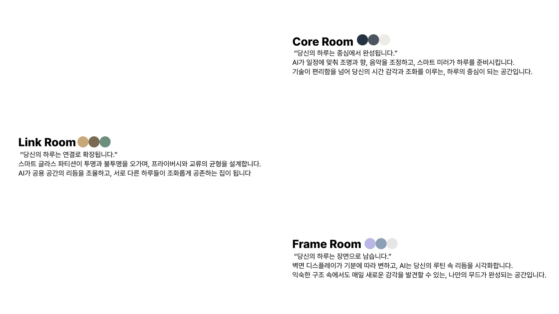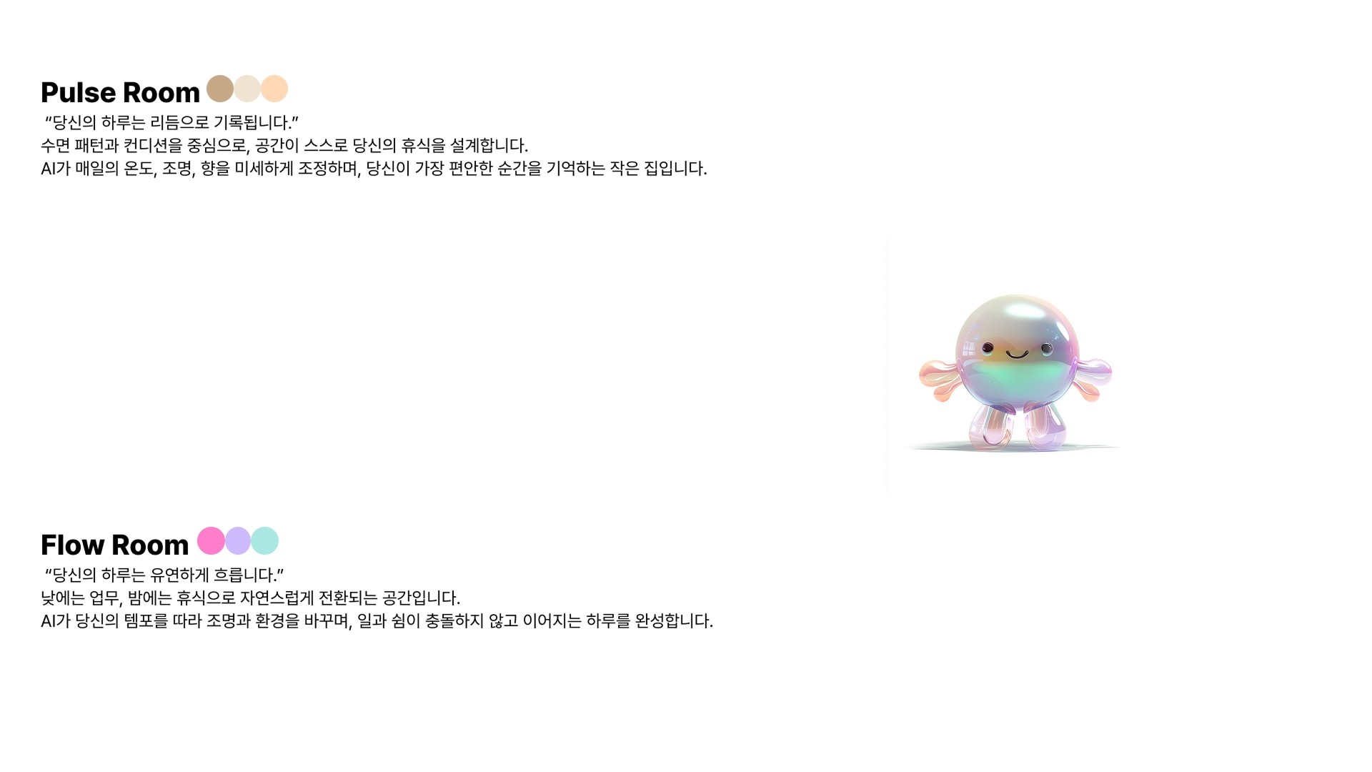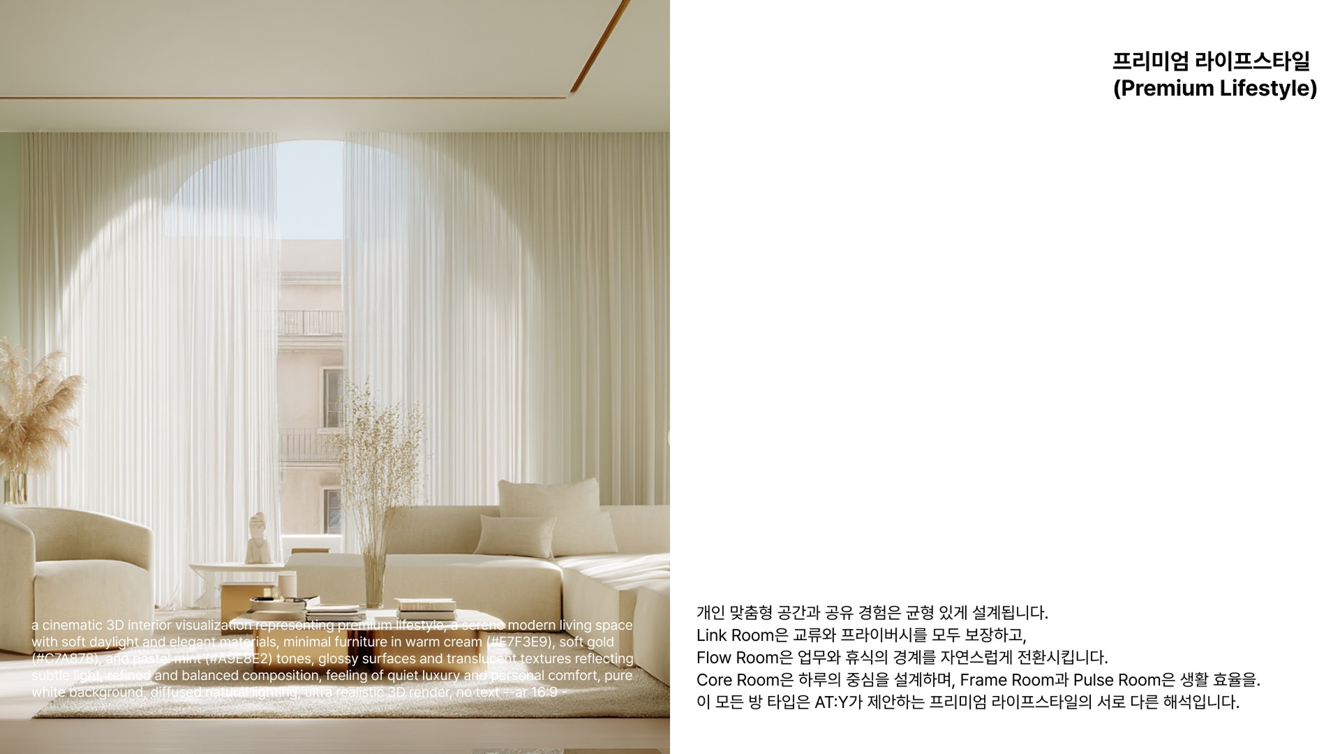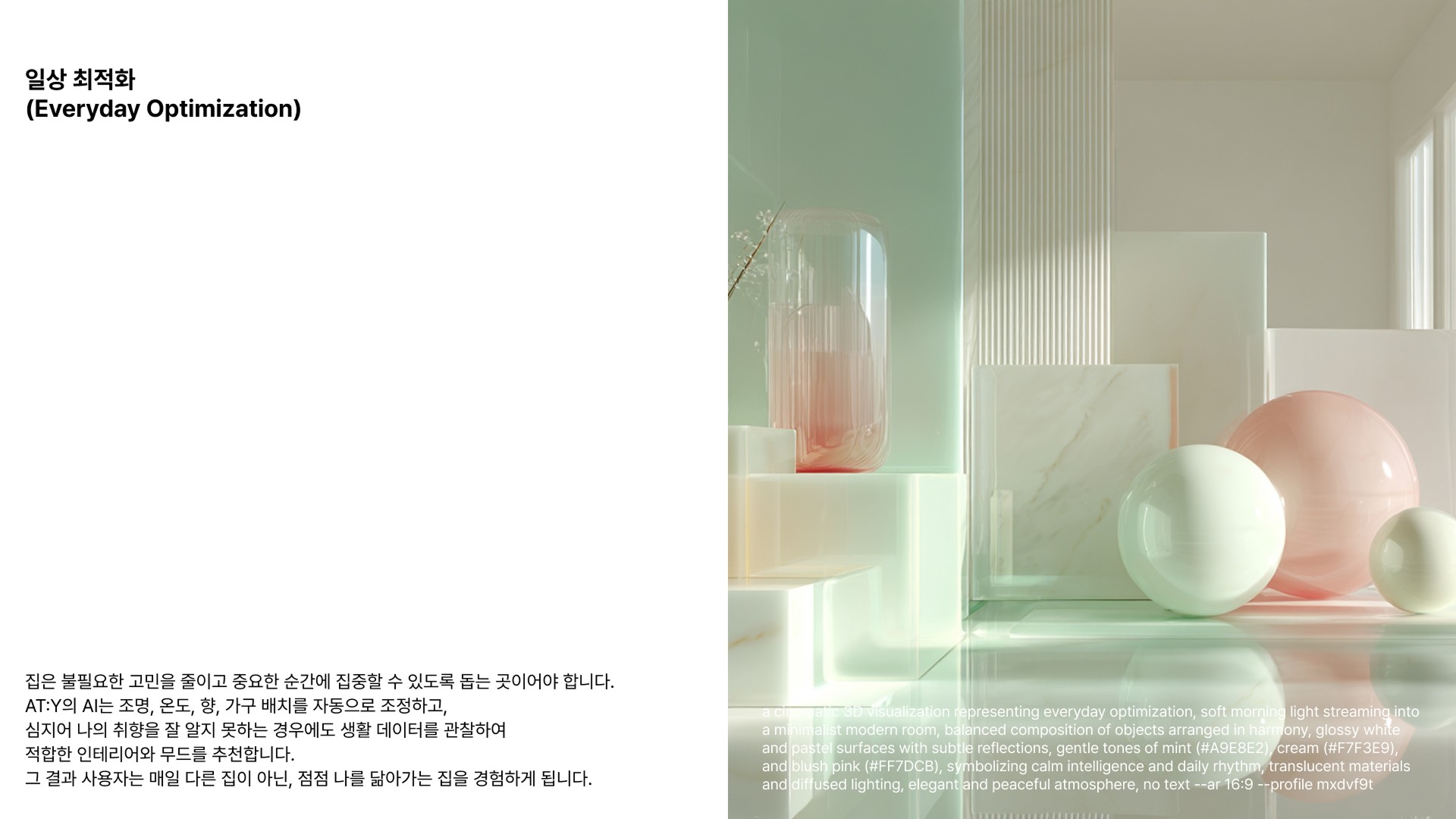 "Home now learns you." AT:Y is an AI-powered ultra-personalized coribing brand that proposes a new way of living to suit the lifestyle and tastes of single-person households in their 20s and 30s. Now, home is not just a living space, but an AI that analyzes my routines and changes, and only creates an environment that is optimized for me. Experience life as yourself, a home that understands me with AT:Y