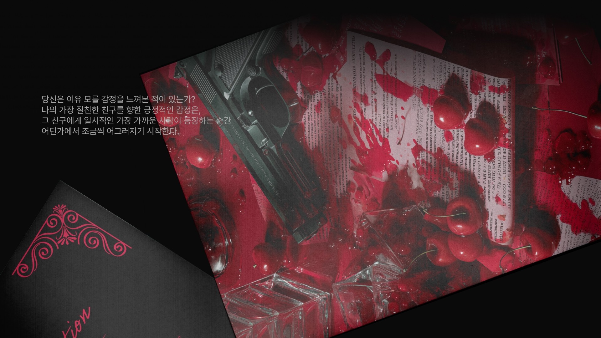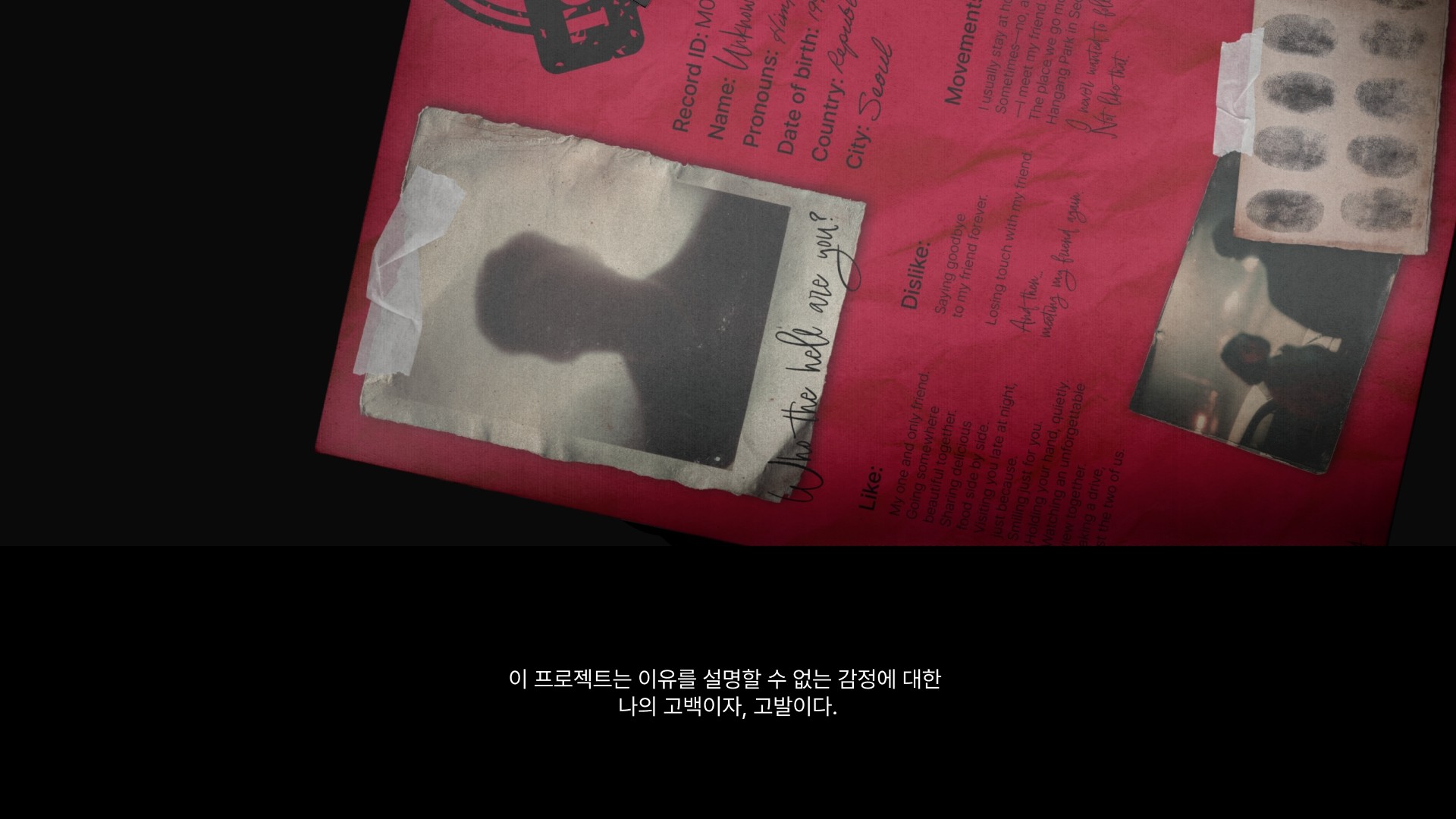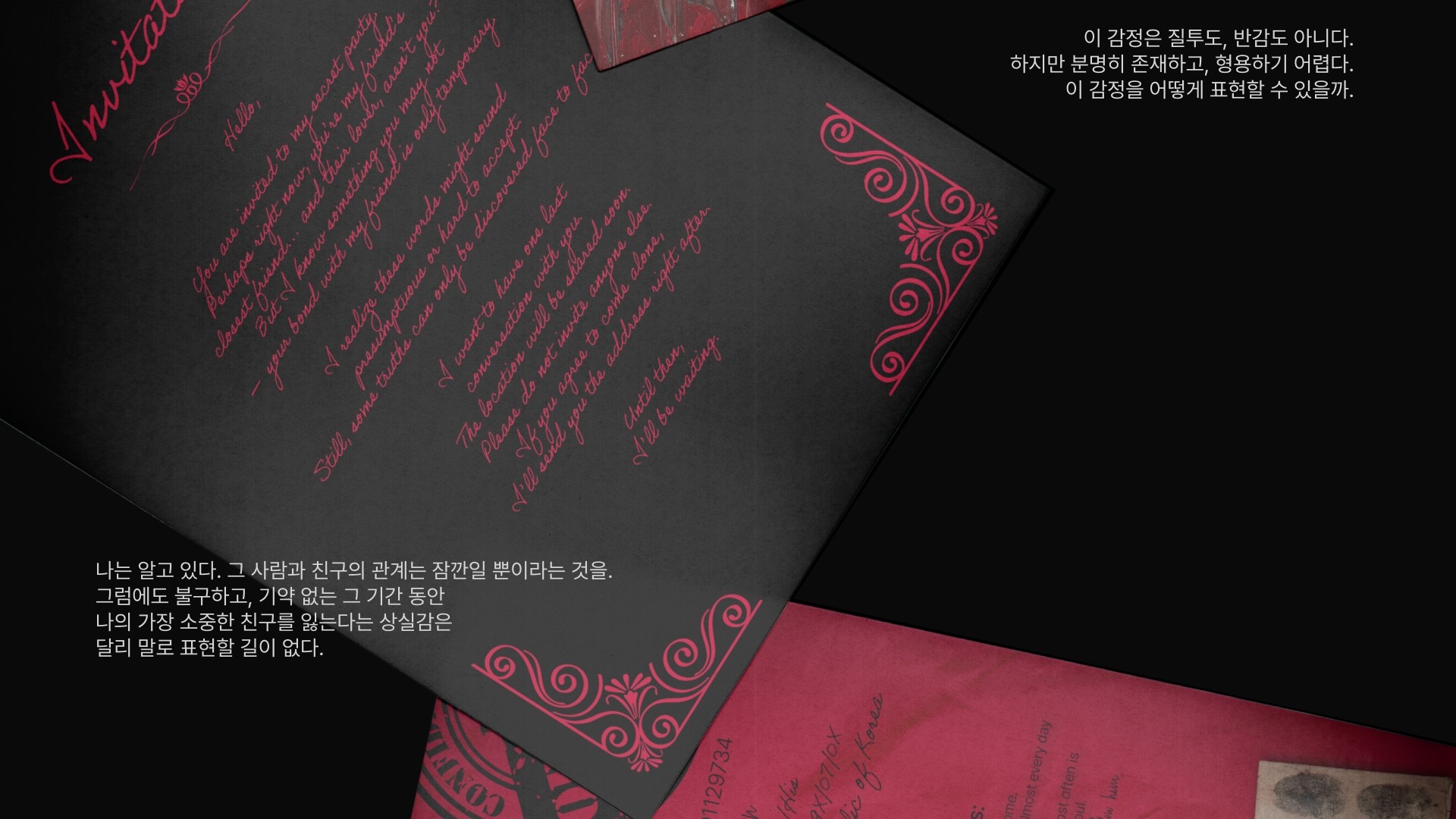 당신은 이유 모를 감정을 느껴본 적이 있는가? 나의 가장 절친한 친구를 향한 긍정적인 감정은, 그 친구에게 일시적인 가장 가까운 사람이 등장하는 순간 어딘가에서 조금씩 어그러지기 시작한다. 이 감정은 질투도, 반감도 아니다. 하지만 분명히 존재하고, 형용하기 어렵다. 이 감정을 어떻게 표현할 수 있을까. 나는 알고 있다. 그 사람과 친구의 관계는 잠깐일 뿐이라는 것을. 그럼에도 불구하고, 기약 없는 그 기간 동안 나의 가장 소중한 친구를 잃는다는 상실감은 달리 말로 표현할 길이 없다. 이 프로젝트는 이유를 설명할 수 없는 감정에 대한 나의 고백이자, 고발이다.