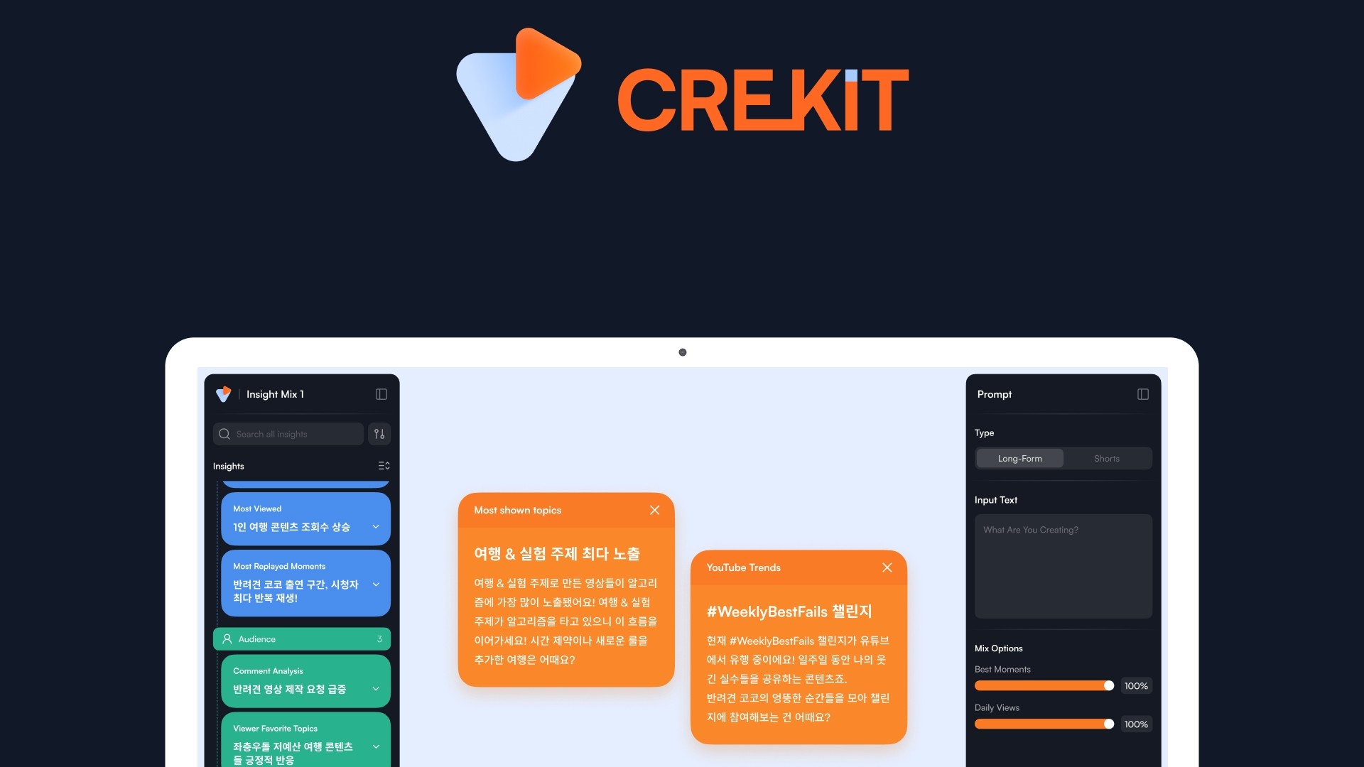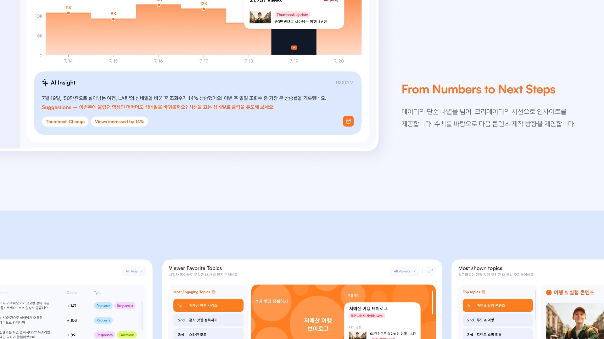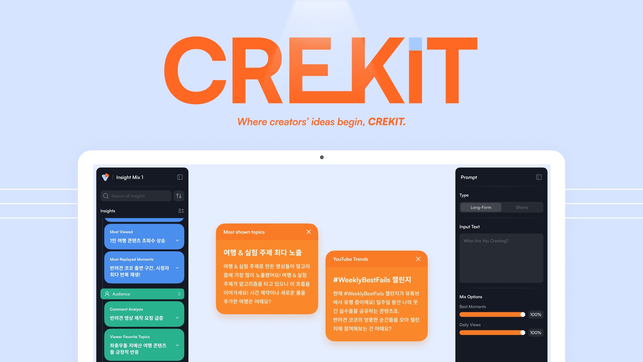 As the creator economy grows, YouTubing has become a legitimate career. Yet existing YouTube analytics tools only provide raw numbers—leaving creators on their own to come up with content ideas. CREKIT bridges this gap between data and creativity. Going beyond simple metrics, CREKIT analyzes what drives audience reactions and delivers actionable insights to guide your content strategy. Experience where data meets inspiration, and discover a new way of working as a creator.