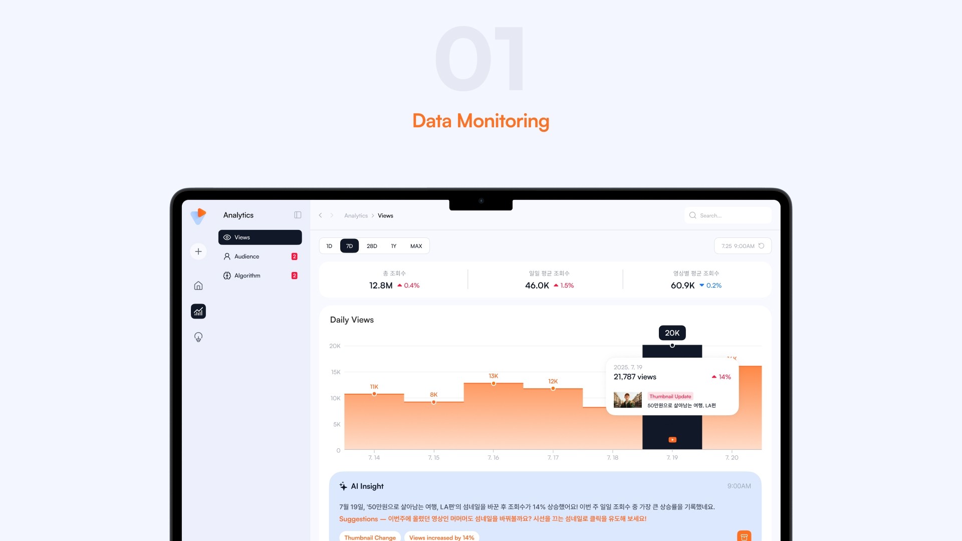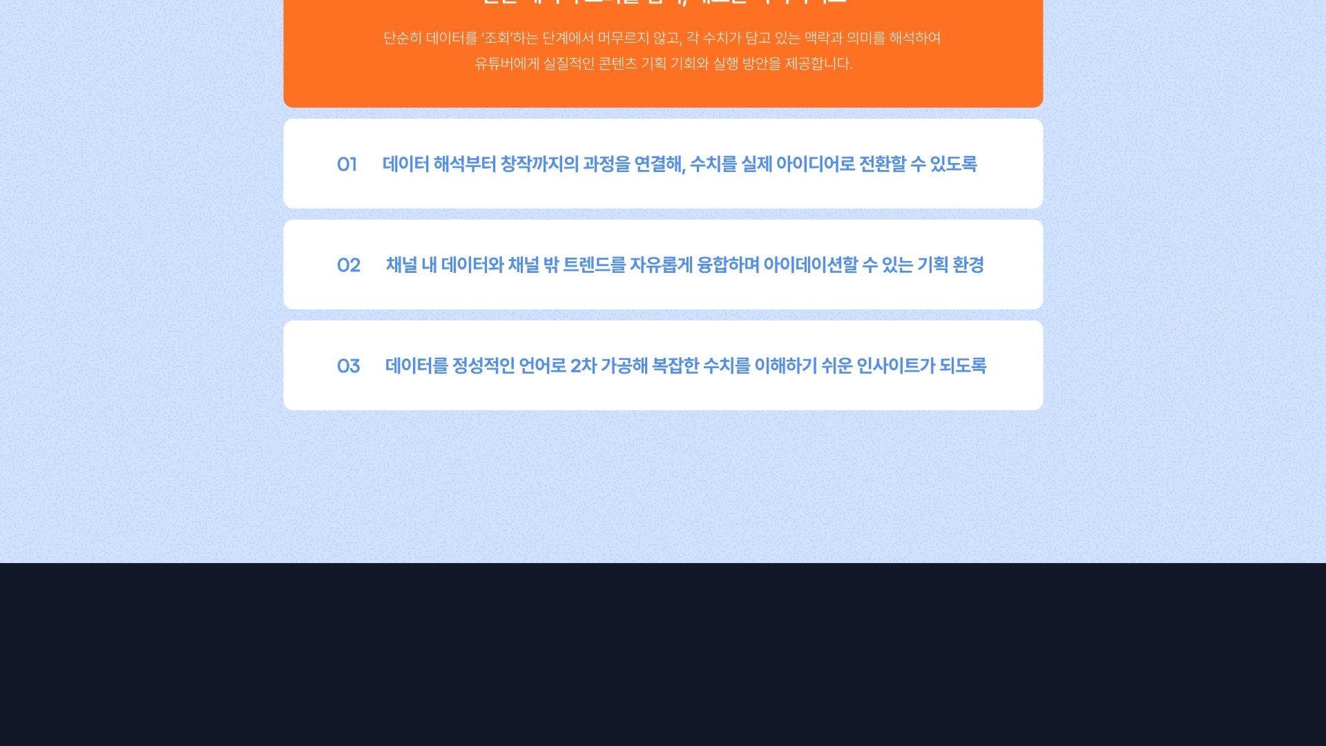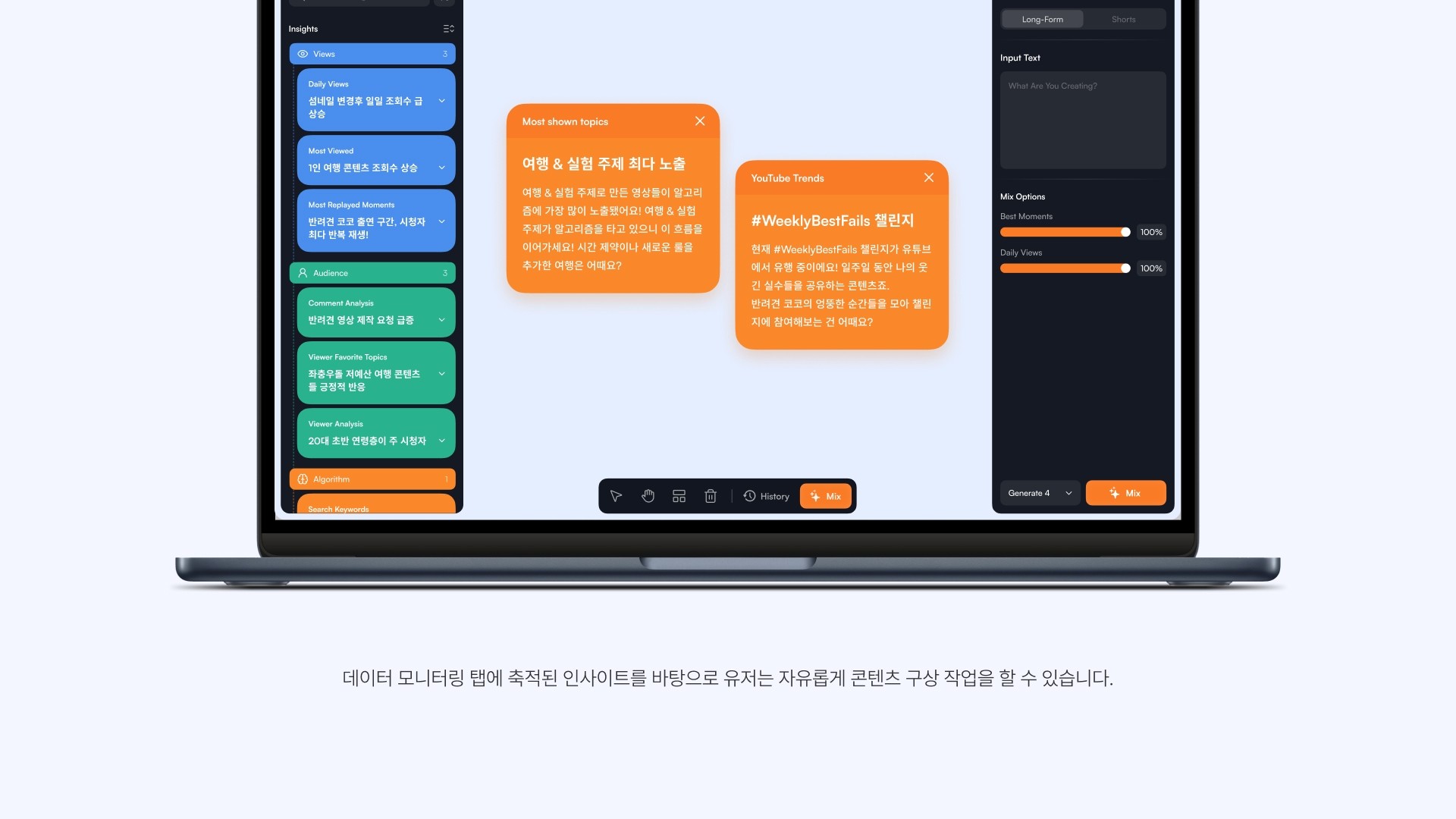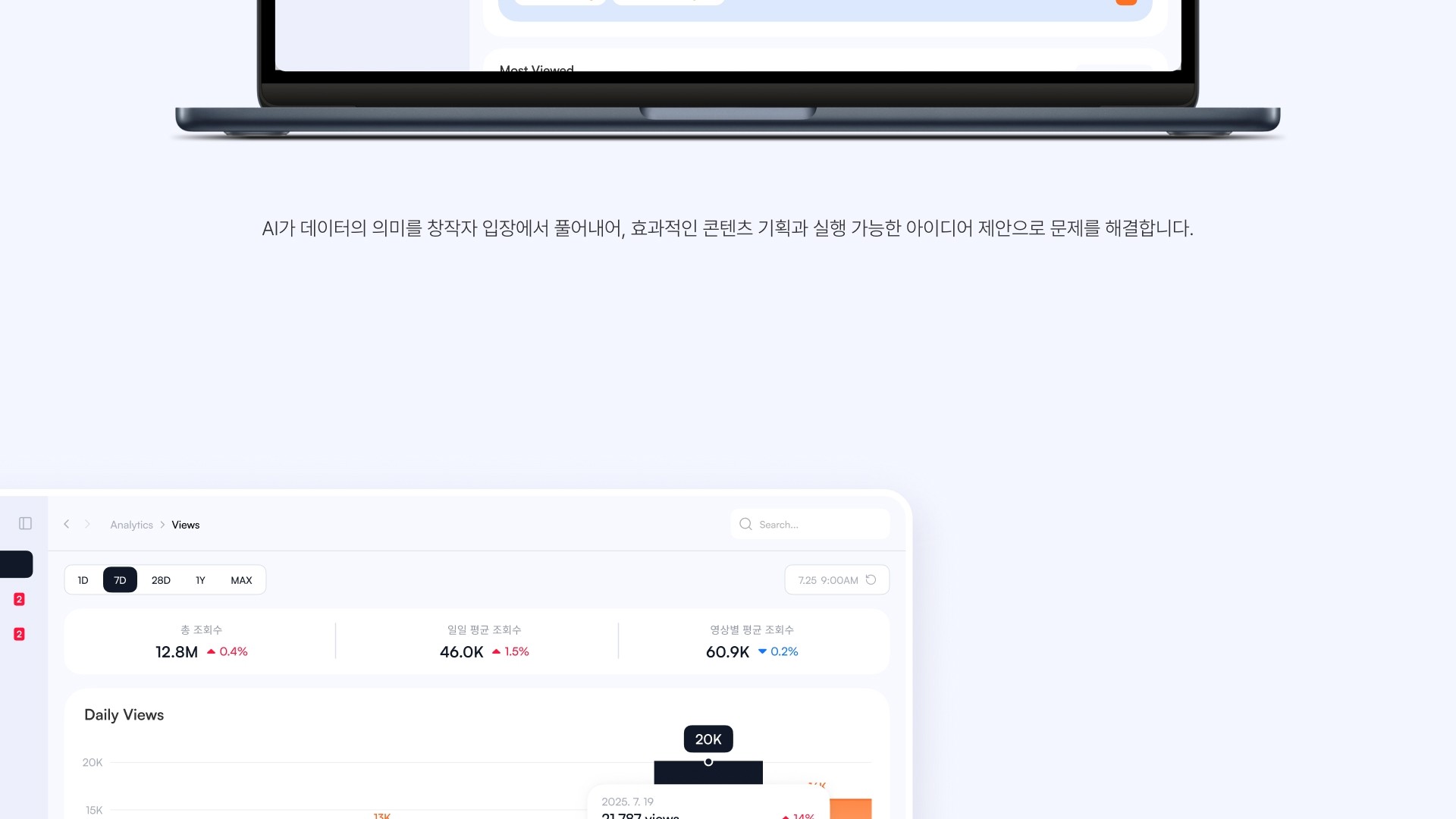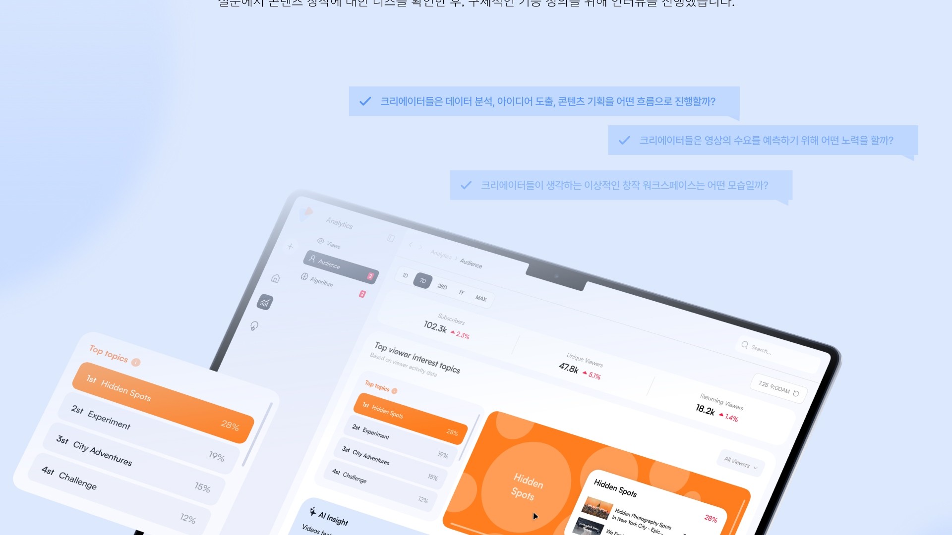 크리에이터 경제가 성장하며 유튜버는 직업으로 자리 잡았습니다. 하지만 기존 유튜브 채널 분석 툴들은 수치만 제공할 뿐, 콘텐츠 아이디어를 발굴하는 일은 온전히 유튜버의 몫입니다. CREKIT은 이러한 데이터와 창작 사이의 간극을 메워주고자 합니다. CREKIT은 단순 수치를 넘어, 영상이 특정 반응을 이끈 배경을 분석해 콘텐츠 제작 방향에 대한 인사이트를 제공합니다. 데이터와 아이디어가 융화되는 경험, 유튜버의 새로운 업무 환경을 만나보세요.
