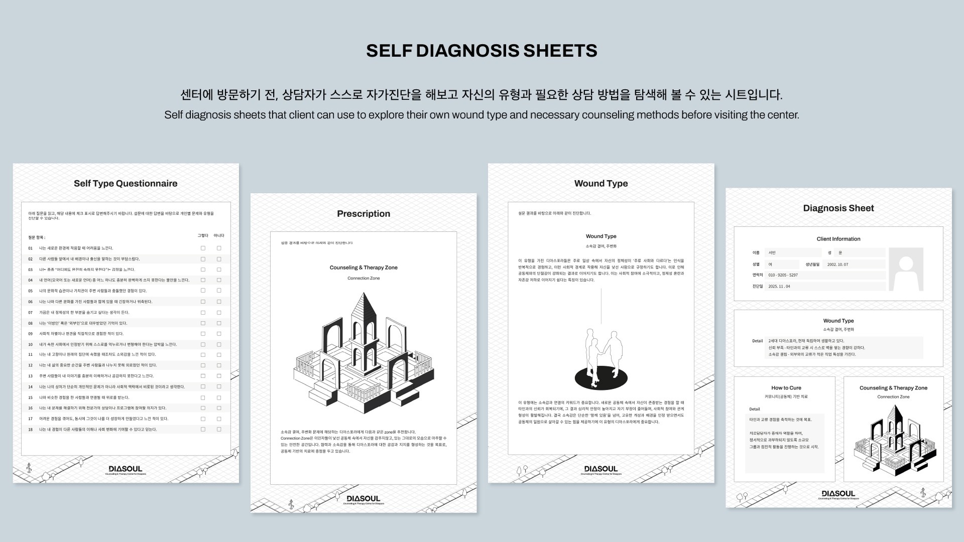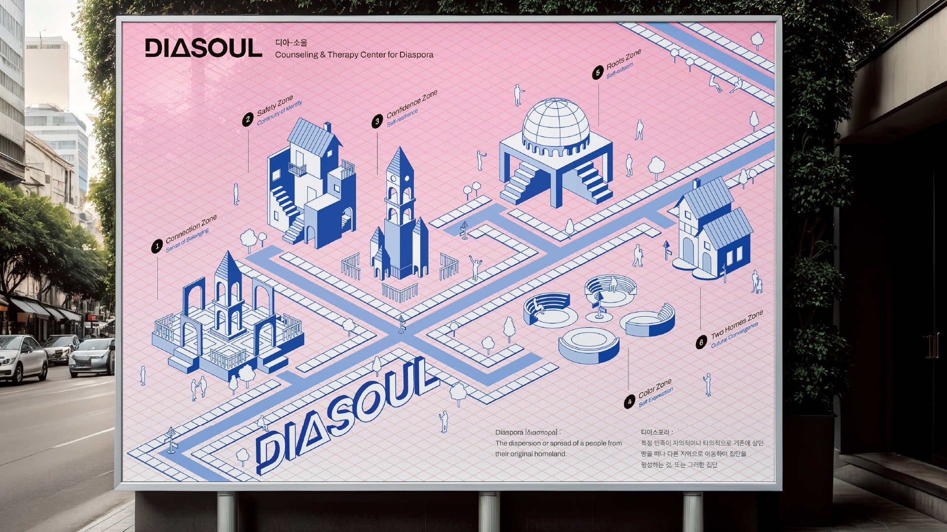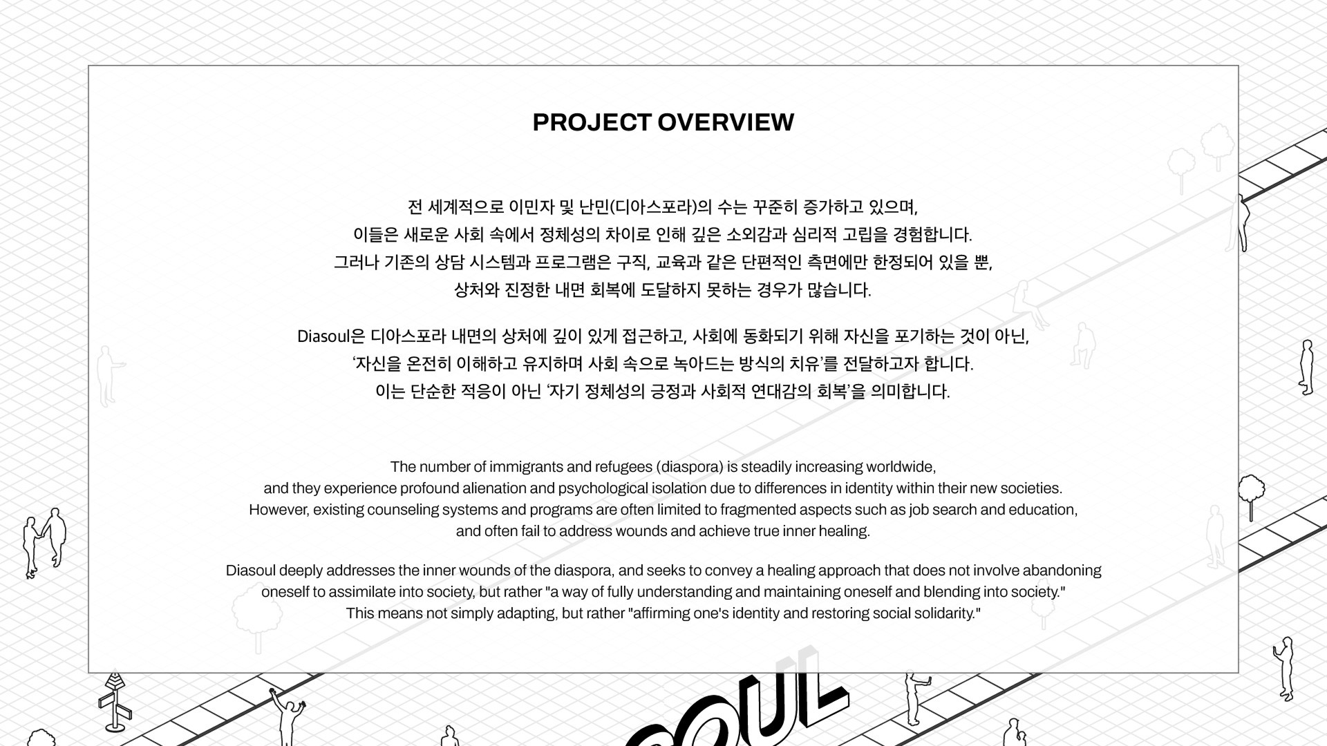The number of diaspora around the world is steadily increasing, experiencing alienation and psychological isolation due to differences in identity in a new society. However, existing counseling systems are limited to fragmentary aspects such as job search and education, not reaching wounds and true inner recovery. Diasoul, a psychological counseling therapy center for the diaspora, aims to deliver "healing in a way that fully understands and maintains oneself," rather than giving up on oneself. It aims to "positive self-identity and restoration of social solidarity," not just adaptation.