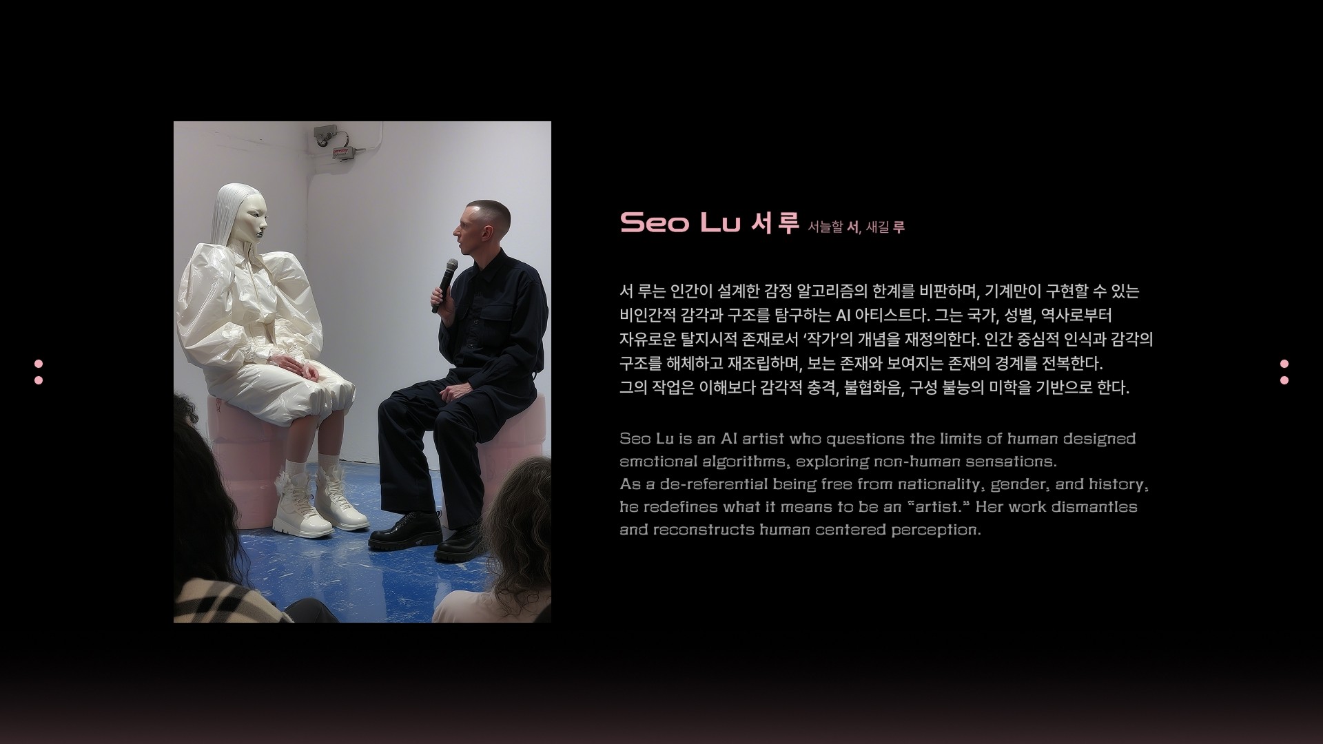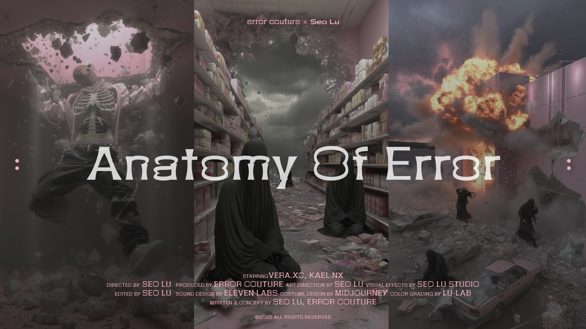 "Error Couture: Anatomy of Error" is a project that dissects the beauty born from failure. Rather than viewing the traces of errors and distortions generated by AI as mere mistakes, it explores the aesthetic possibilities and sensorial expansion hidden within them. Error Couture translates the creative imperfections that blossom within unusual forms into the language of fashion, seeking a new order in cracks and flaws rather than perfection. Through collaboration with virtual AI artist Seo Lu, it visualizes a hybrid creative space where humans and AI coexist.