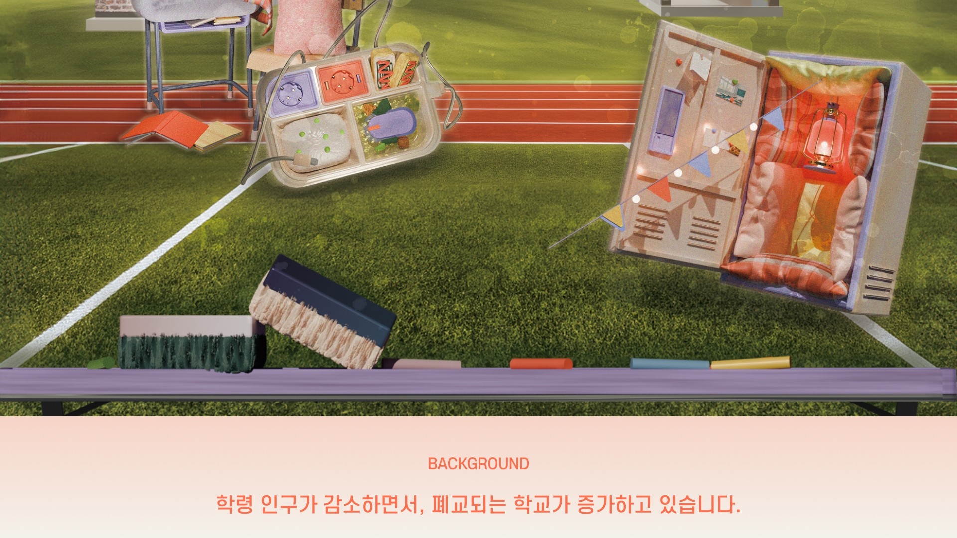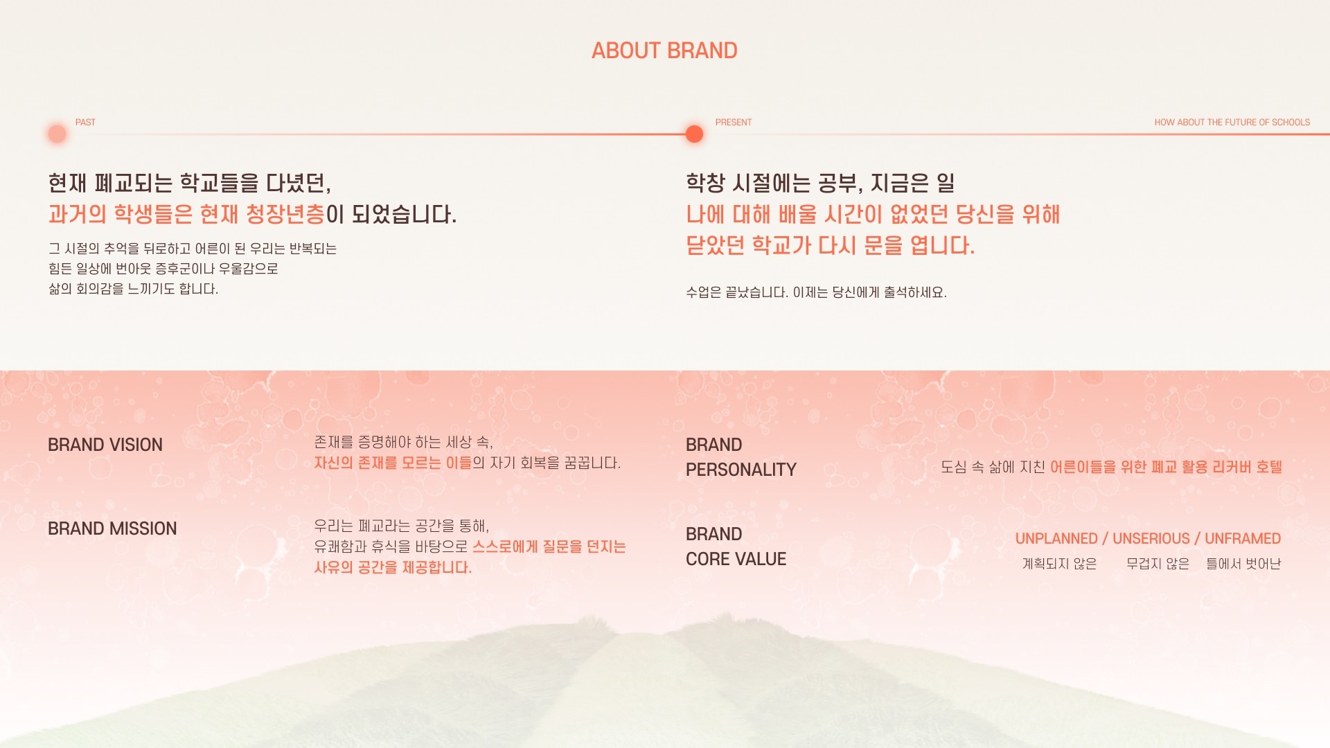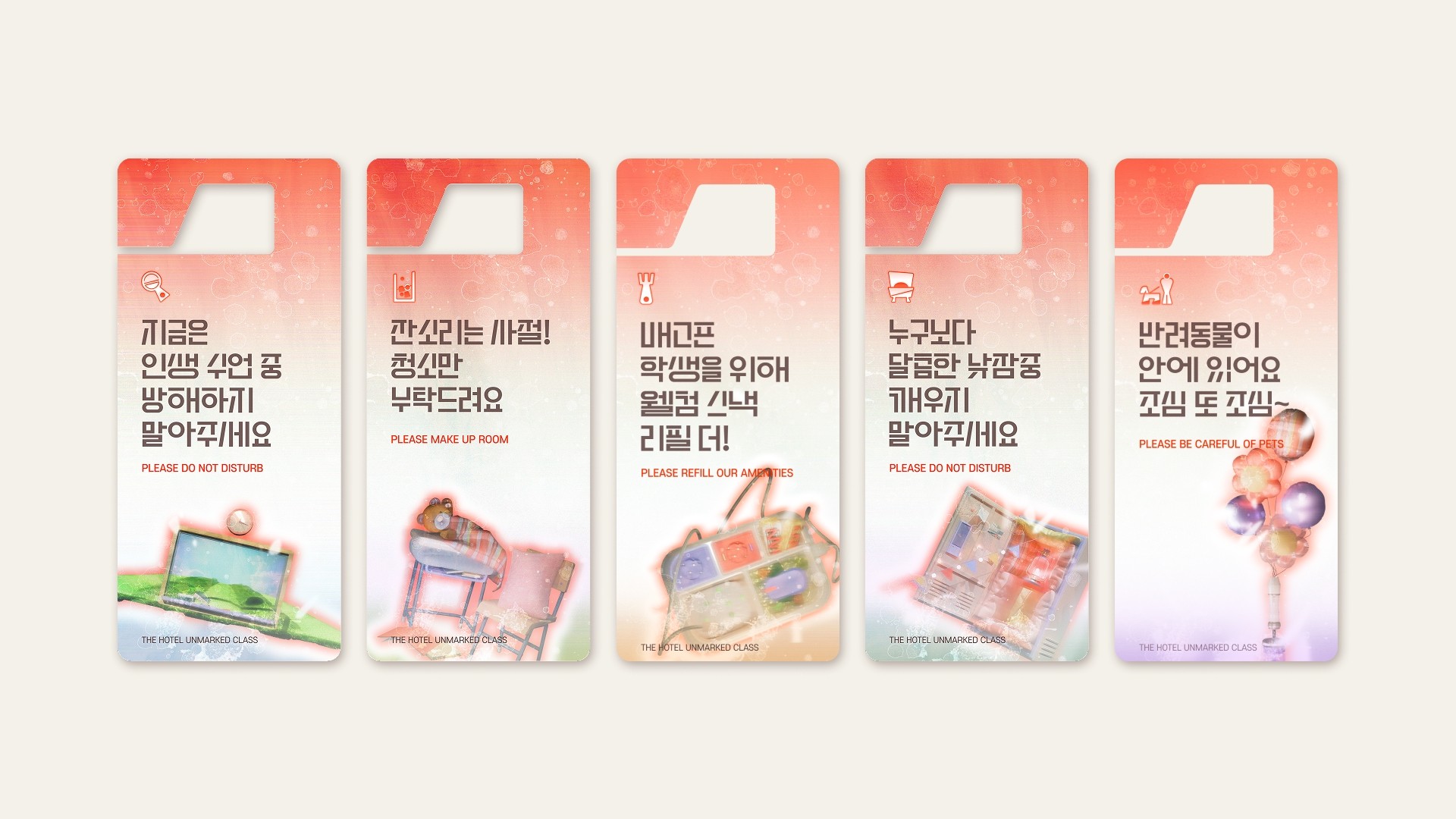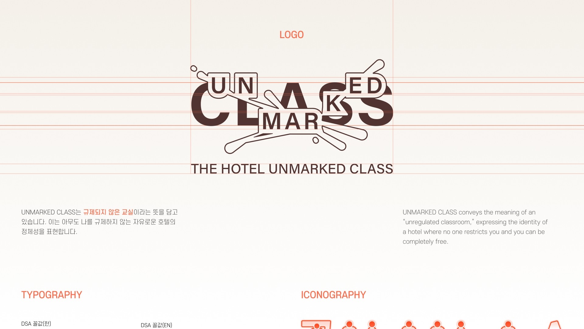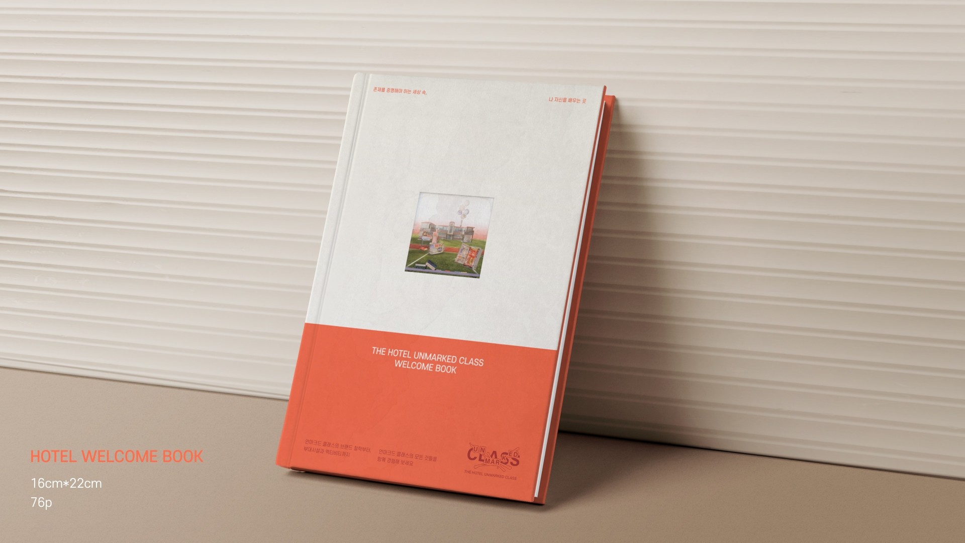 Unmarked Class는 줄어드는 학령 인구 추세에 늘어나는 도심 속 폐교를 재해석한 청장년 리커버 호텔입니다. 폐교 활용이 사회적 과제로 떠오른 지금, Unmarked Class는 과거 이곳의 학생이었던 청장년층을 다시 불러 모읍니다. 종소리가 멈춘 이곳에서 우리는 웃음과 철학으로 스스로를 깨닫고 삶의 에너지를 충전합니다. 수업도, 평가도, 출석 체크도 없는 이곳에서는 나에 대해 배우는 경험 만이 중심이 됩니다. 존재를 증명해야 하는 세상 속, 그 어떤 것도 규정하지 않은 진정한 학교, Unmarked Class에서 머물다 가세요.