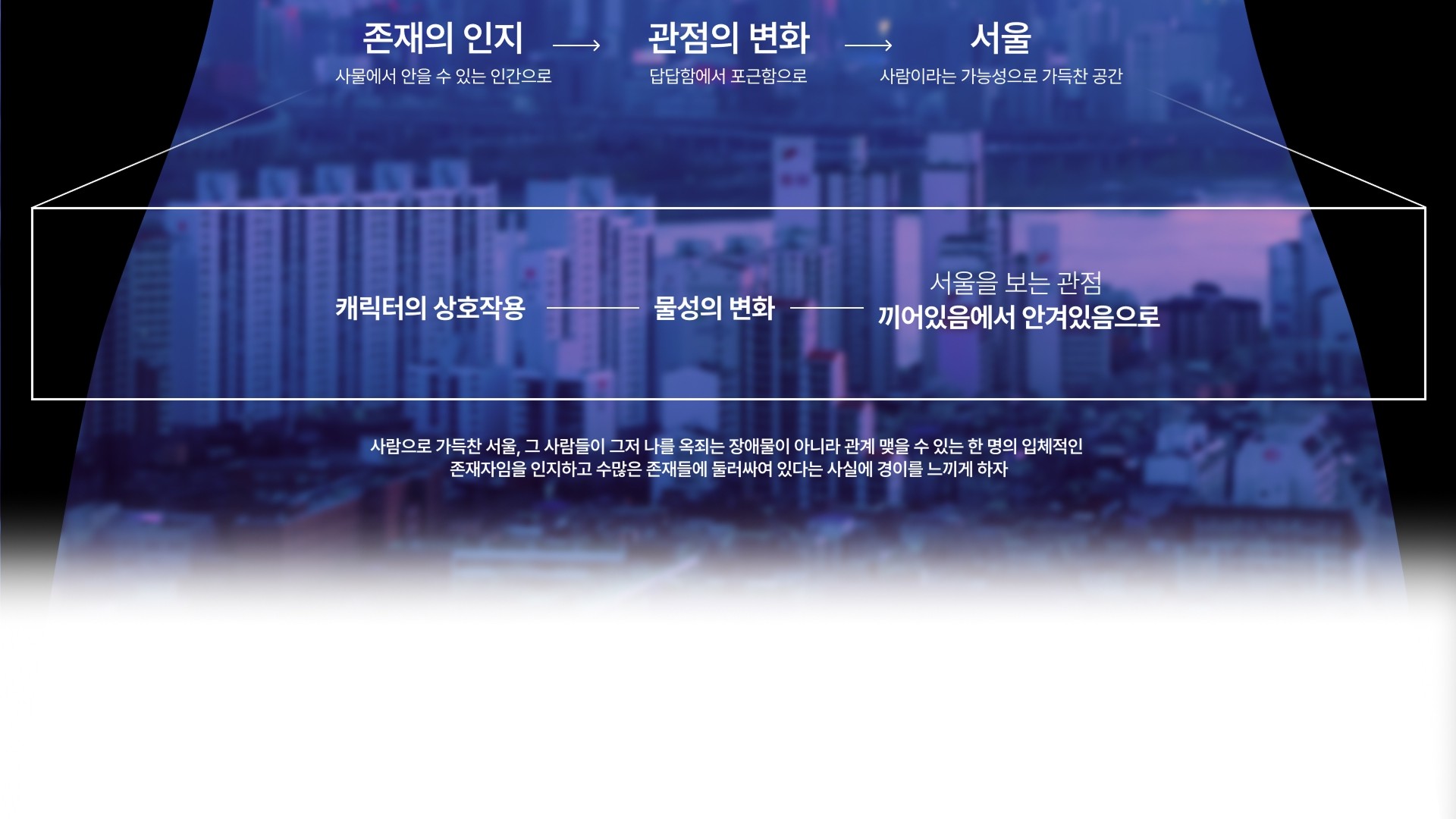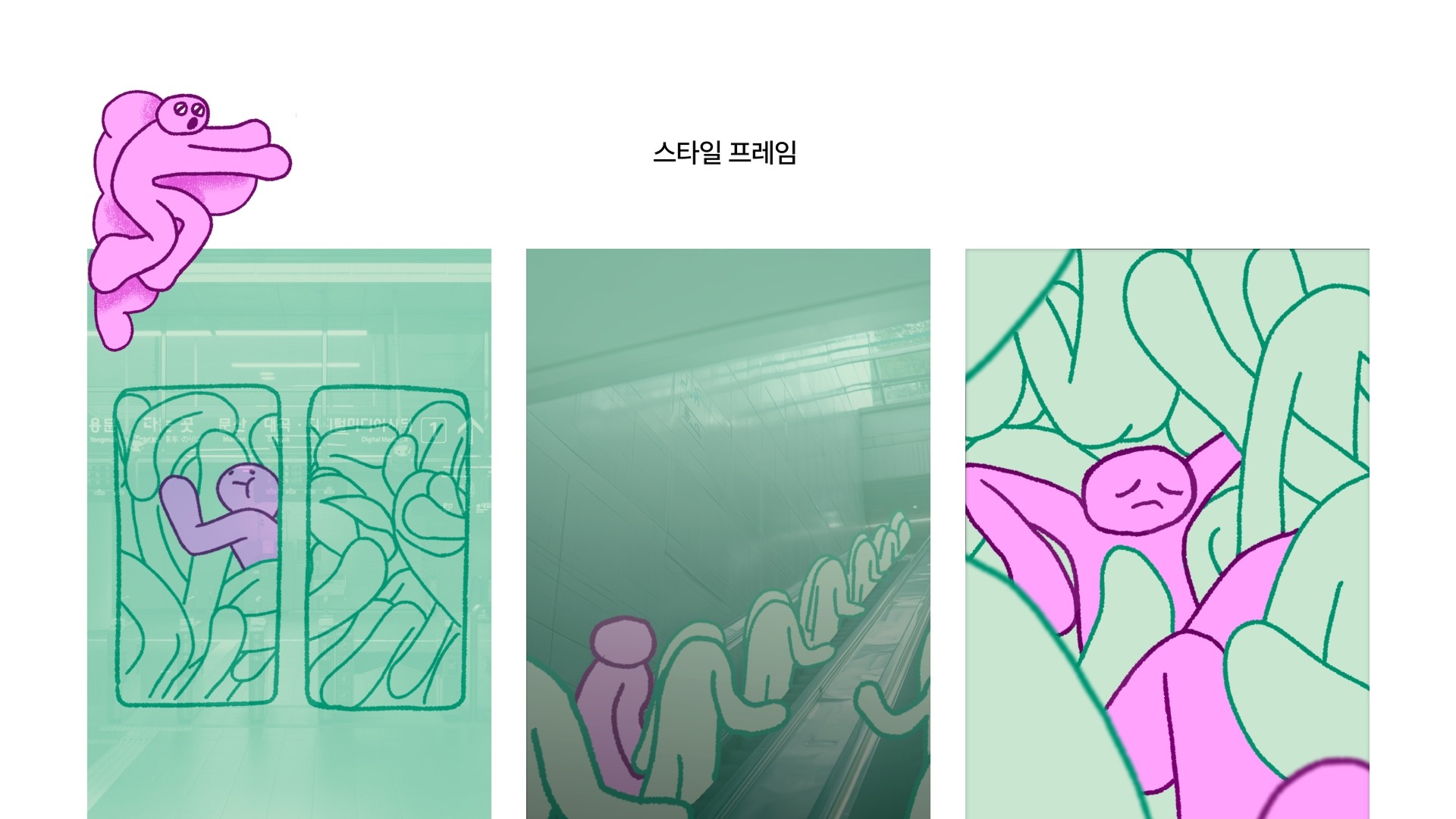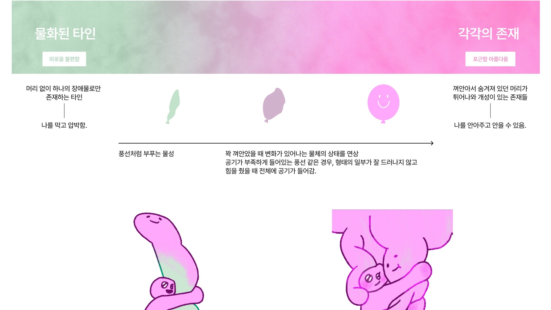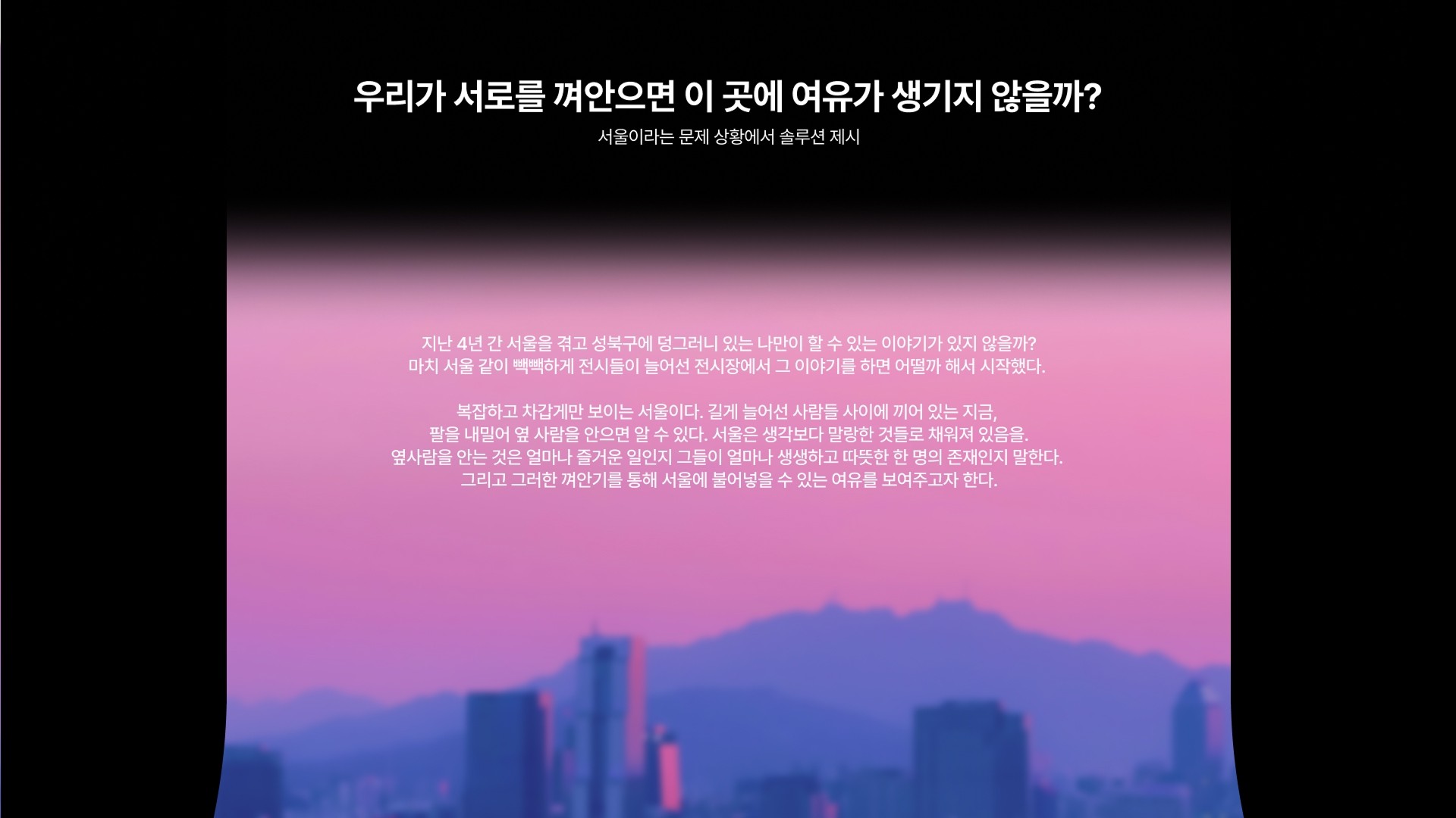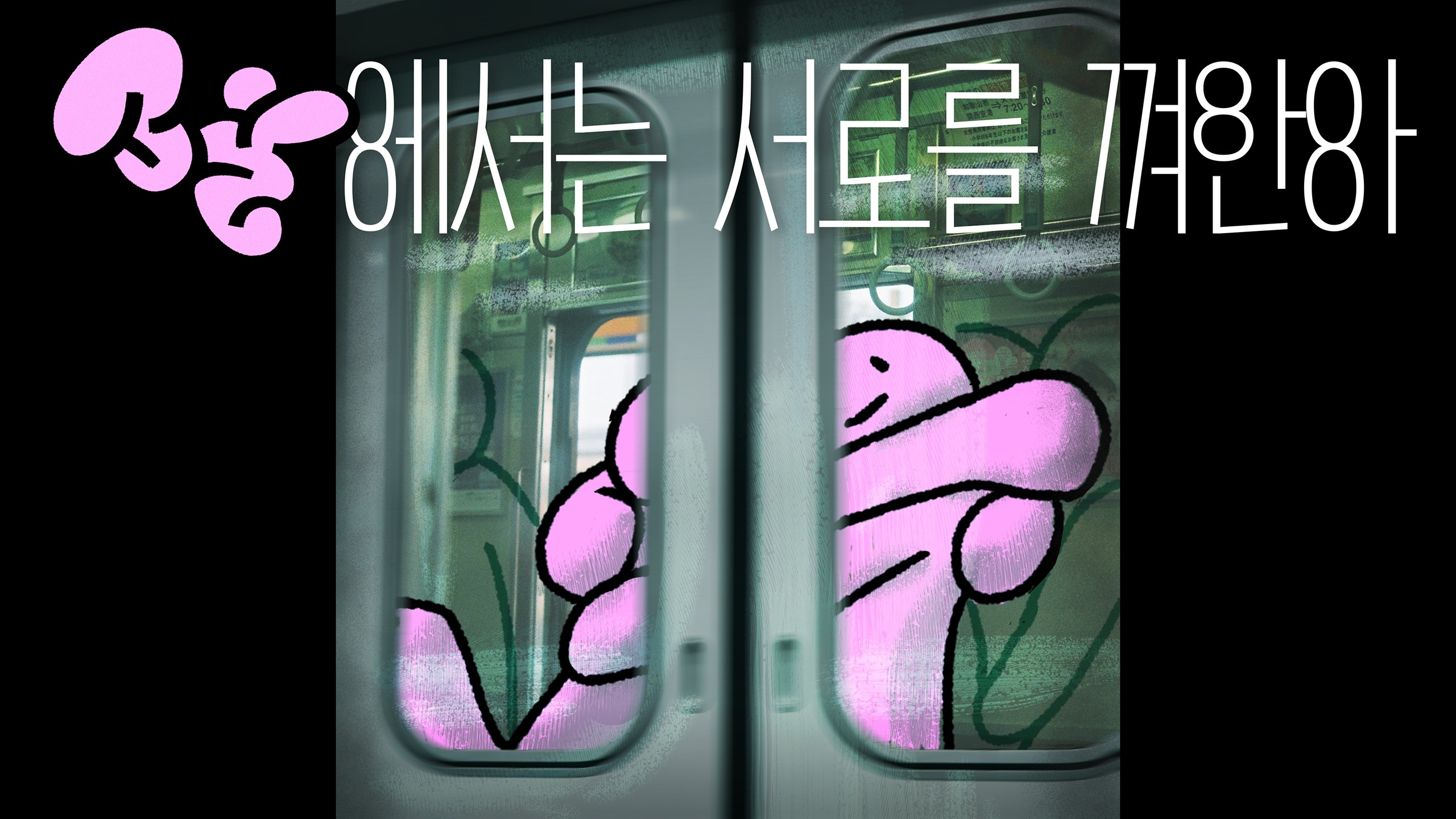 사방으로 사람이 가득 찬 이곳. 튀어나온 팔꿈치는 머리를 찌르고, 들이민 엉덩이는 복부를 압박한다. 그때 문득 든 생각, 끼어 있지 말고 그냥 안아버리자. 서로를 껴안으면 이곳에 여유가 생기지 않을까? 우리가 사는 곳은 복잡하고 차갑게만 보이는 서울이다. 빽빽하게 끼어 있는 사람들 틈에서, 팔을 내밀어 옆 사람을 안아보면 알 수 있다. 서울은 생각보다 말랑한 것들로 채워져 있음을. 그들을 안고 말을 건네고 바라보자. 사방을 채우는 따뜻한 질감과 다채로운 존재를 느껴보자. 옆 사람을 안는 것이 얼마나 즐거운 일인지, 그들이 얼마나 생생하고 따뜻한 존재인지 깨닫게 될 것이다. 그 순간, 서울에 불어넣어진 여유를 마주하고, 새로운 시야를 갖길 바란다.