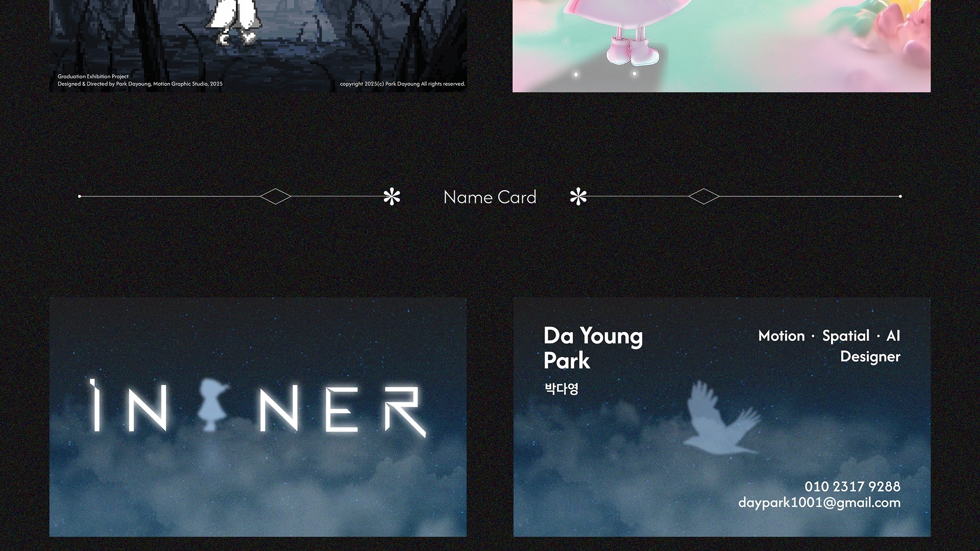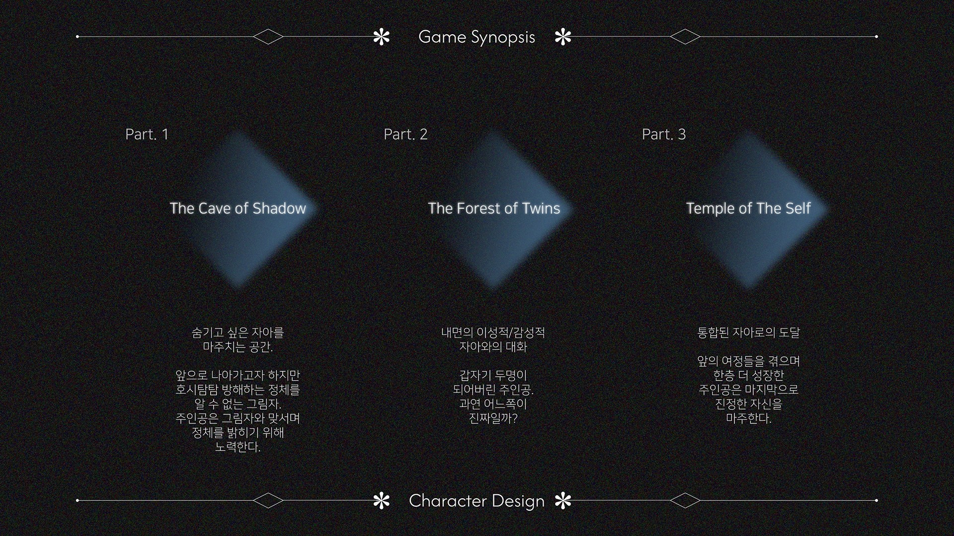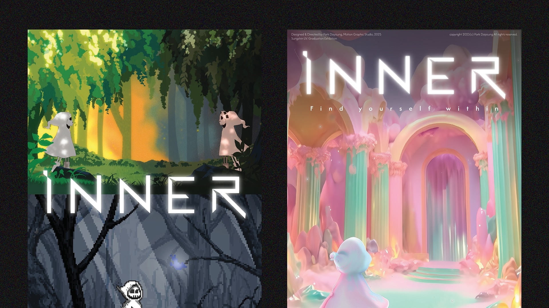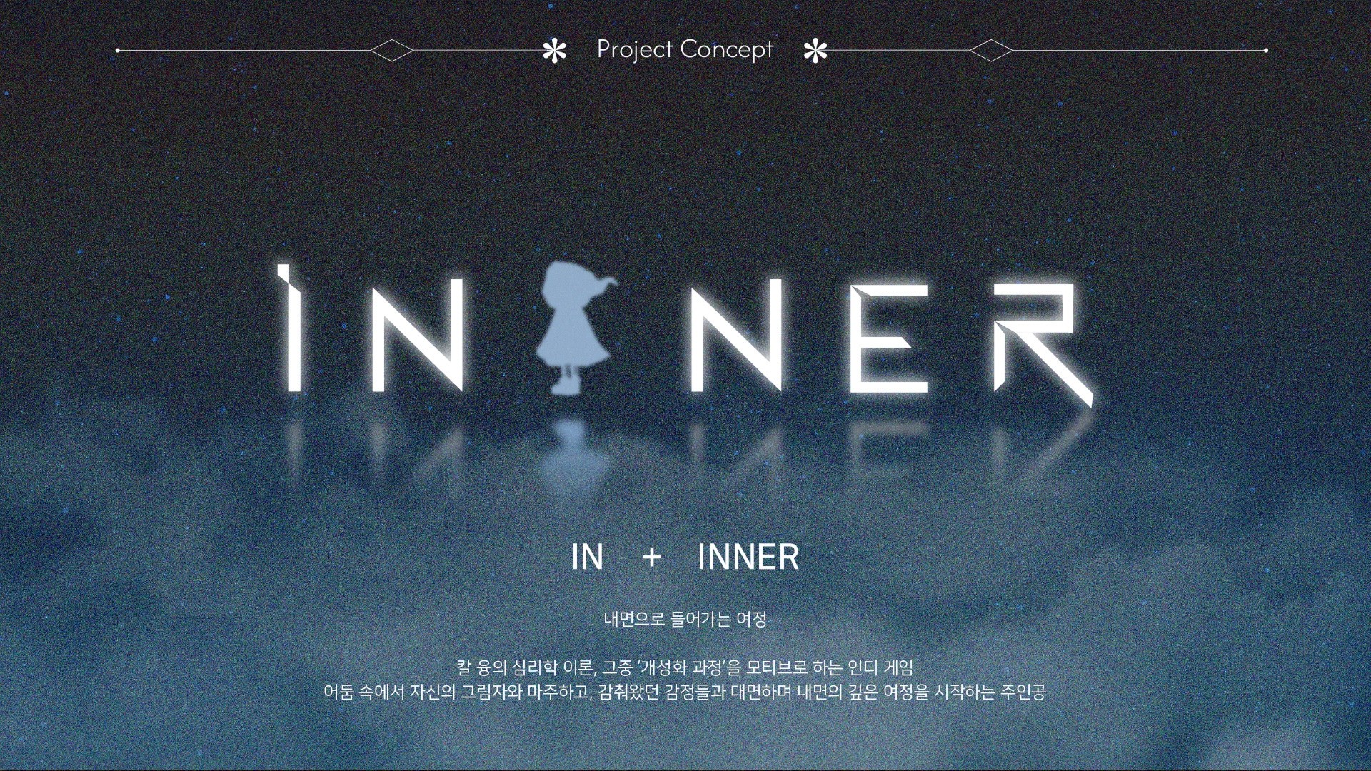 We all dream. Sometimes our dreams turn into shadows of fear, and sometimes they shine as lights that guide us. The fictional game “INNER”, inspired by Carl Jung’s idea of individuation, follows a protagonist who has lost their sense of self. Through changing visual styles—pixel, 2D, and 3D—the game mirrors their inner transformation. Passing through the Cave of Shadows, the Forest of Twins, and the Temple of the Self, the protagonist experience inner growth and transformation. There is no fixed answer to this story, but when you face the screen, you may find the journey belongs to you.