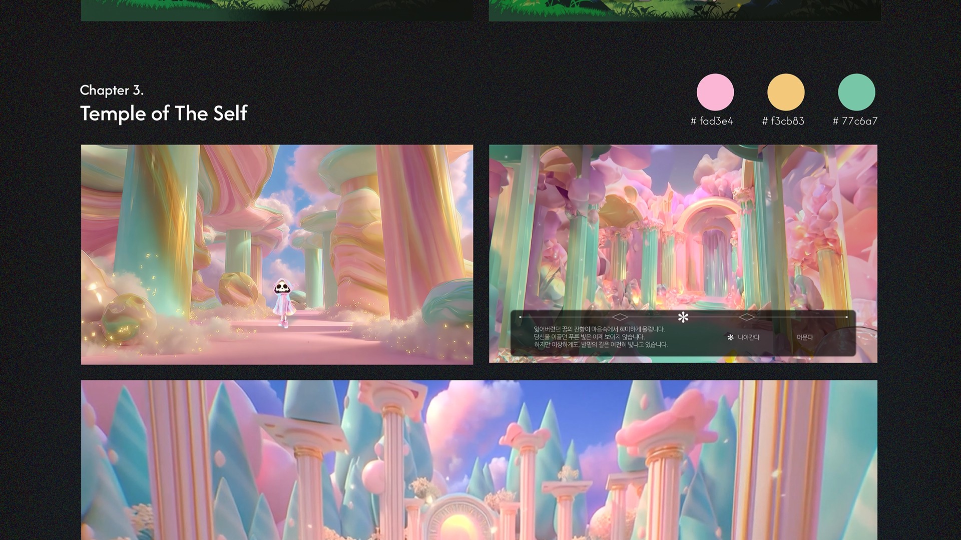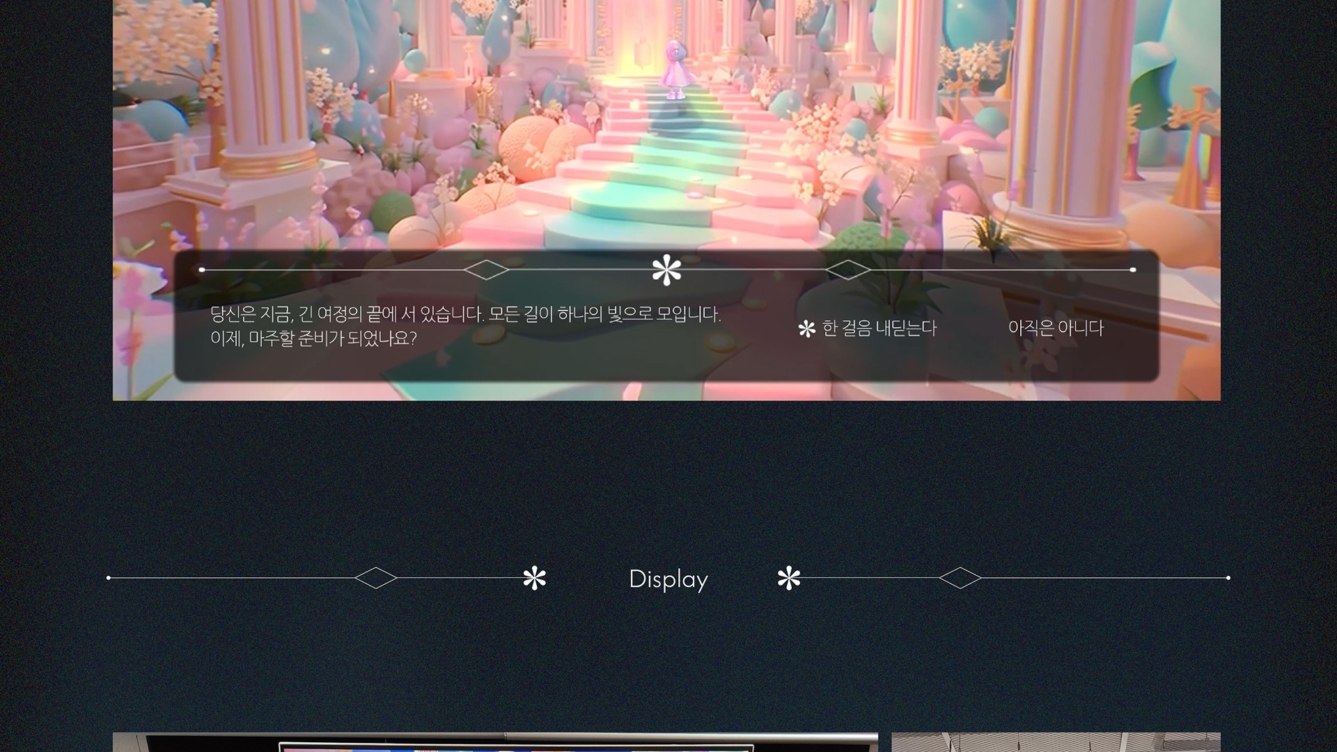 우리는 누구나 꿈을 꾼다. 그 꿈은 때로는 두려움의 그림자가 되어 우리를 흔들고, 때로는 길을 비추는 빛이 되어 우리 앞에 나타난다. 가상의 게임 「INNER」는 심리학자 칼 융의 ‘개성화 과정’을 모티프로, 자신을 잃어버린 한 주인공의 여정을 그려낸 작품이다. 픽셀, 2D, 3D 등 서로 다른 그래픽 스타일은 세계가 전환되는 순간마다 주인공의 내면과 변화를 비유적으로 드러낸다. 그림자와의 만남, 내면의 갈등, 그리고 자아의 발견은 하나의 긴 여정으로 이어진다. 이 이야기에 정해진 답은 없다. 다만 스크린 앞에 선 순간, 이 게임 속 주인공은 어쩌면 당신일지도 모른다.