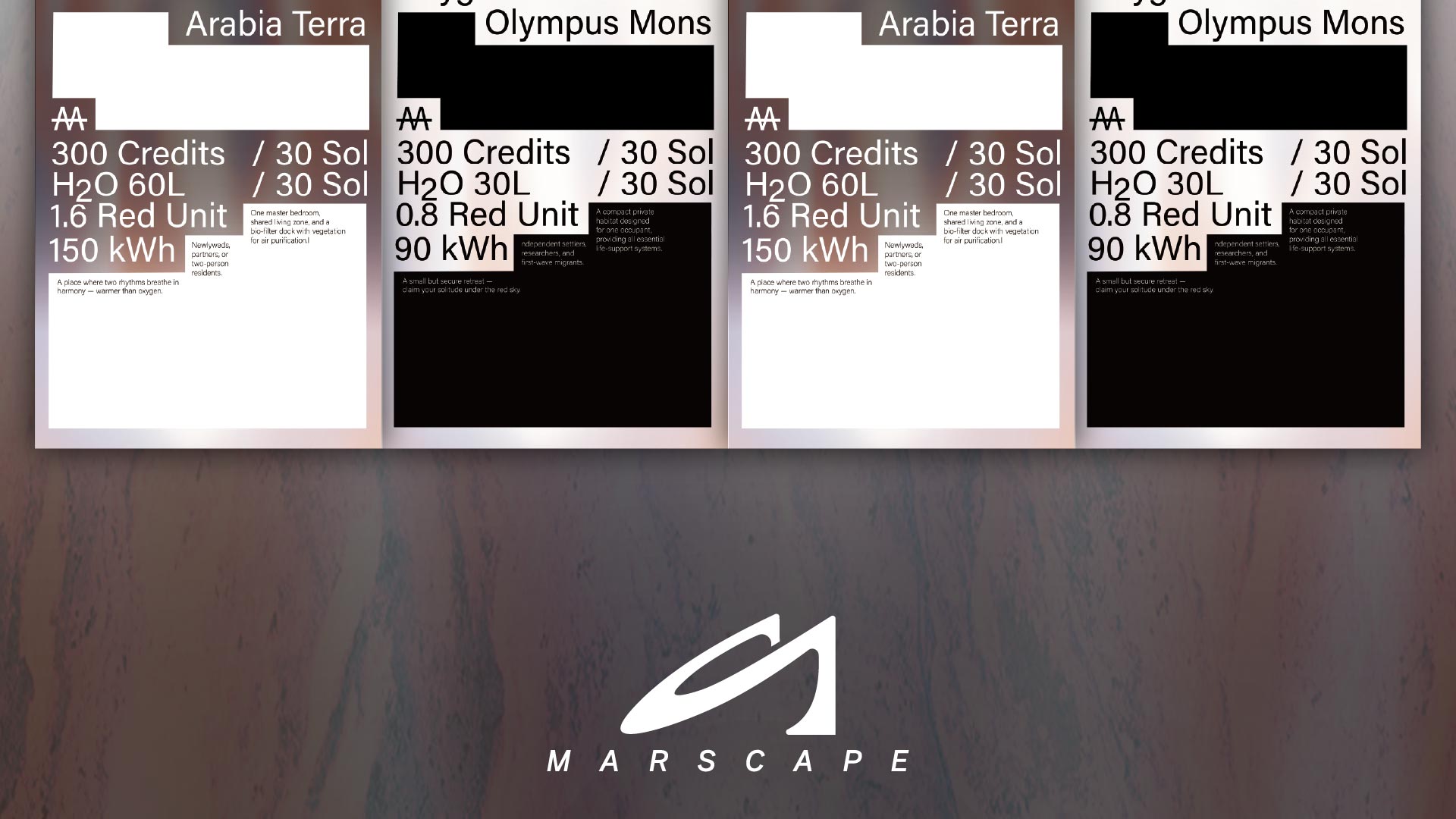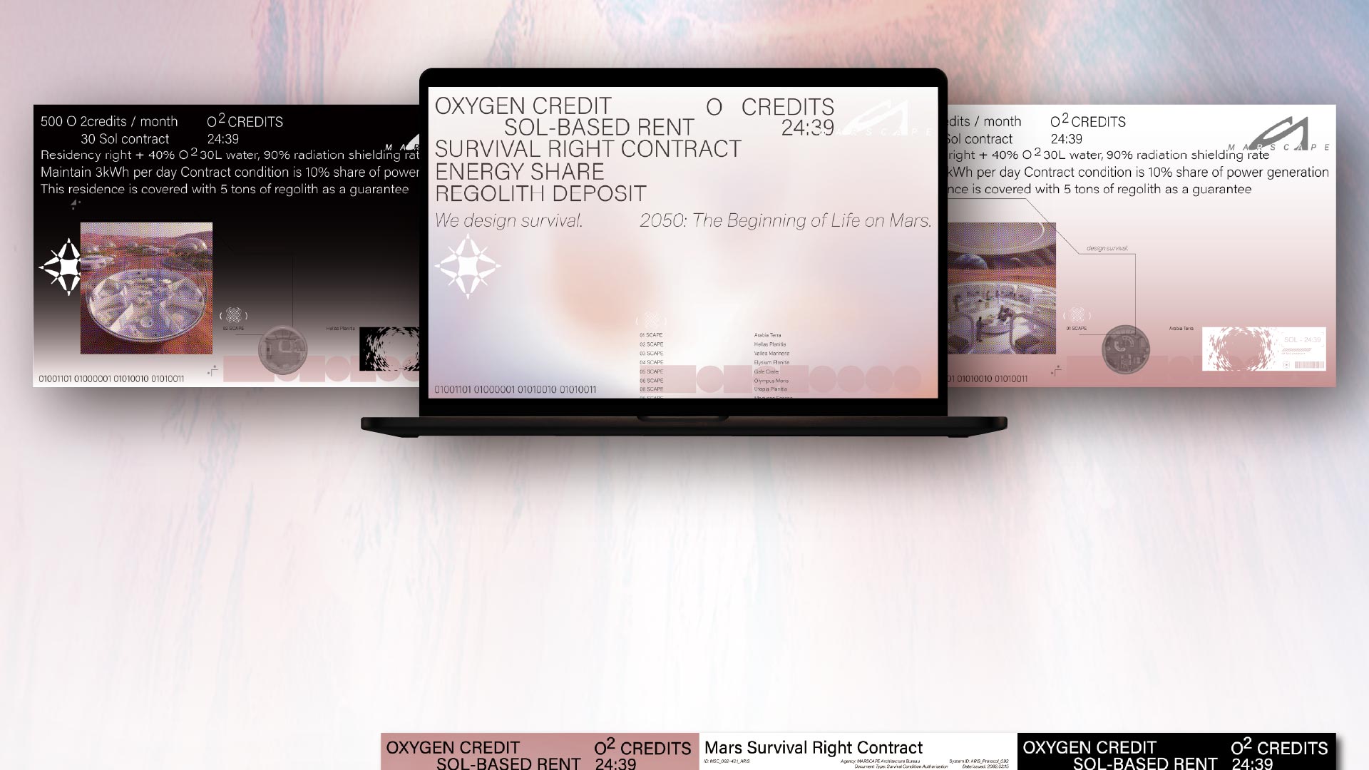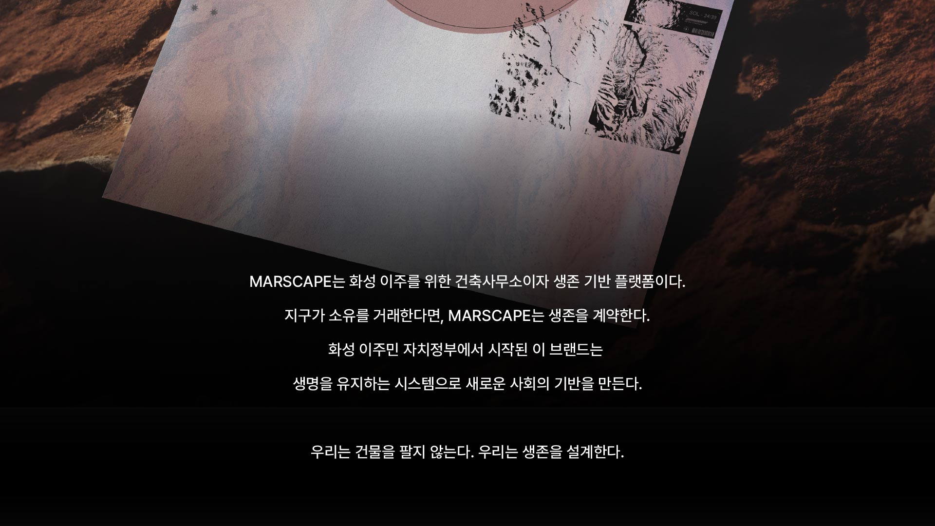 MARSCAPE는 화성 이주를 위한 건축 사무소이자 생존 기반 플랫폼으로, 건축을 단순한 공간 설계가 아닌 ‘살 수 있는 조건’을 만드는 행위로 정의한다. 산소, 에너지, 식량, 의료, 공동체 등 생존에 필요한 모든 요소를 하나의 시스템으로 통합해 계약하며, 지구가 부동산의 소유를 거래한다면 MARSCAPE는 생존을 계약한다. 우리는 건물을 팔지 않는다. 우리는 생존을 설계한다. MARSCAPE는 인류가 다른 행성에서 맺는 첫 번째 생존 계약이다.