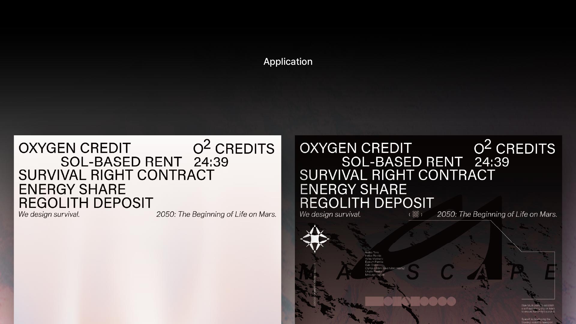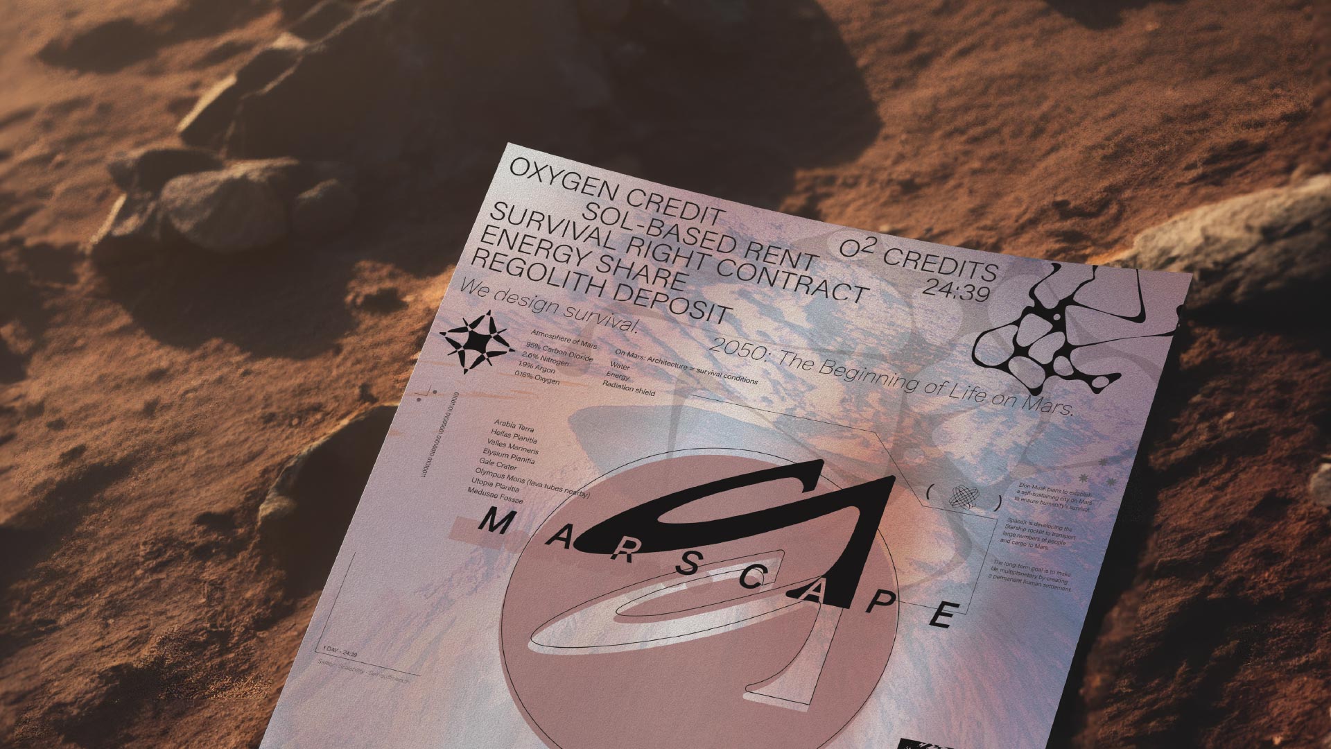 MARSCAPE is an architectural agency for Mars migration and a survival-based platform that defines architecture not as the design of space, but as the act of creating the conditions to live. Oxygen, energy, food, medicine, and community are integrated into one system of survival, and while Earth trades ownership, MARSCAPE contracts life itself. We do not sell buildings. We design survival. MARSCAPE is humanity’s first survival contract made on another planet.