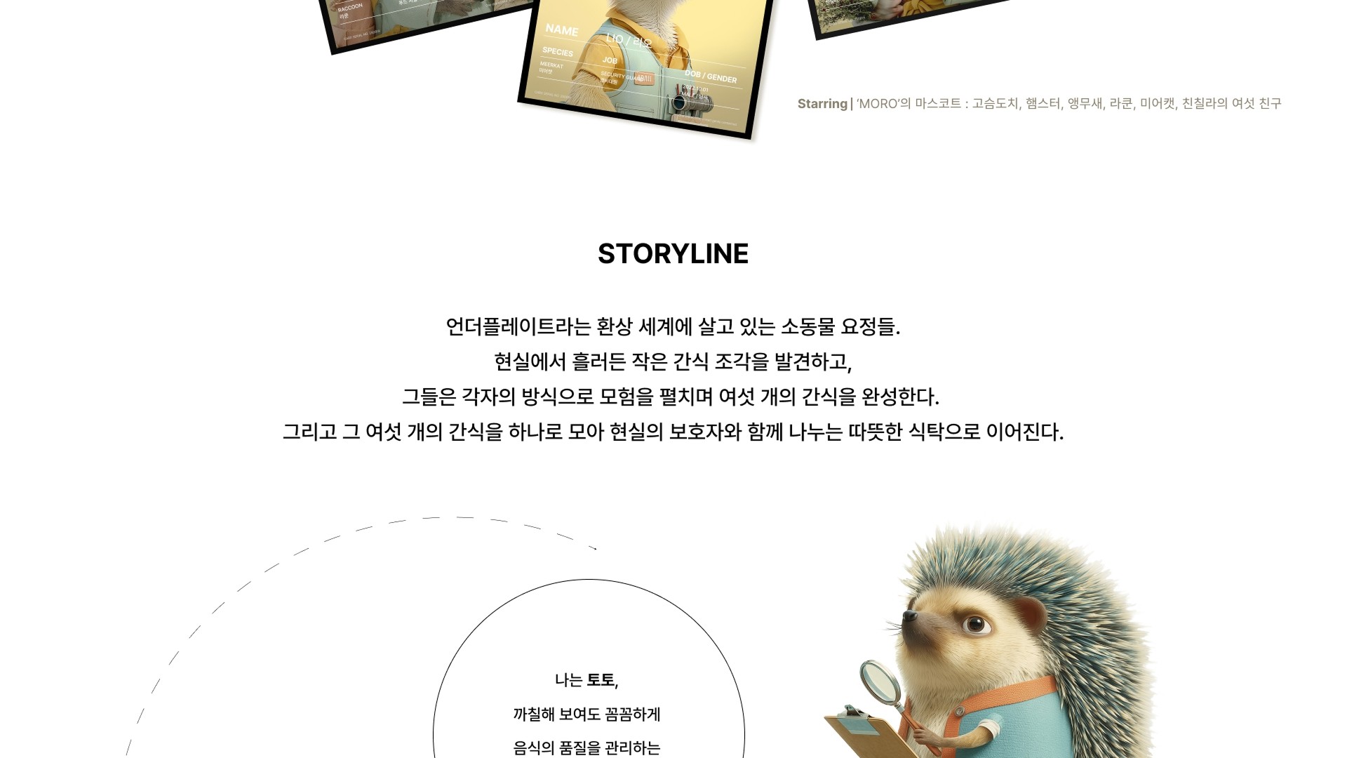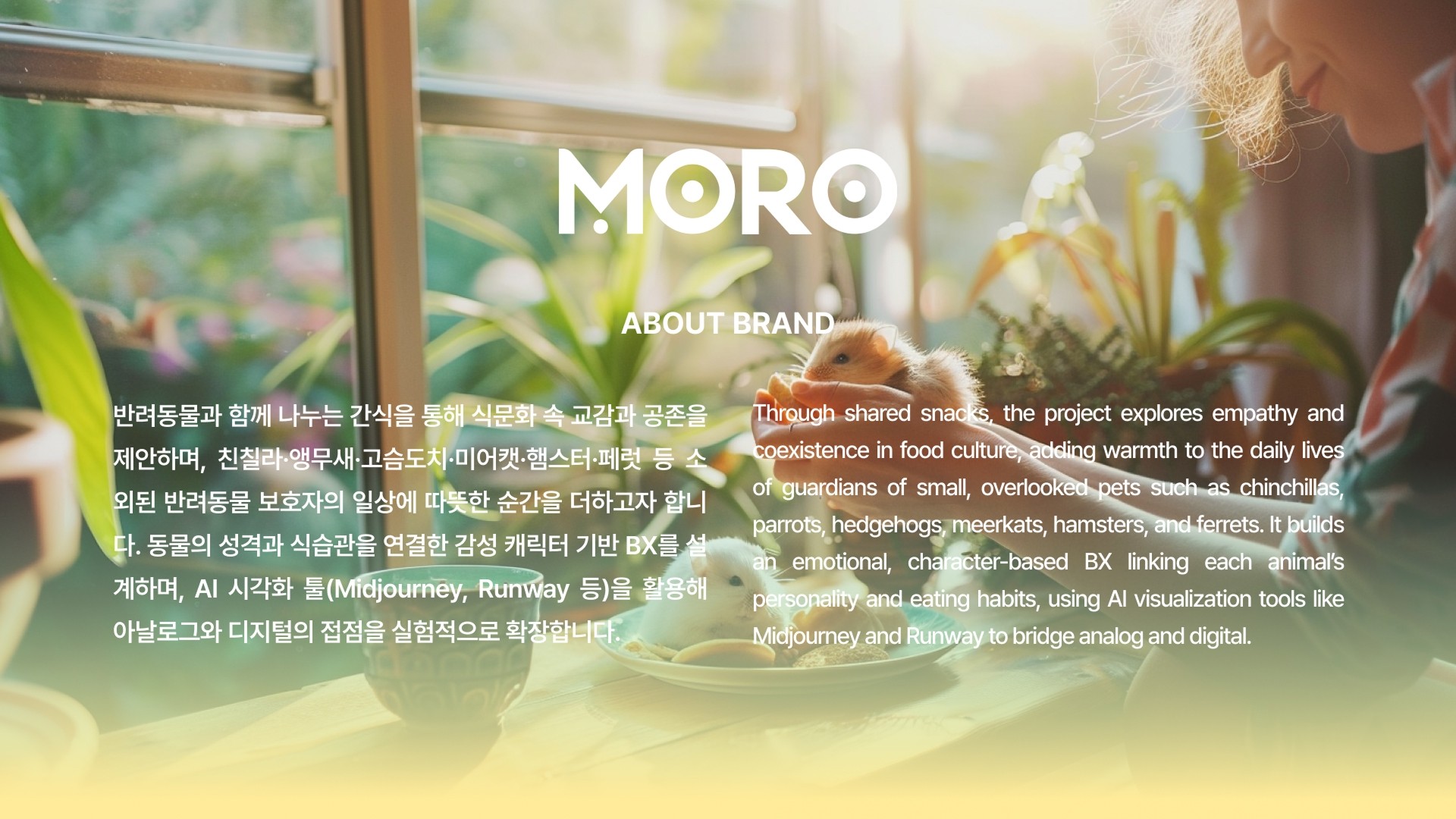 MORO is a shared snack brand designed for small and exotic companion animals. With the slogan “One Bite Together, Hearts Connected,” it proposes a daily culture of empathy and coexistence between guardians and their small companions through shared dining. Through AI-based visual experiments, MORO develops its logo, characters, and universe, exploring emotional connection and coexistence through the stories of six animal characters within its world — a BX design project that visualizes the warmth of sharing.