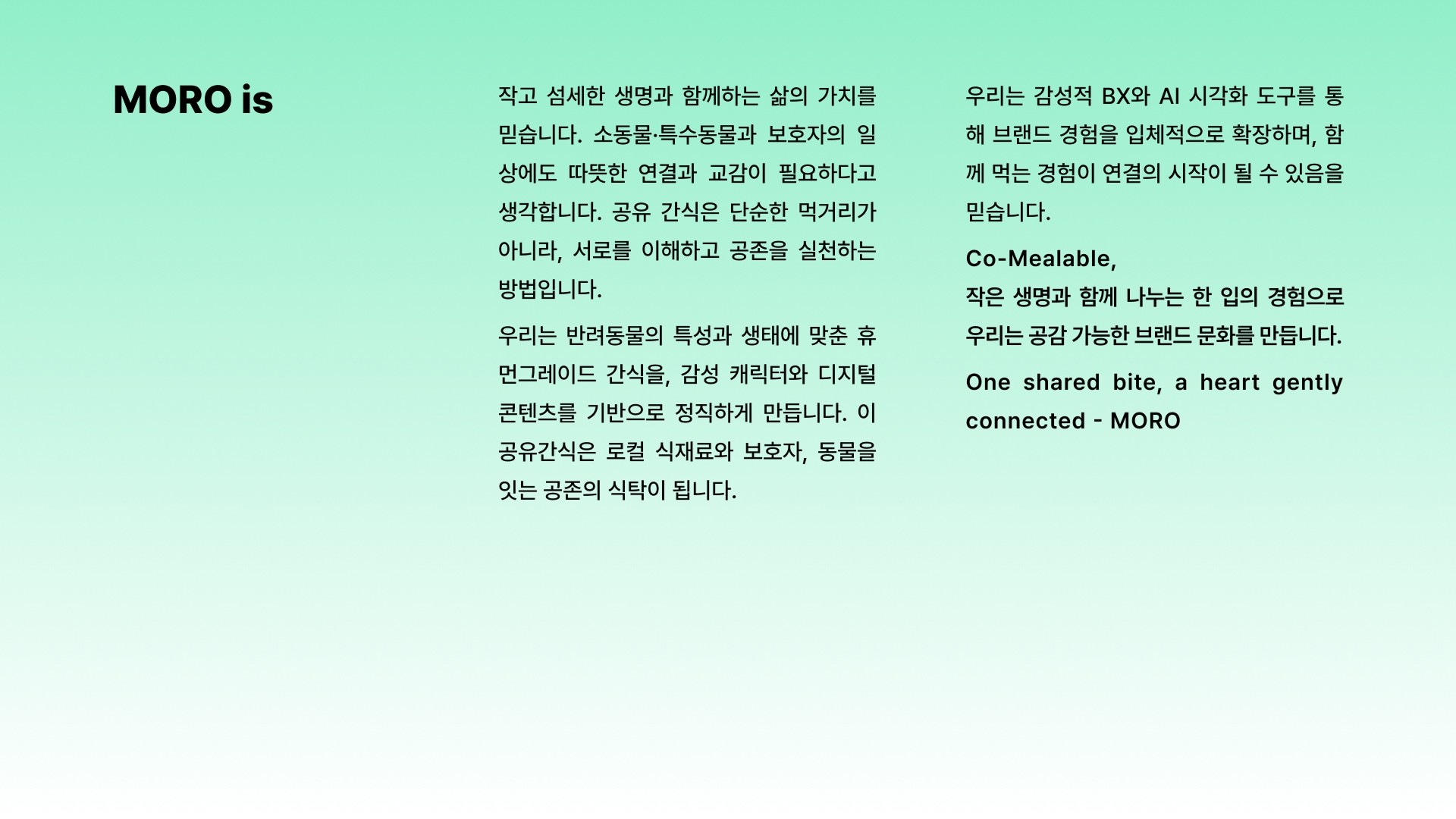MORO는 소동물과 특수반려동물을 위한 공유 간식 브랜드입니다. ‘함께 먹는 한 입, 닿아있는 마음’을 슬로건으로, 보호자와 작은 생명이 식문화를 통해 교감하고 공존하는 일상을 제안합니다. AI 기반 시각 실험으로 브랜드 로고, 캐릭터, 세계관 등을 설계하고, 브랜드 세계관 속 여섯 동물의 이야기를 통해 ‘함께 먹는 경험’이 만들어내는 감정적 연결을 탐구한 공존·교감의 BX 디자인 프로젝트입니다.