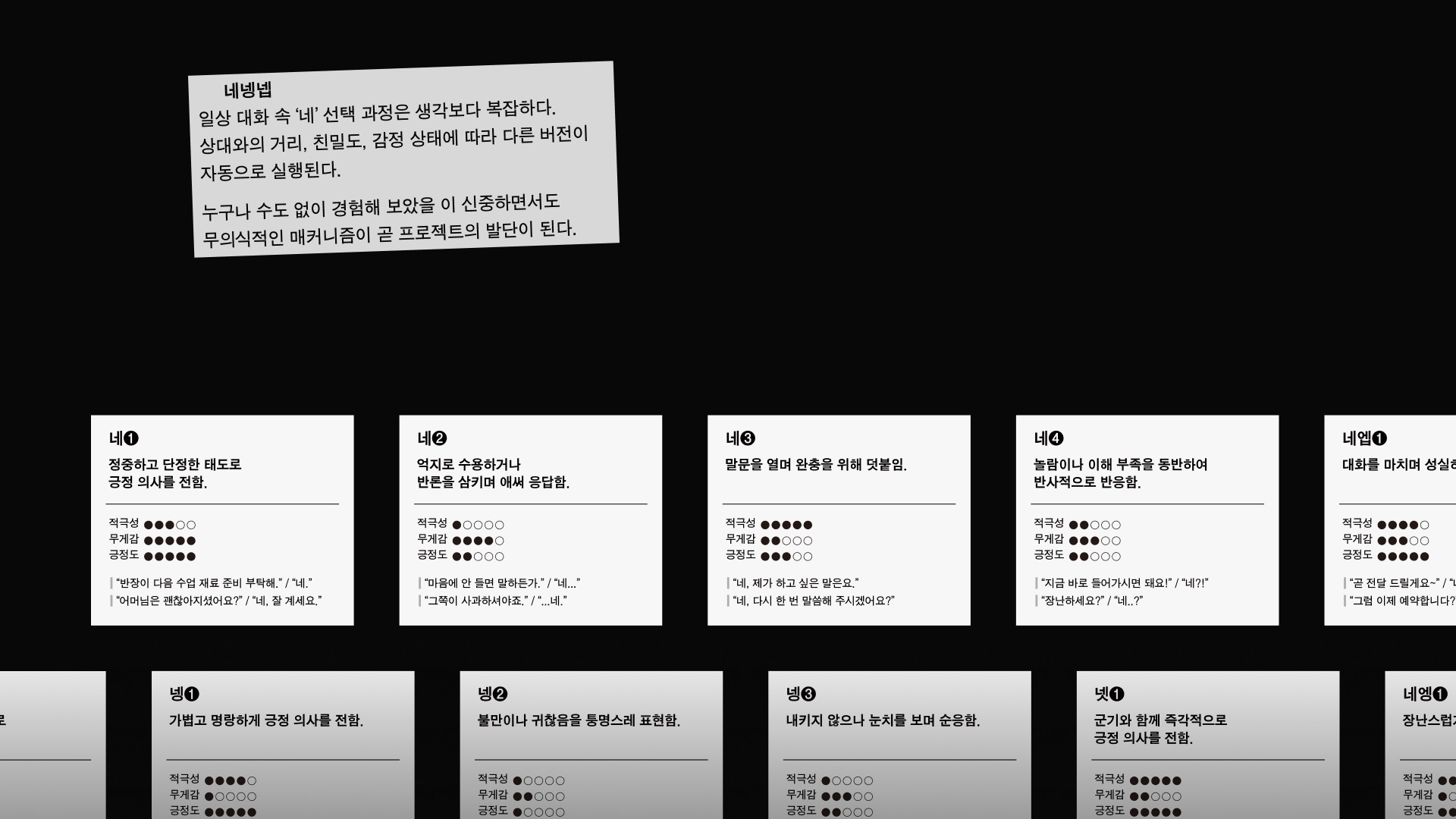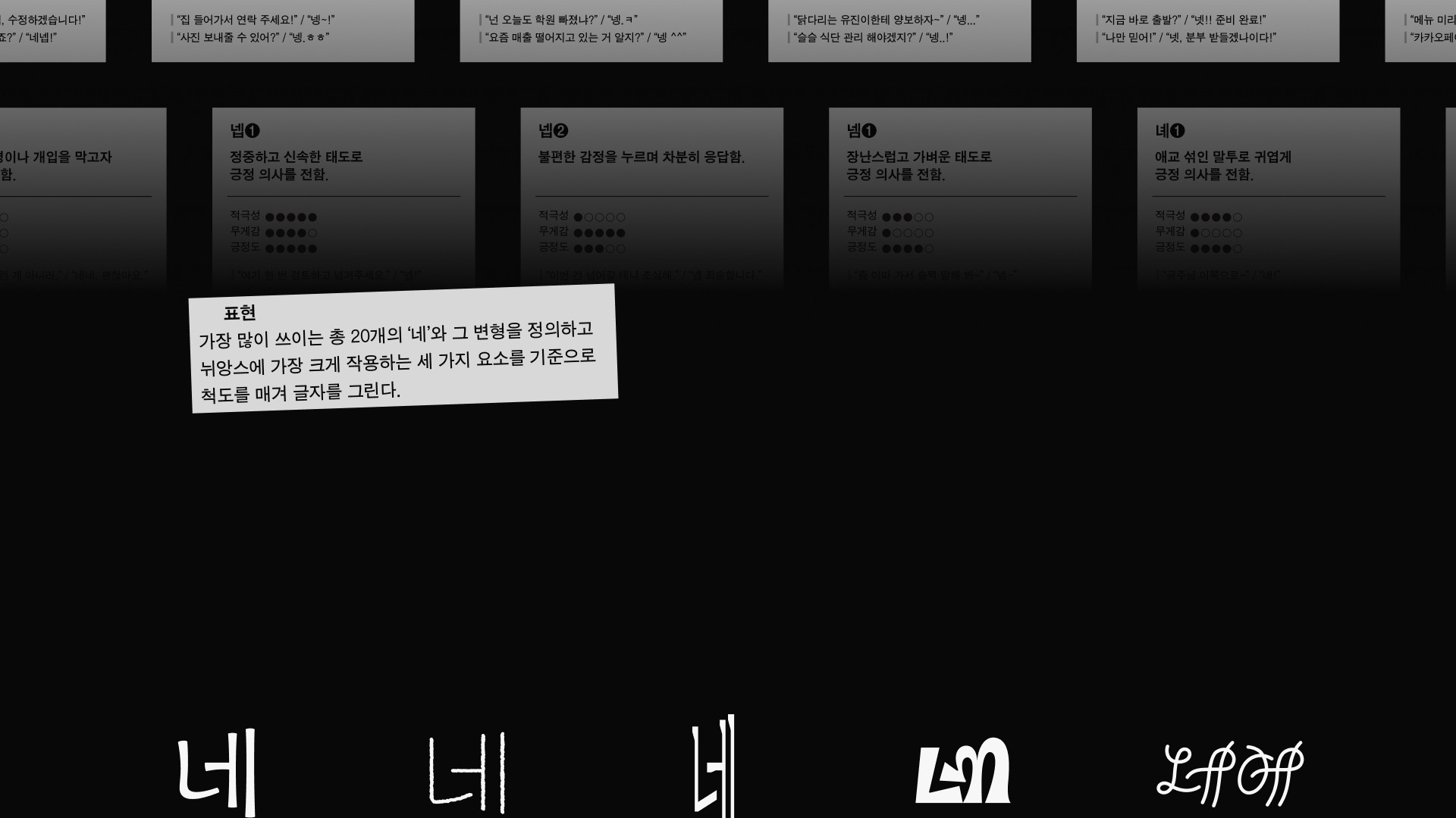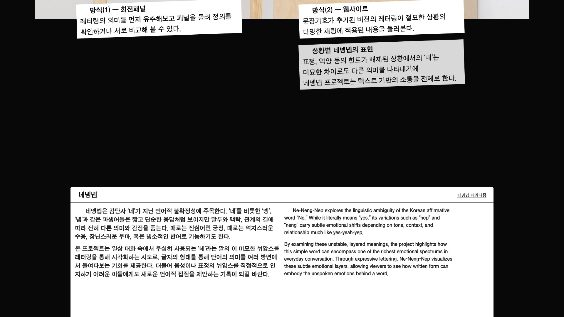 네넹넵은 감탄사 ‘네’가 지닌 언어적 불확정성에 주목한다. ‘네’를 비롯한 ‘넹’, ‘넵’과 같은 파생어들은 짧고 단순한 응답처럼 보이지만 말투와 맥락, 관계의 결에 따라 전혀 다른 의미와 감정을 품는다. 때로는 진심어린 긍정, 때로는 억지스러운 수용, 장난스러운 무마, 혹은 냉소적인 반어로 기능하기도 한다. 본 프로젝트는 일상 대화 속에서 무심히 사용되는 아주 짧은 한마디 ‘네’의 이 미묘한 뉘앙스를 레터링을 통해 시각화하는 시도로, 글자의 형태를 통해 단어의 의미를 여러 방면에서 들여다보는 기회를 제공한다. 더불어 음성이나 표정의 뉘앙스를 직접적으로 인지하기 어려운 이들에게도 새로운 언어적 접점을 제안하는 기록이 되길 바란다.