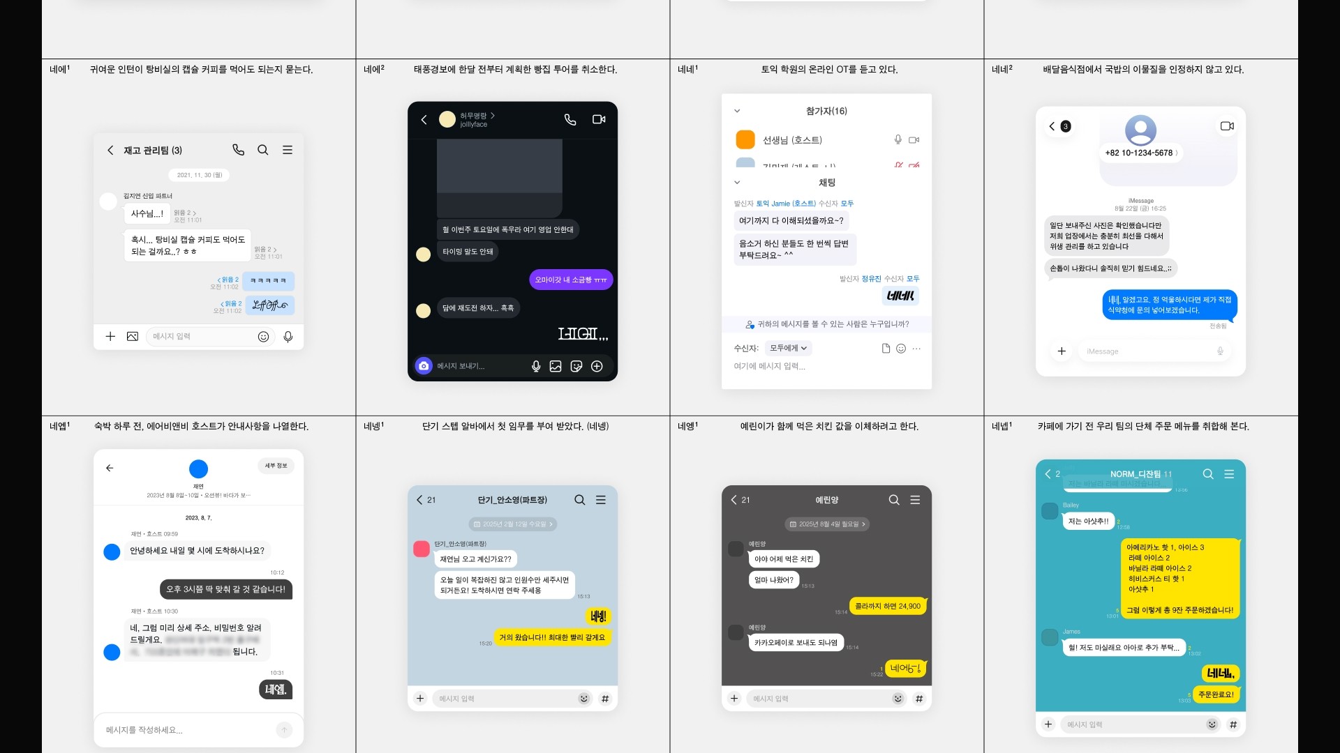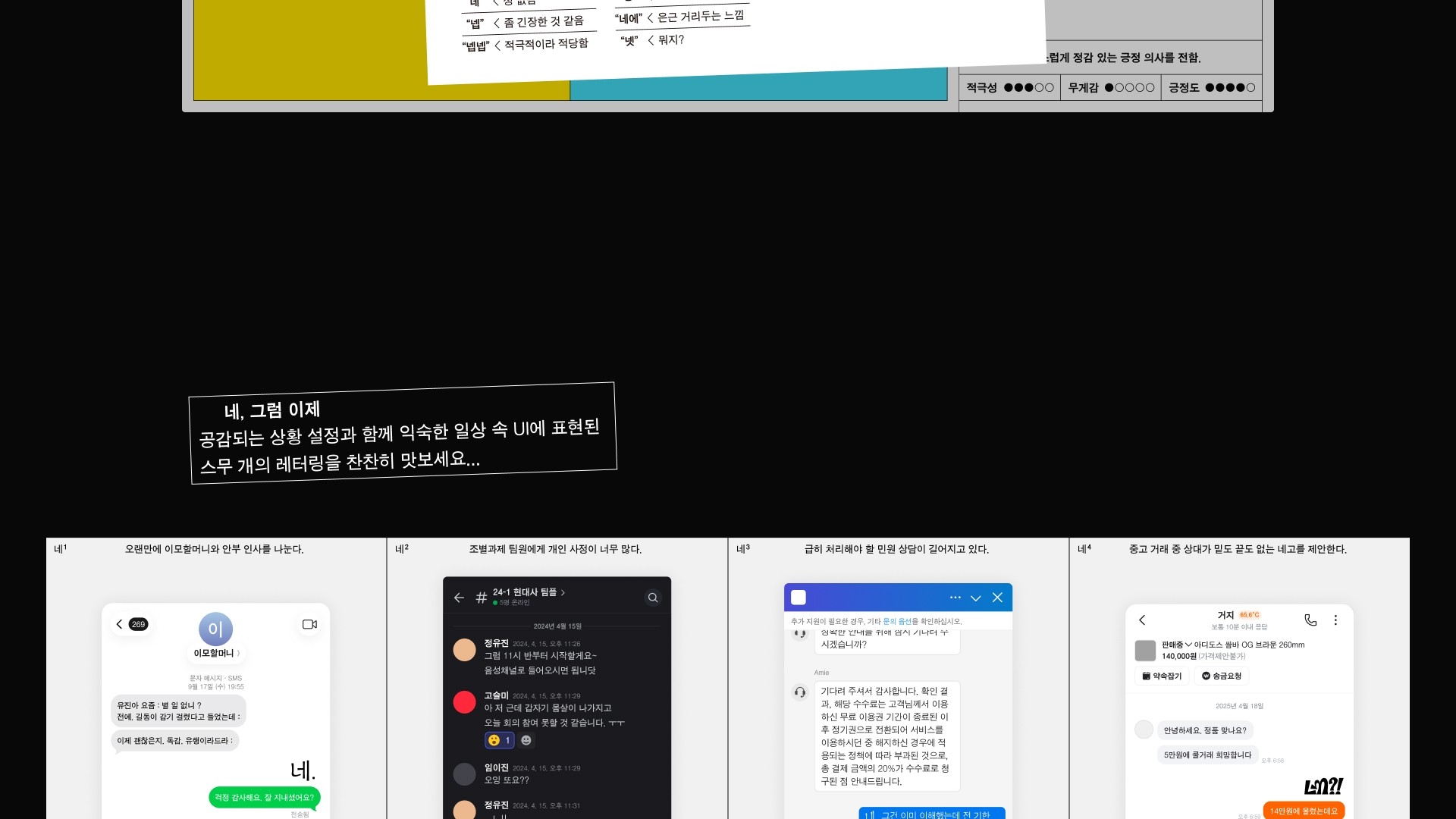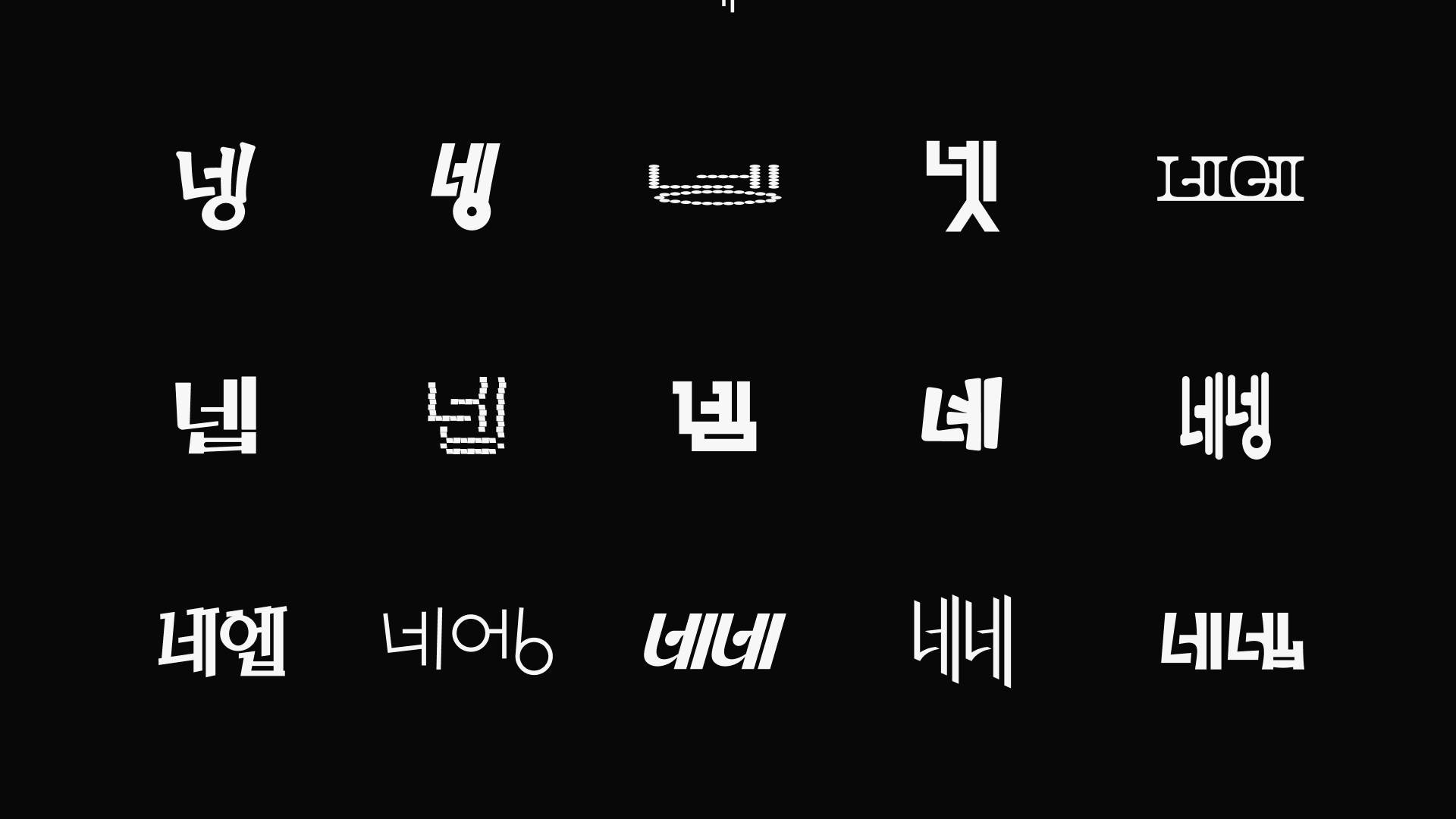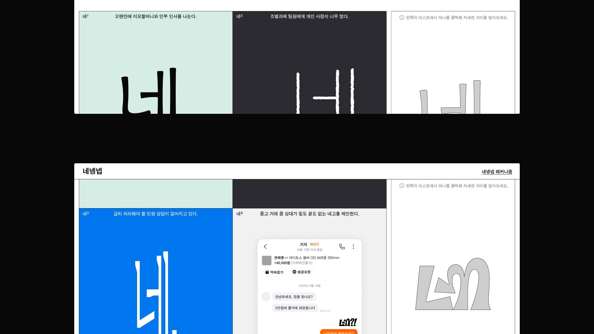 네넹넵은 감탄사 ‘네’가 지닌 언어적 불확정성에 주목한다. ‘네’를 비롯한 ‘넹’, ‘넵’과 같은 파생어들은 짧고 단순한 응답처럼 보이지만 말투와 맥락, 관계의 결에 따라 전혀 다른 의미와 감정을 품는다. 때로는 진심어린 긍정, 때로는 억지스러운 수용, 장난스러운 무마, 혹은 냉소적인 반어로 기능하기도 한다. 본 프로젝트는 일상 대화 속에서 무심히 사용되는 아주 짧은 한마디 ‘네’의 이 미묘한 뉘앙스를 레터링을 통해 시각화하는 시도로, 글자의 형태를 통해 단어의 의미를 여러 방면에서 들여다보는 기회를 제공한다. 더불어 음성이나 표정의 뉘앙스를 직접적으로 인지하기 어려운 이들에게도 새로운 언어적 접점을 제안하는 기록이 되길 바란다.