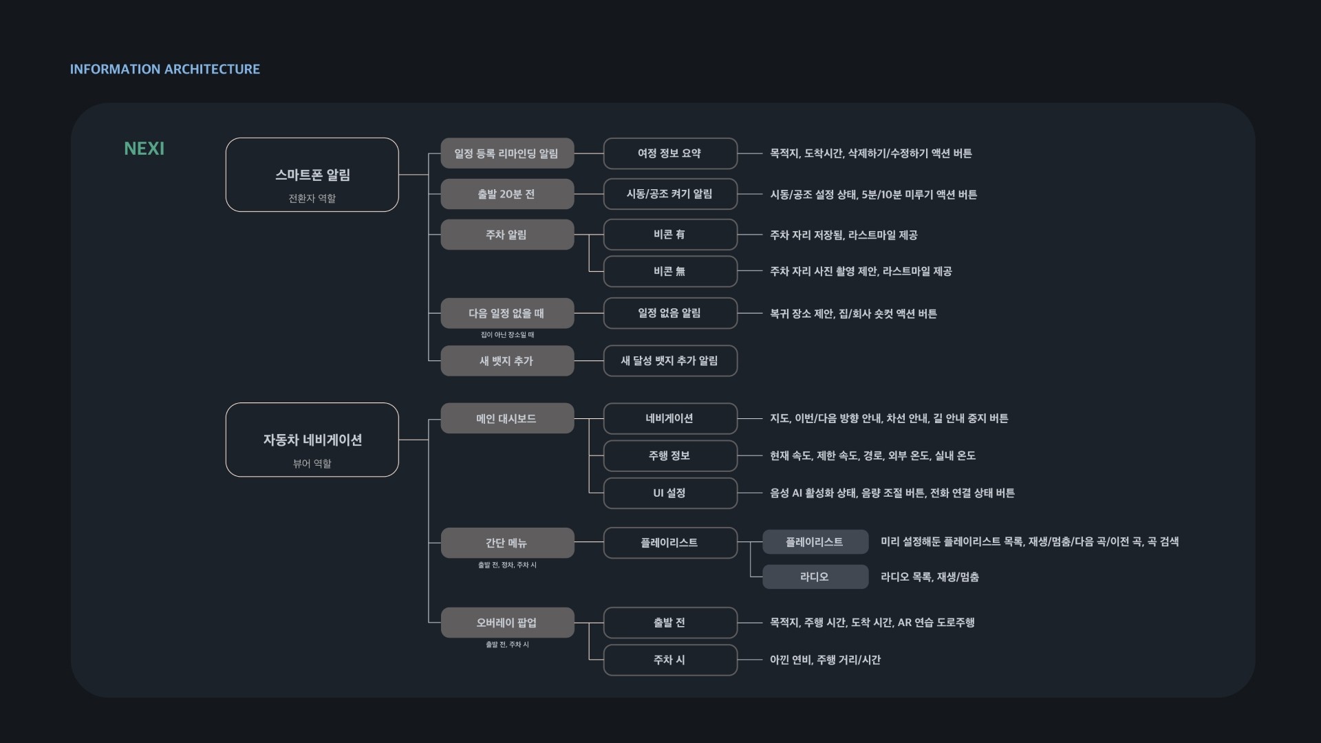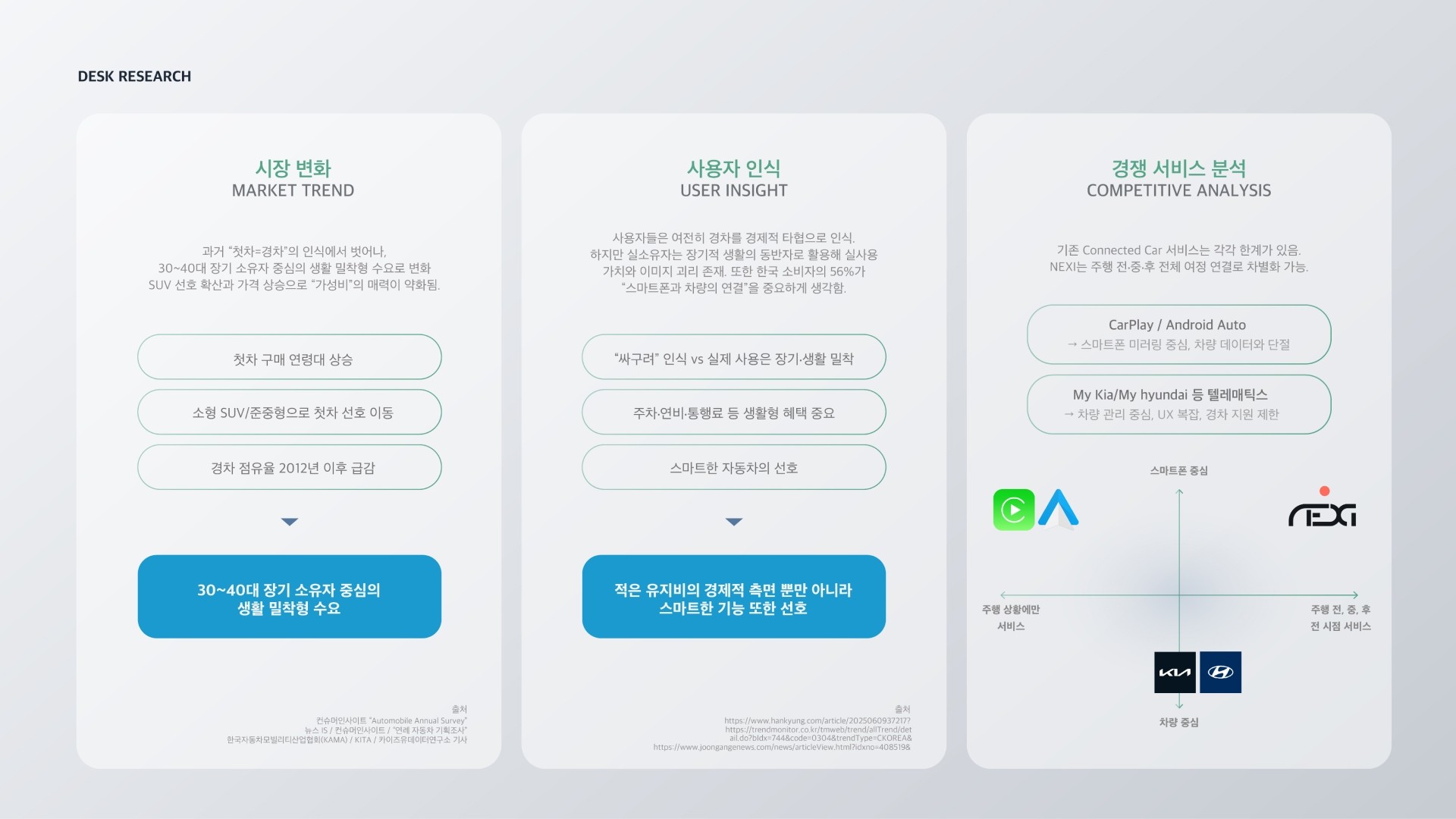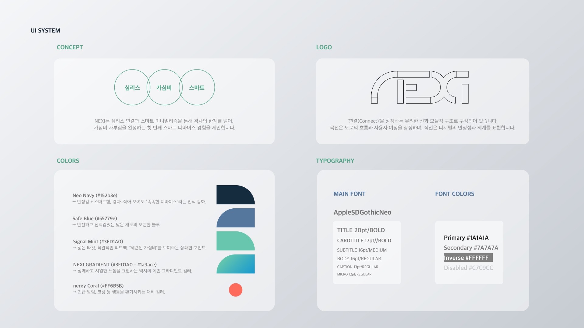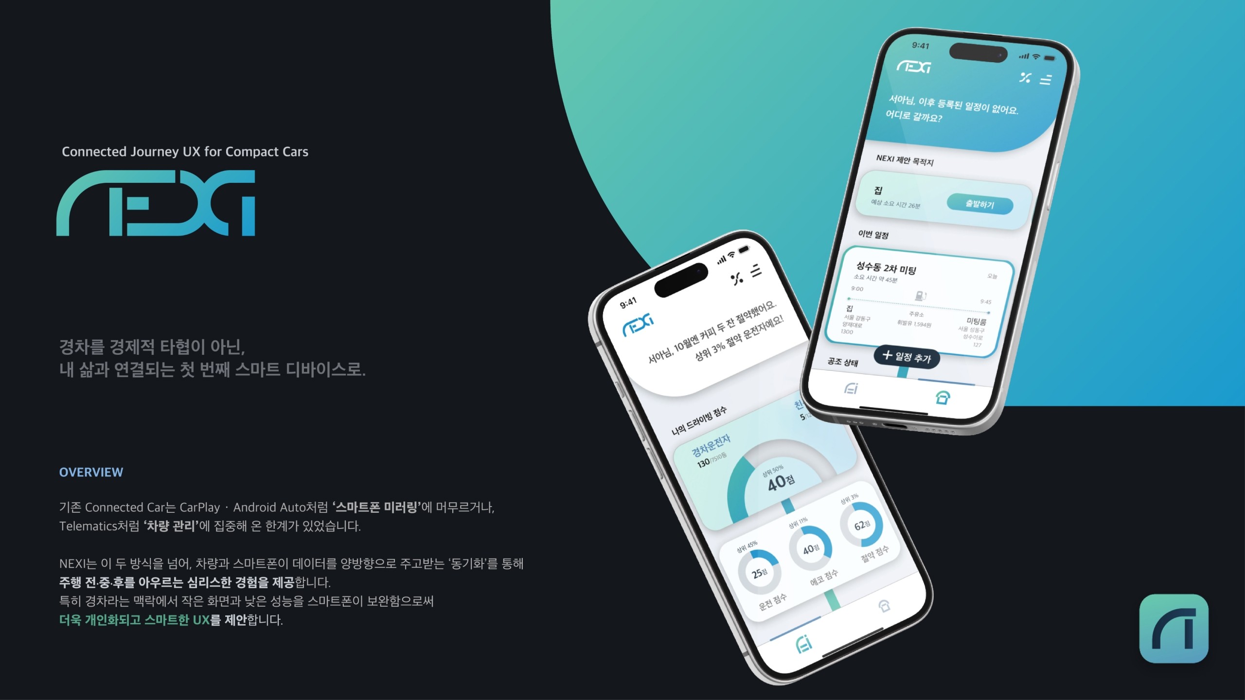 NEXI는 경차를 경제적 타협이 아니라, ‘바퀴 달린 첫 번째 스마트 디바이스’로 경험하게 하는 양방향 커넥티드 UX입니다. 기존 인포테인먼트가 차량 중심으로 설계됐다면, NEXI는 차량은 뷰어, 스마트폰은 컨트롤러로 역할을 재정의합니다. 주행 전 일정 제안부터 주행 중 안전 코칭, 주행 후 라스트마일 안내와 라이프로그까지 이어지는 끊김 없는 여정을 통해, 경차는 더 이상 타협의 결과가 아닌 나의 라이프스타일을 표현하는 스마트한 선택이 됩니다.