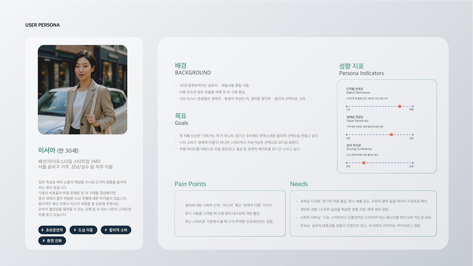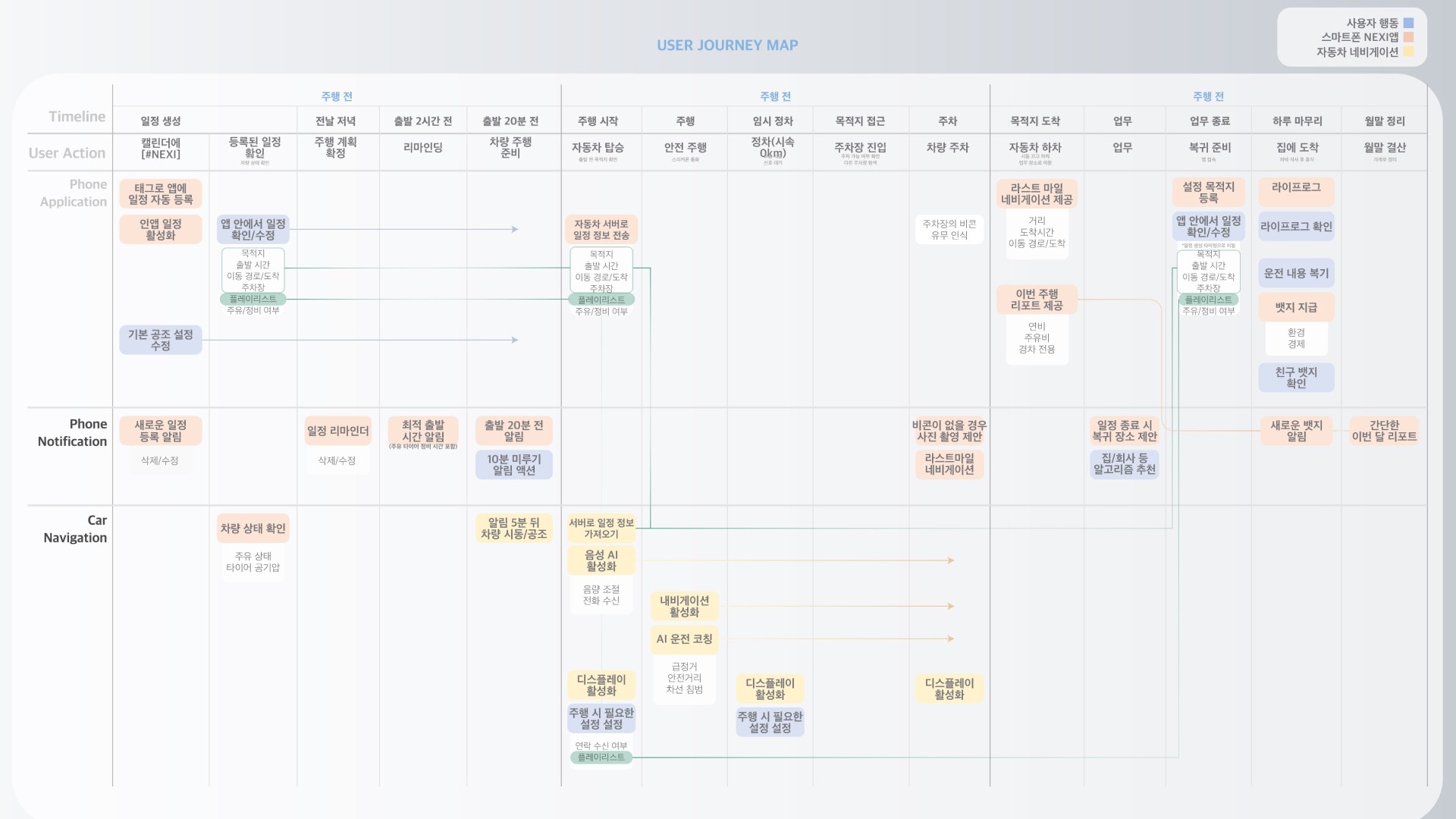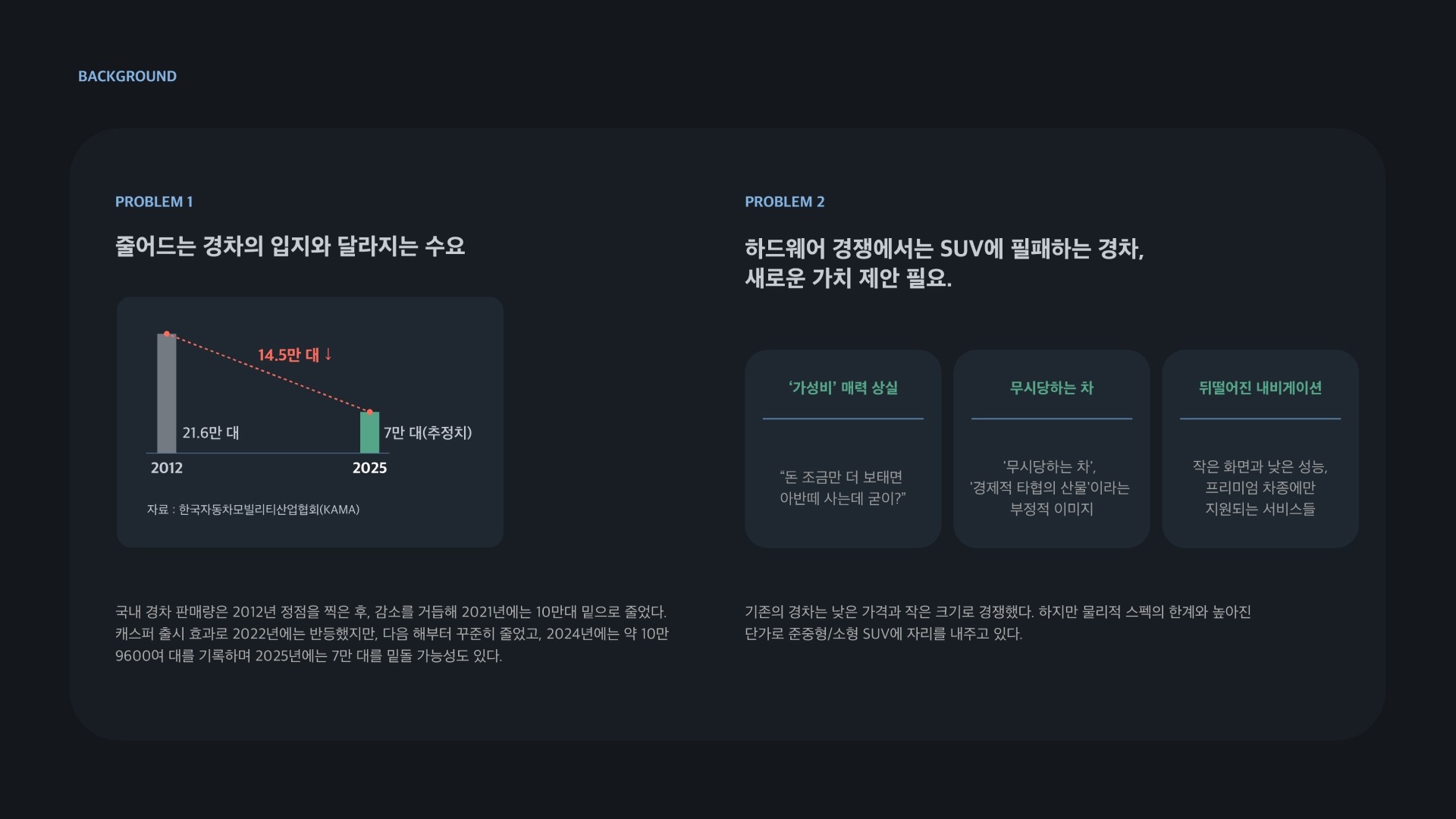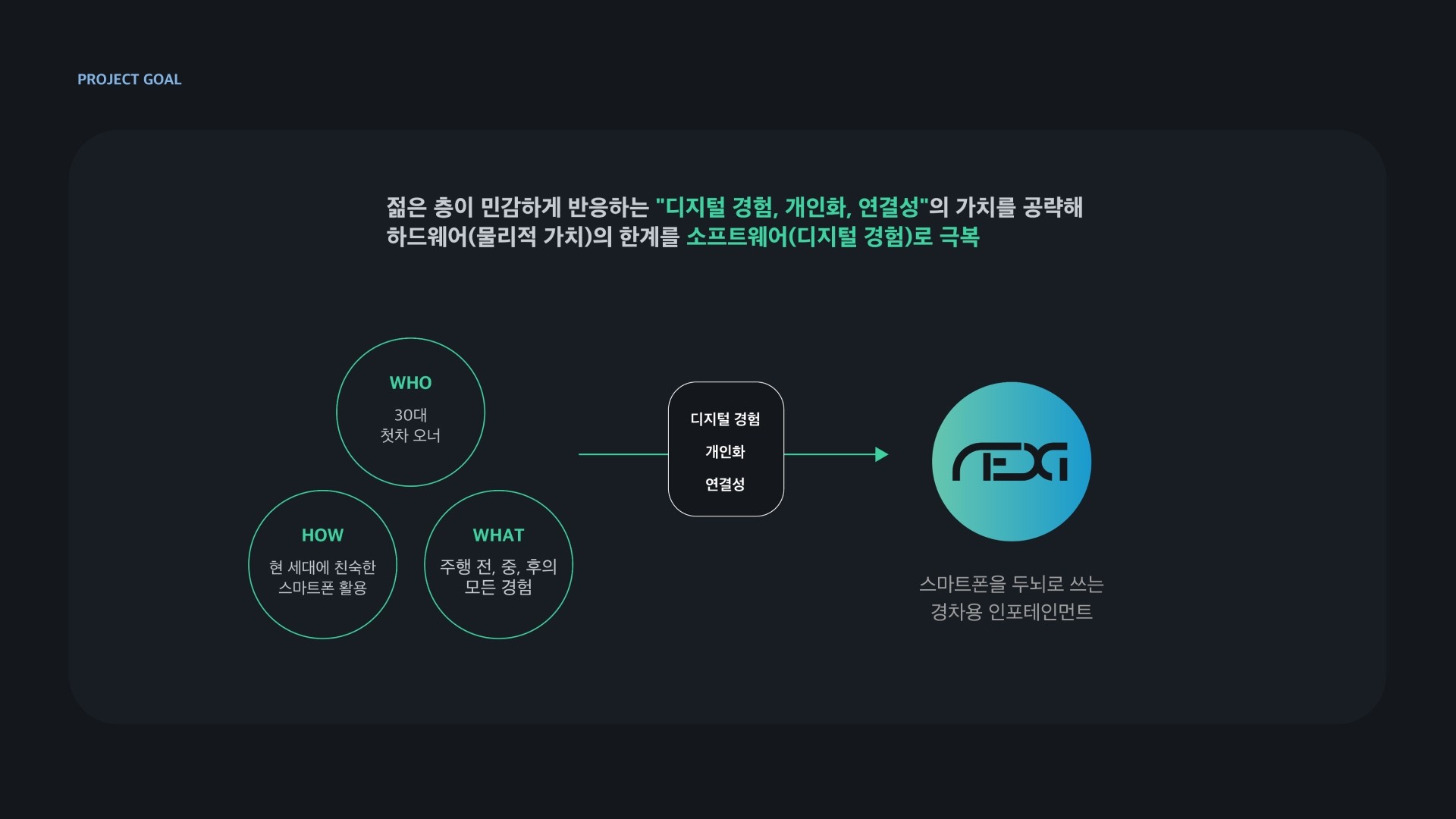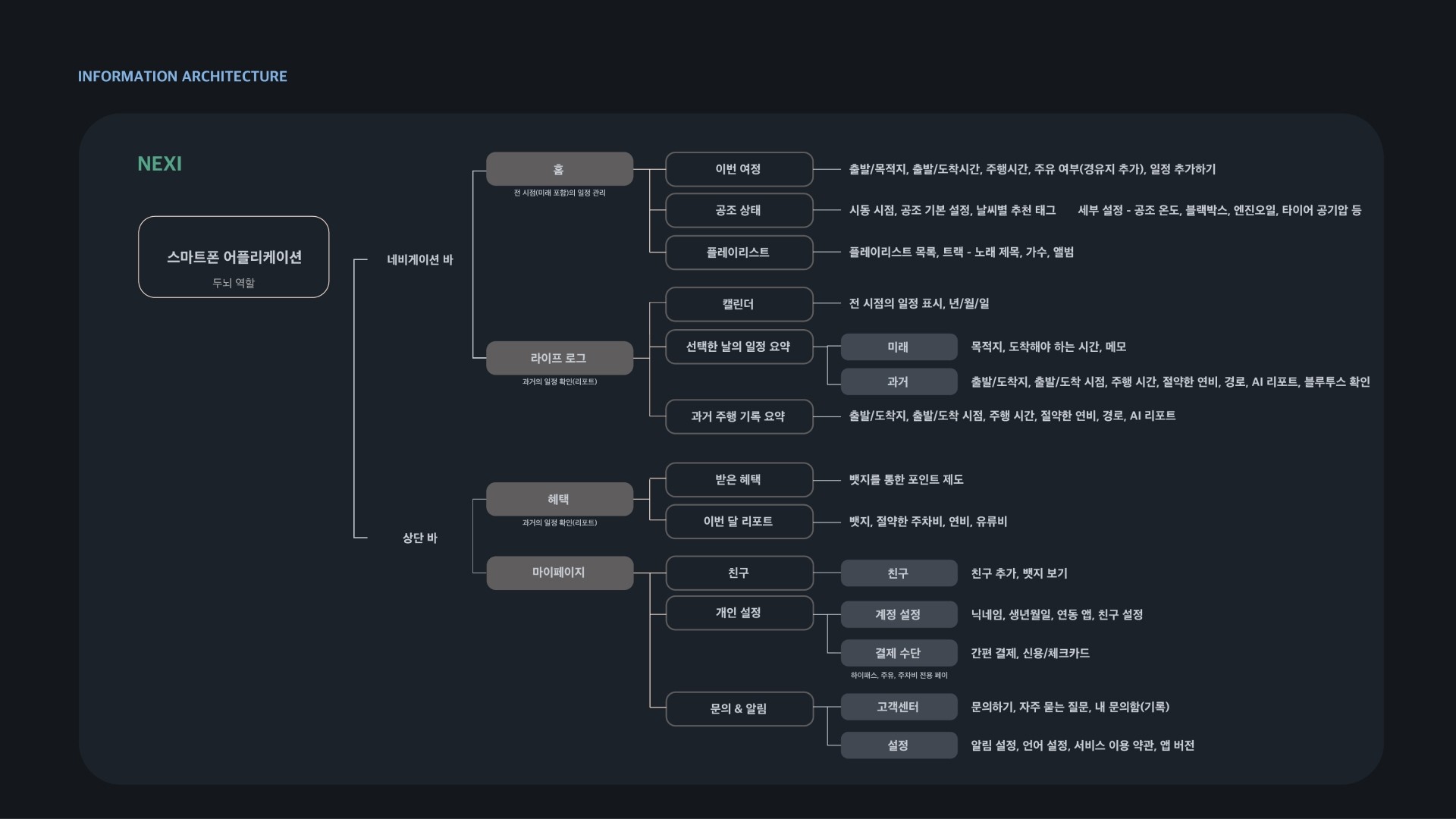 NEXI는 경차를 경제적 타협이 아니라, ‘바퀴 달린 첫 번째 스마트 디바이스’로 경험하게 하는 양방향 커넥티드 UX입니다. 기존 인포테인먼트가 차량 중심으로 설계됐다면, NEXI는 차량은 뷰어, 스마트폰은 컨트롤러로 역할을 재정의합니다. 주행 전 일정 제안부터 주행 중 안전 코칭, 주행 후 라스트마일 안내와 라이프로그까지 이어지는 끊김 없는 여정을 통해, 경차는 더 이상 타협의 결과가 아닌 나의 라이프스타일을 표현하는 스마트한 선택이 됩니다.