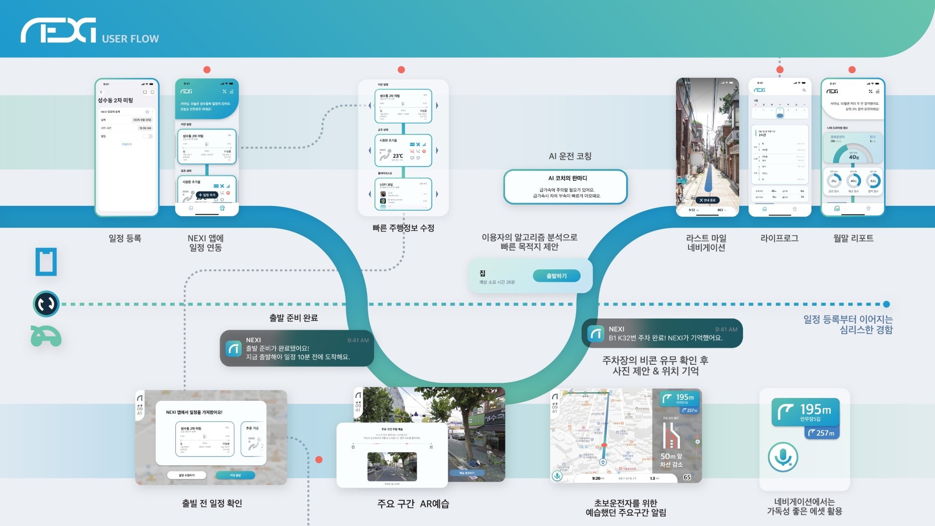 NEXI is an interactive connected UX that redefines compact cars not as an economic compromise, but as “the first smart device on wheels.” While traditional infotainment systems are designed around the vehicle itself, NEXI redefines the roles — the car becomes a viewer, and the smartphone acts as the controller. From pre-drive scheduling suggestions to real-time driving safety coaching, and post-drive last-mile guidance with lifelog tracking, NEXI creates a seamless journey where compact cars become not a compromise, but a smart expression of one’s lifestyle.