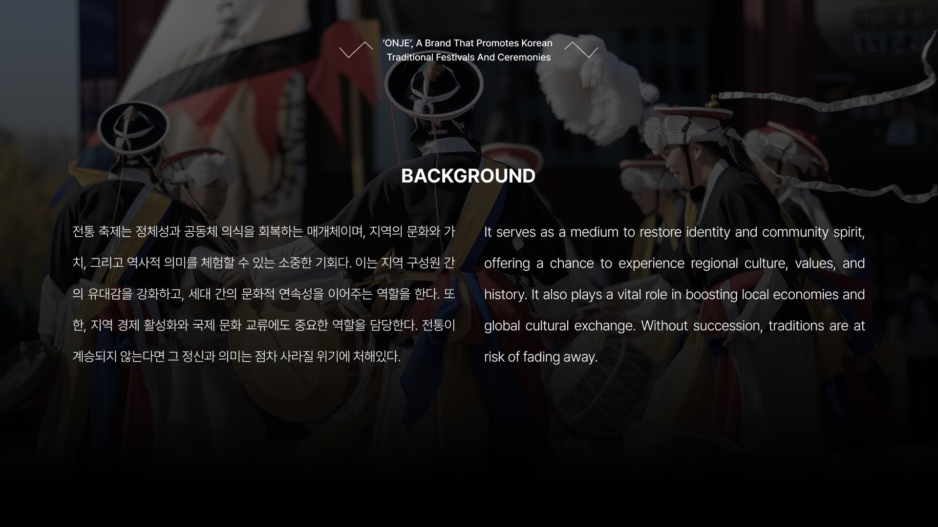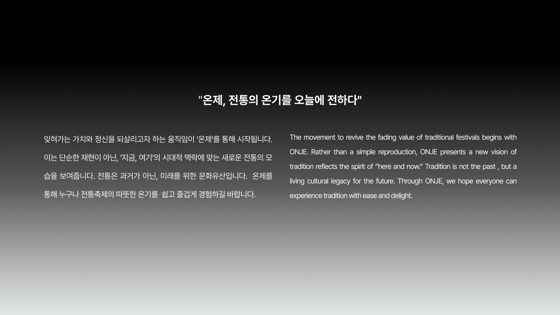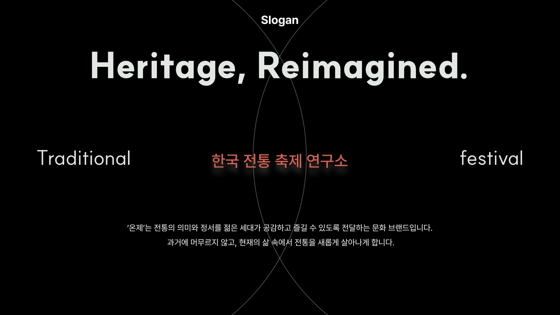온제(ONJE) 는 한국 전통 축제를 현대적인 시각으로 재해석한 문화 브랜딩 프로젝트입니다. 잊혀가는 전통을 감각적으로 기록하고, 젊은 세대가 일상 속에서 자연스럽게 경험할 수 있도록 기획했습니다. ‘Heritage, Reimagined’라는 슬로건 아래, 전통과 오늘을 잇는 새로운 시각 언어를 제안합니다. 온제는 과거의 유산을 오늘의 감성으로 이어, 전통이 현재 속에서 다시 숨 쉬는 순간을 만듭니다.