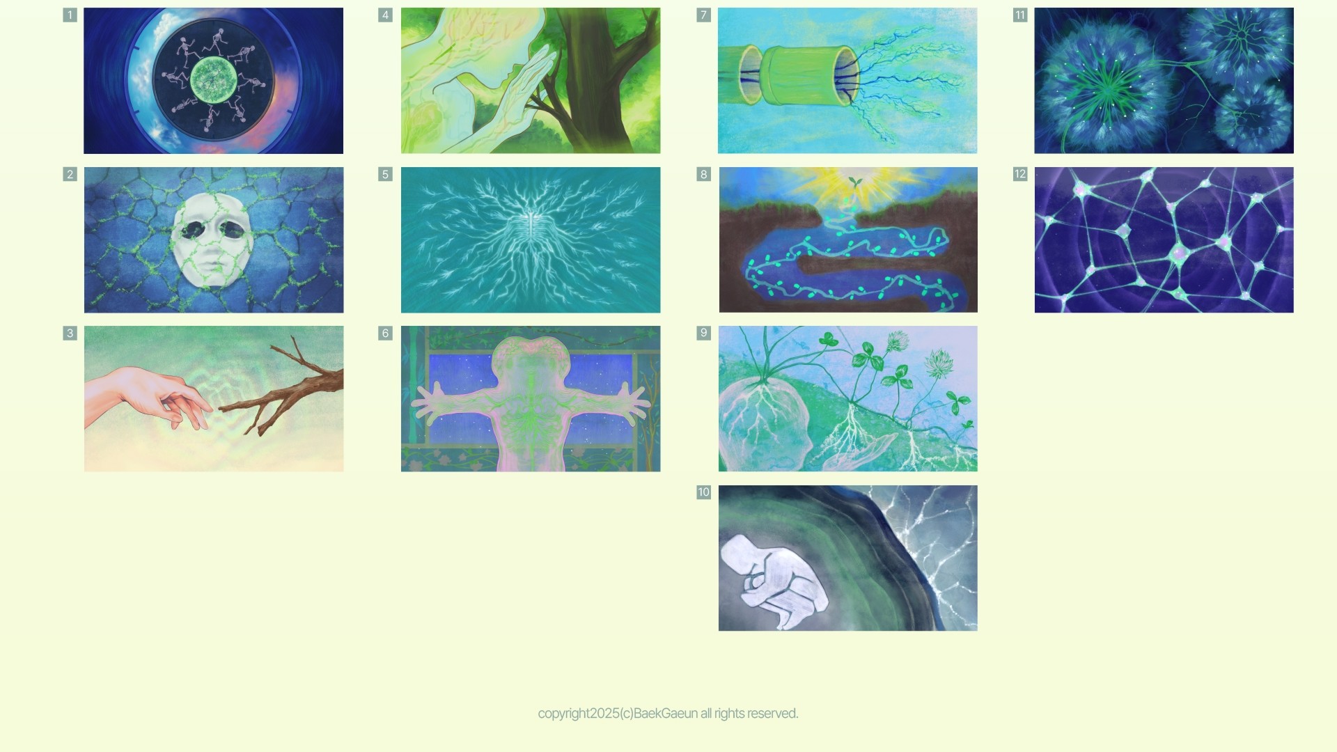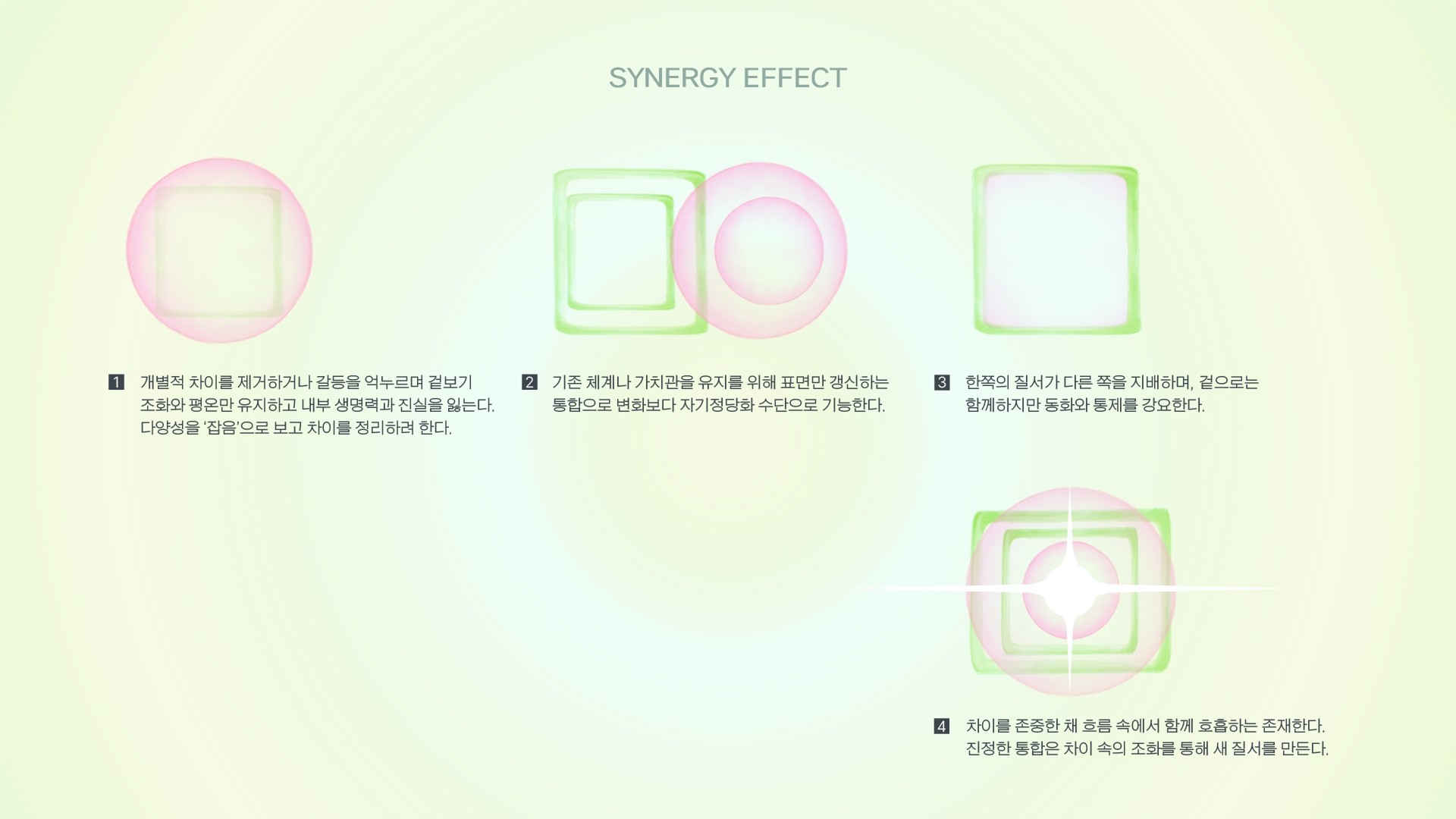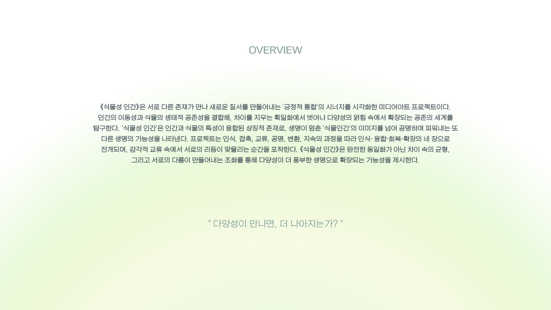 진정한 시너지는 서로의 차이가 얽혀 새로운 질서를 만들어내는 ‘긍정적 통합’에서 비롯됩니다. 인간의 이동성과 식물의 공존성을 품은 ‘식물성 인간’은, 생명이 멈춘 ‘식물인간’의 이미지를 넘어 서로 다른 존재가 공명하며 피워내는 새로운 생명의 가능성을 상징합니다. 인식에서 융합, 회복, 확장으로 이어지는 서사는 획일화가 아닌 ‘차이 속의 균형’을 통해 확장된 공존의 세계가 형성되는 과정을 보여줍니다. 《식물성 인간》은 이러한 인식의 변화를 시각적으로 구현하며, 긍정적 통합의 시너지로 더욱 풍부해지는 또 다른 세계를 제안합니다.