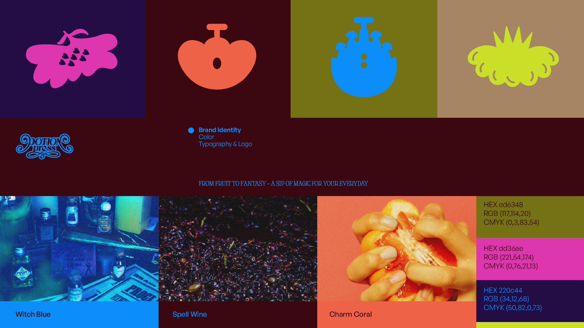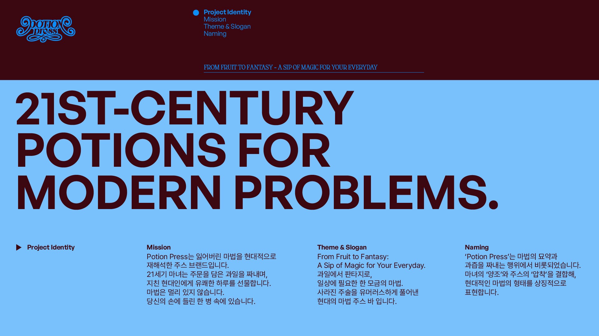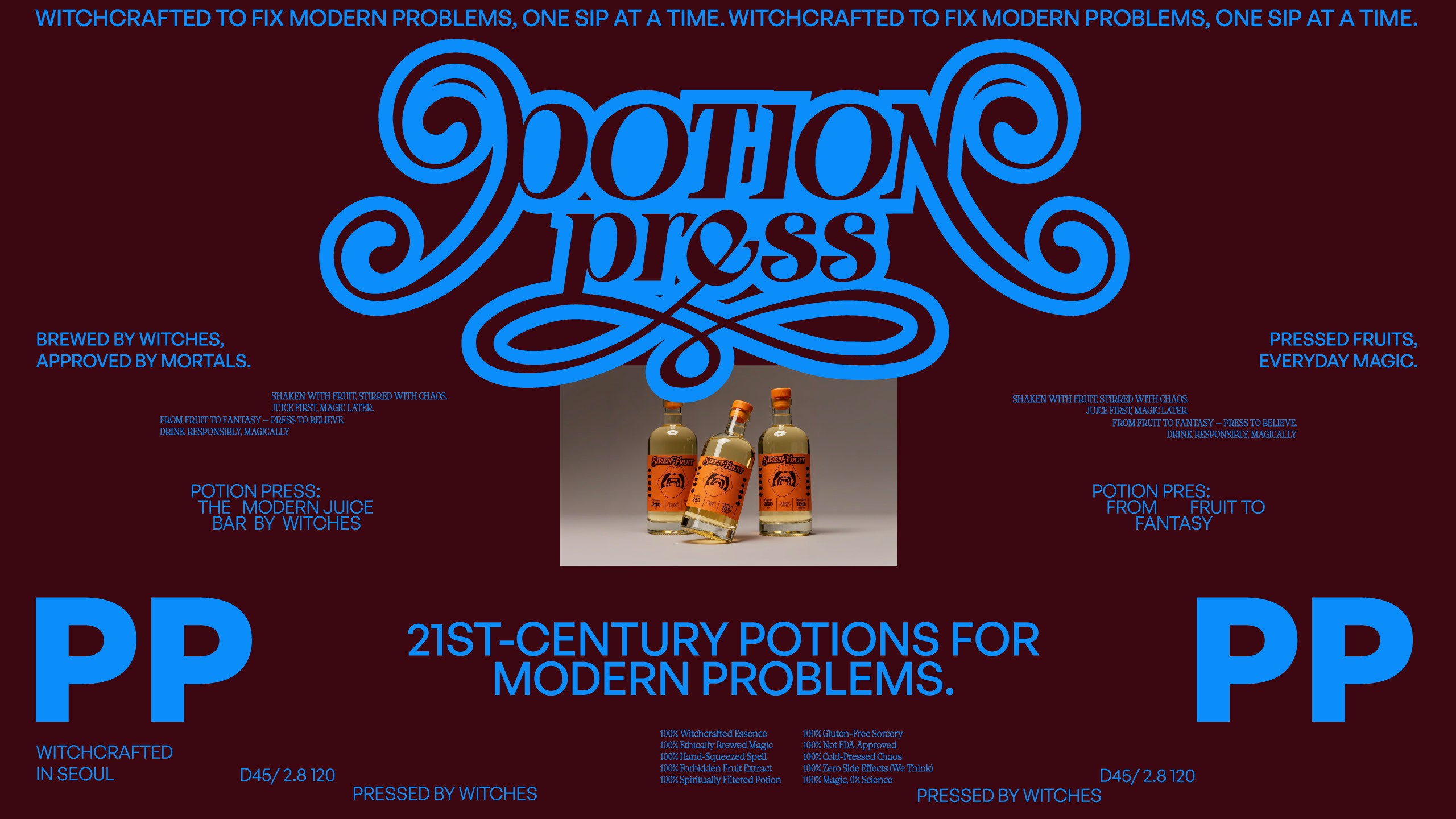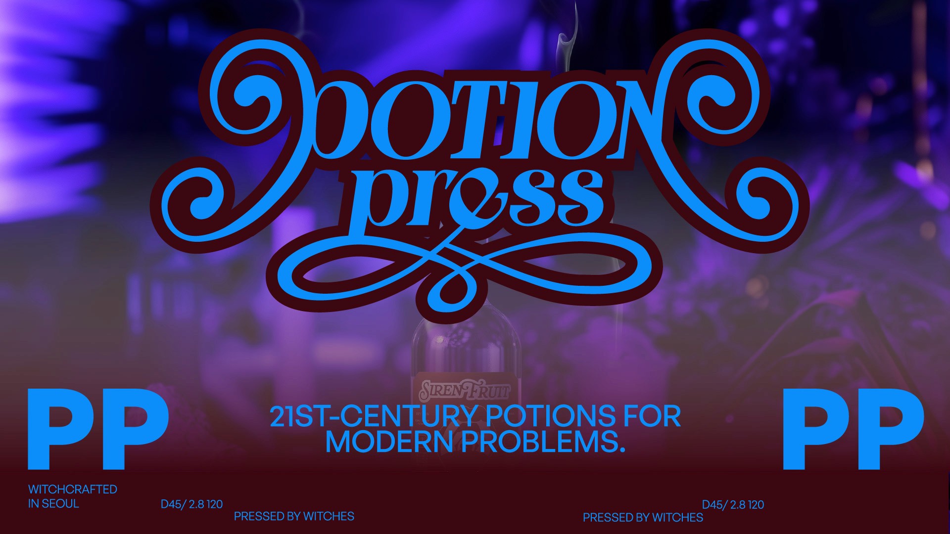 바쁜 현대인들은 어느 순간, 마법 같은 하루를 꿈꿉니다. 우리 곁에서 마법은 사라지지 않았습니다. 다만 형태를 바꿨을 뿐이죠. 21세기의 마녀는 사람을 쥐로 바꾸는 대신, 불면을 숙면으로 바꾸기로 했습니다. Potion Press는 금지된 마법을 현대적으로 재해석한 주스 브랜드로, 한 병의 마법이 당신의 하루를 조금 더 유쾌하게 만듭니다. 지친 일상에 필요한 건 에너지 드링크가 아니라 한 모금의 마법일지도 모릅니다.