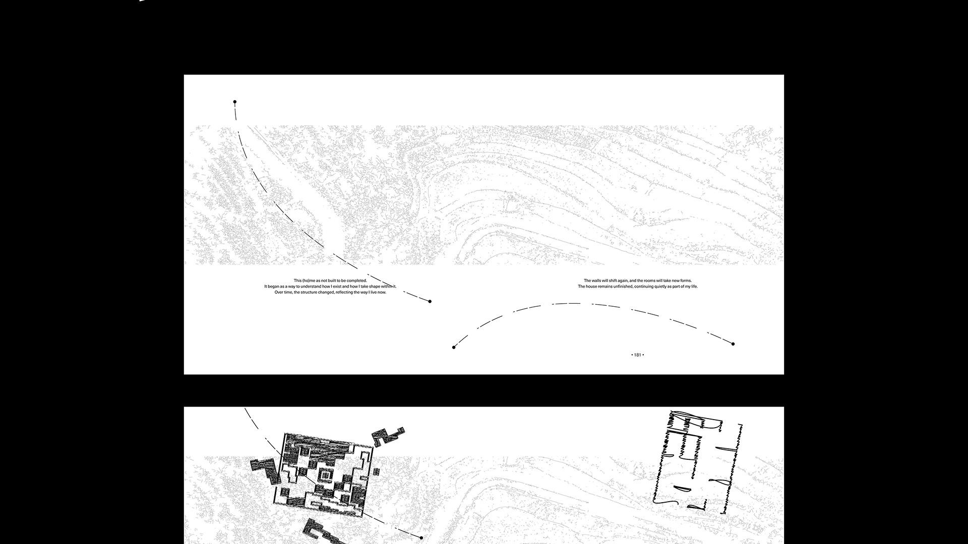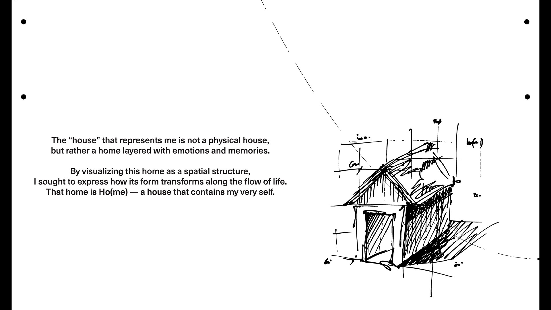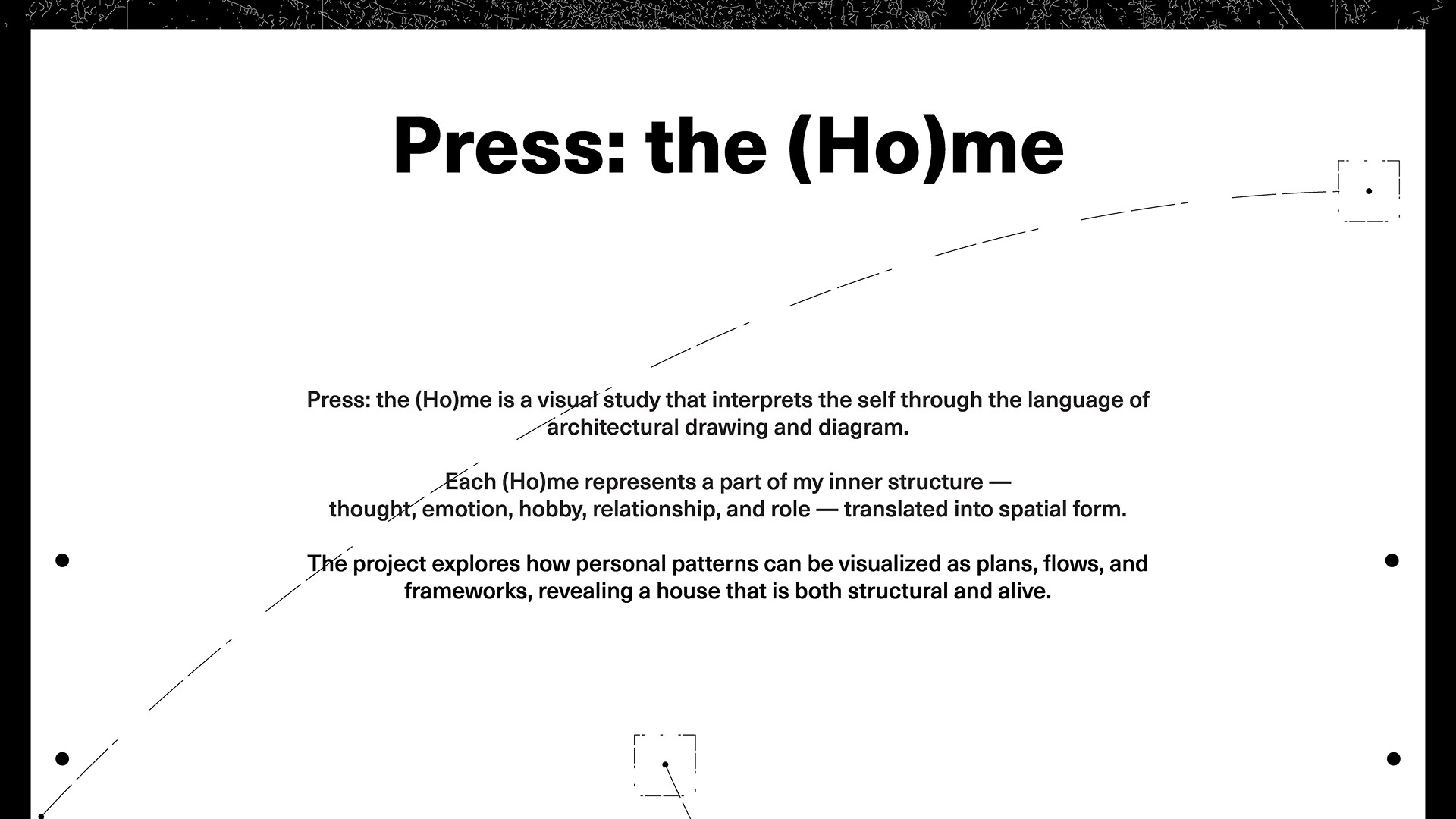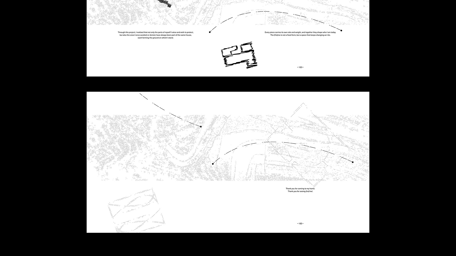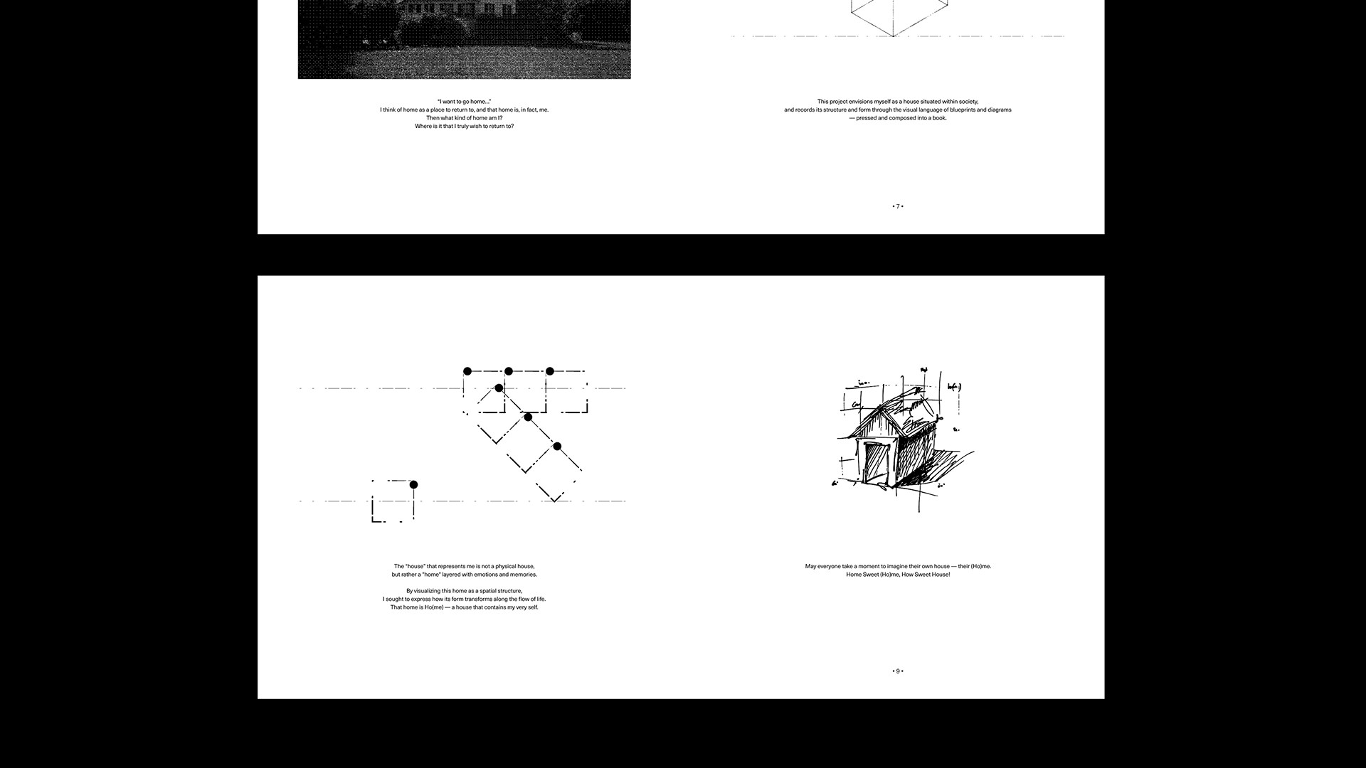 “I want to go home.” I think of home as a place to return to — and that home is, in fact, myself. This project imagines the self as a house within society, recorded through the visual language of architectural drawings and diagrams. Each line traces how identity builds and reshapes its own structure. Pressed and compiled into a book, it becomes a record of a house that is never complete — constantly expanding, shifting, and rebuilding over time.