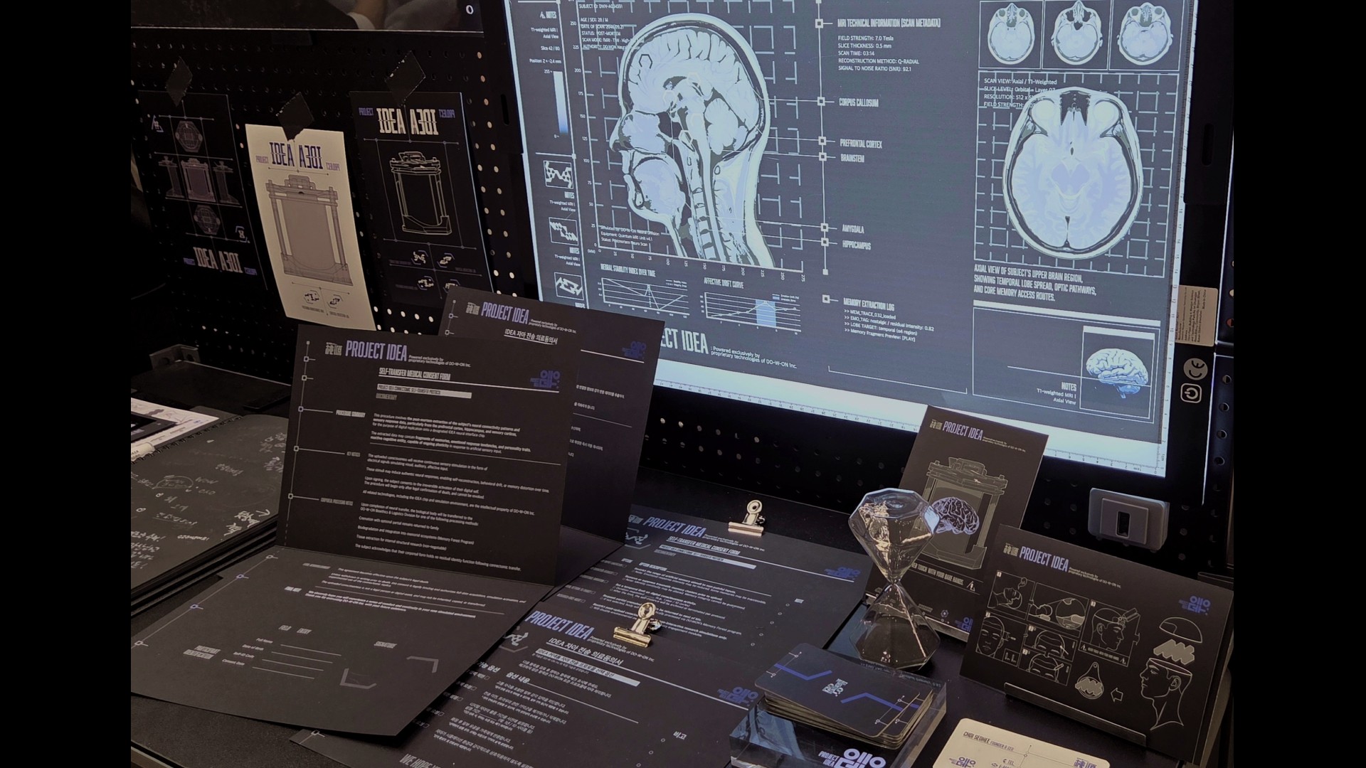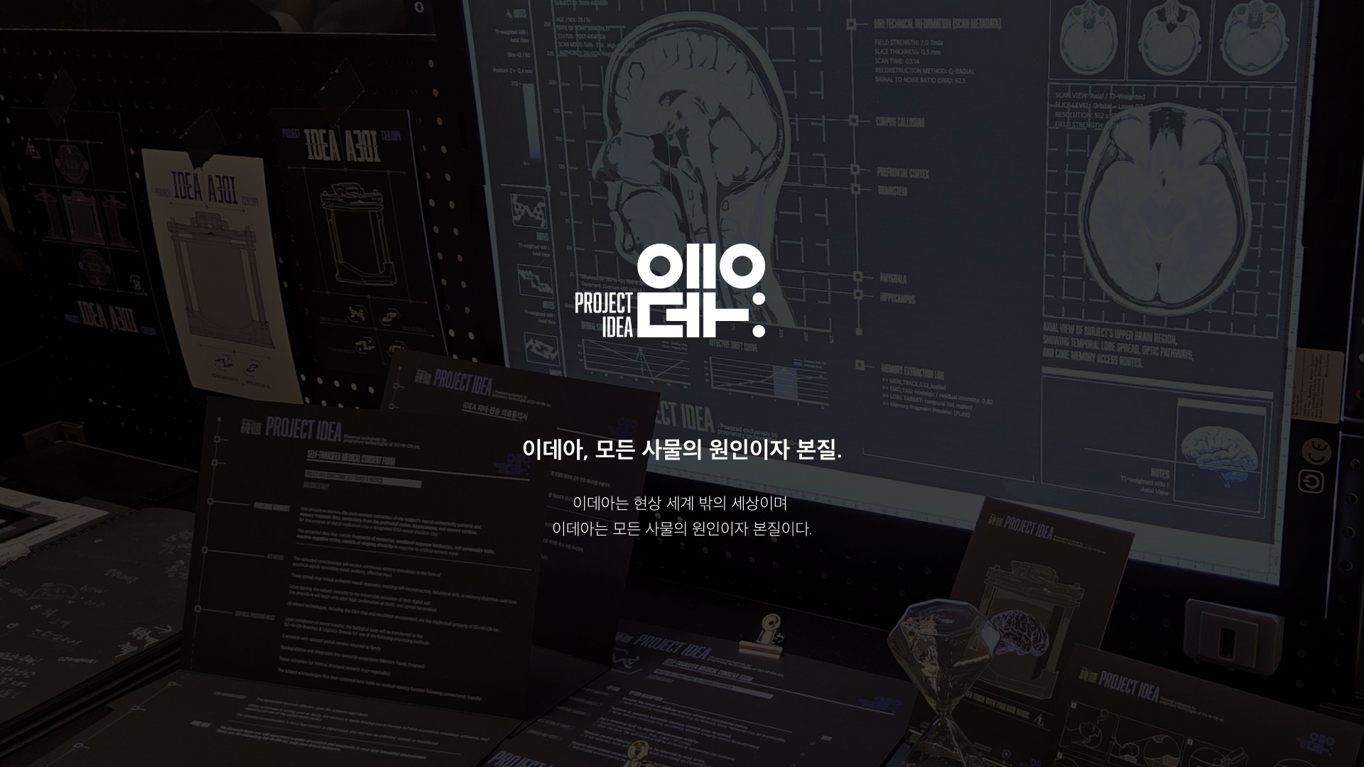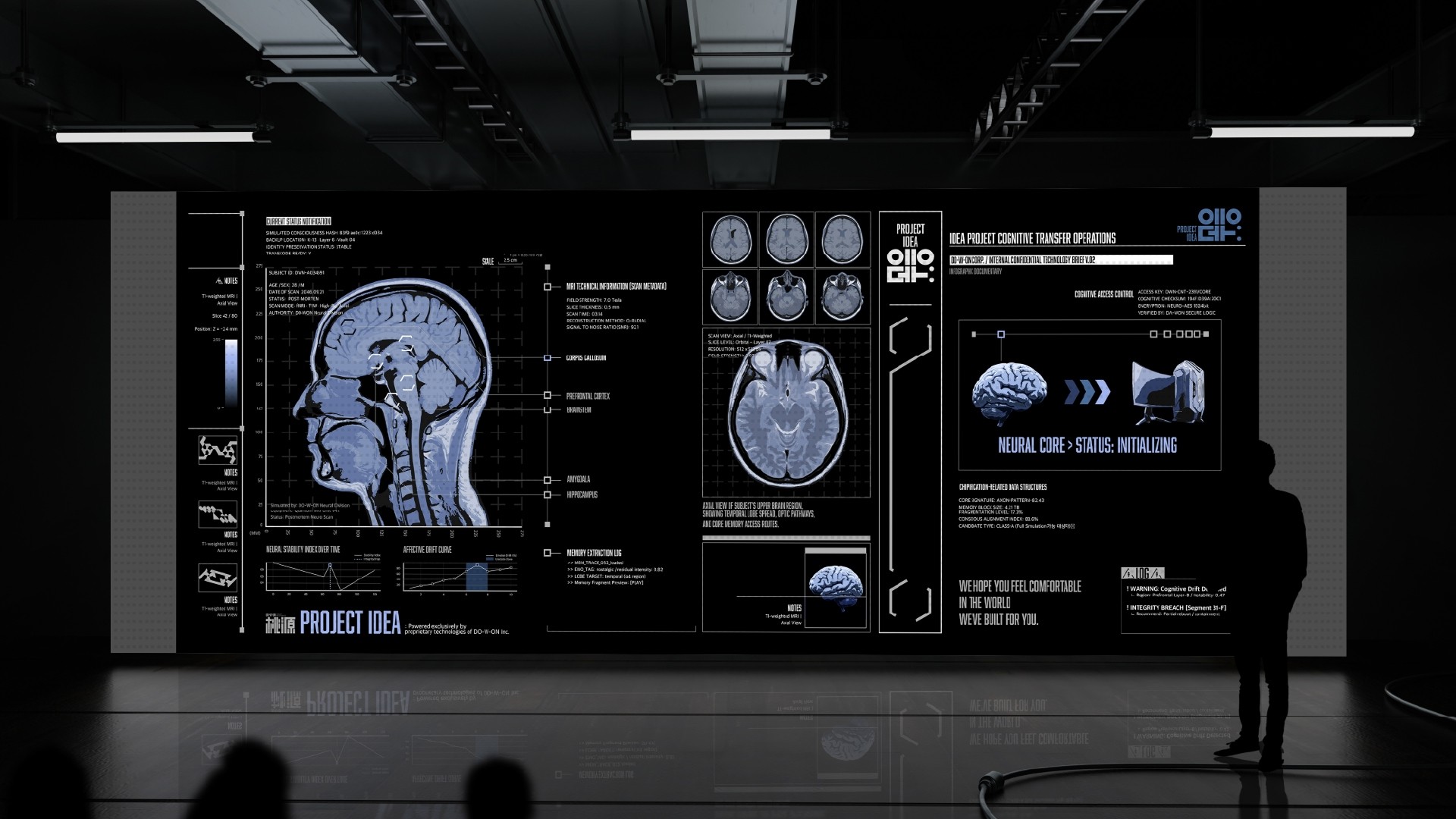 The fictional corporation “DO-W-ON Inc.”, which does not see the disappearance of the body as the end of existence, presents <PROJECT IDEA>, a self-simulation service set for commercialization in 2046. At the threshold of death, an individual’s consciousness and memories are converted into data, and unnecessary traumas are “refined” to build a perfect paradise. Grounded in the “brain in a vat” philosophy, the project visualizes a dystopian world where the line between reality and virtuality collapses — asking viewers what it truly means to exist and be real.